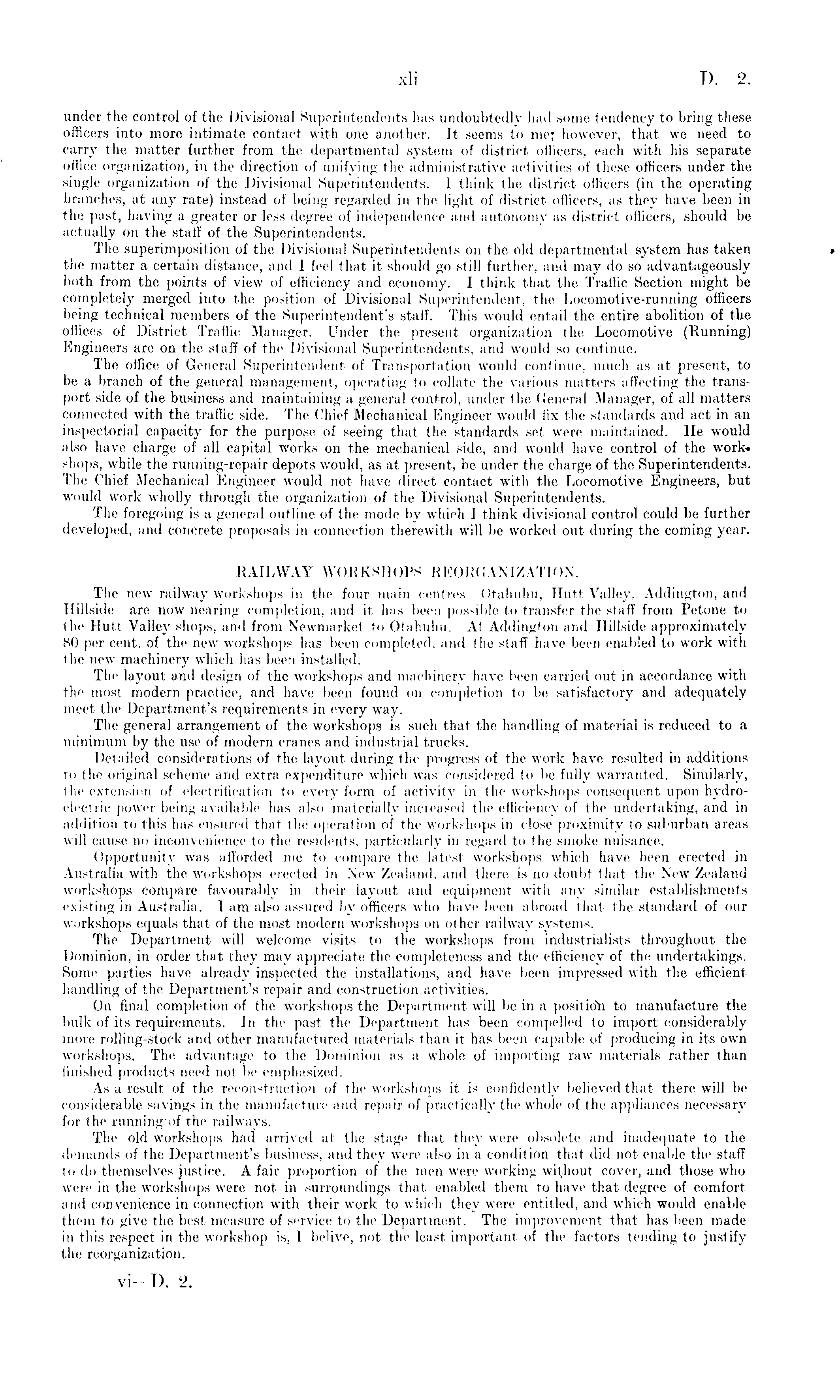 under the control of the Divisional Superintendents has undoubtedly had some tendency to bring these officers into more intimate contact with one another. It seems to me; however, that we need to carry the matter further from the departmental system of district officers, each with his separate office organization, in the direction of unifying the administrative activities of these officers under the single organization of the Divisional Superintendents. I think the district officers (in the operating branches, at any rate) instead of being regarded in the light of district officers, as they have been in the past, having a greater or less degree of independence and autonomy as district officers, should be actually on the staff of the Superintendents. The superimposition of the Divisional Superintendents 011 the old departmental system has taken the matter a certain distance, and I feel that it should go still further, and may do so advantageously both from the points of view of efficiency and economy. I think that the Traffic Section might be completely merged into the position of Divisional Superintendent, the Locomotive-running officers being technical members of the Superintendent's staff. This would entail the entire abolition of the offices of District Traffic Manager. Under the present organization the Locomotive (Running) Engineers are on the staff of the Divisional Superintendents, and would so continue. The office of General Superintendent of Transportation would continue, much as at present, to be a branch of the general management, operating to collate the various matters affecting the transport side of the business and maintaining a general control, under the General Manager, of all matters connected with the traffic side. The Chief Mechanical Engineer would fix the standards and act in an inspectorial capacity for the purpose of seeing that the standards set were maintained. He would also have charge of all capital works on the mechanical side, and would have control of the work* shops, while the running-repair depots would, as at present, be under the charge of the Superintendents. The Chief Mechanical Engineer would not have direct contact with the Locomotive Engineers, but would work wholly through the organization of the Divisional Superintendents. The foregoing is a general outline of the mode by which I think divisional control could be further developed, and concrete proposals in connection therewith will be worked out during the coming year. RAILWAY WORKSHOPS REORGANIZATION. The new railway workshops in the four main centres —Otahuhu, Hutt Valley, Addington, and Hillside—are now nearing completion, and it has been possible to transfer the staff from Petone to the Hutt Valley shops, and from Newmarket to Otahuhu. At Addington and Hillside approximately 80 per cent, of the new workshops has been completed, and the staff have been enabled to work with the new machinery which has been installed. The layout and design of the workshops and machinery have been carried out in accordance with the most modern practice, and have been found on completion to be satisfactory and adequately meet the Department's requirements in every way. The general arrangement of the workshops is such that the handling of material is reduced to a minimum by the use of modern cranes and industrial trucks. Detailed considerations of the layout during the progress of the work have resulted in additions to the original scheme and extra expenditure which was considered to be fully warranted. Similarly, the extension of electrification to every form of activity in the workshops consequent upon hydroelectric power being available has also materially increased the efficiency of the undertaking, and in addition to this has ensured that the operation of the workshops in close proximity to suburban areas will cause no inconvenience to the residents, particularly in regard to the smoke nuisance. Opportunity was afforded me to compare the latest workshops which have been erected in Australia with the workshops erected in New Zealand, and there is no doubt that the New Zealand workshops compare favourably in their layout and equipment with a,nv similar establishments existing in Australia. lam also assured by officers who have been abroad that the standard of our workshops equals that of the most modern workshops on other railway systems. The Department will welcome visits to the workshops from industrialists throughout the Dominion, in order that they may appreciate the completeness and the efficiency of the undertakings. Some parties have already inspected the installations, and have been impressed with the efficient handling of the Department's repair and construction activities. Oil final completion of the workshops the Department will be in a position to manufacture the bulk of its requirements. In the past the Department has been compelled to import considerably more rolling-stock and other manufactured materials than it has been capable of producing in its own workshops. The advantage to the Dominion as a whole of importing raw materials rather than finished products need not be emphasized. As a result of the reconstruction of the workshops it is confidently believed that there will be considerable savings in the manufacture and repair of practically the whole of the appliances necessary for the running of the railways. The old workshops had arrived at the stage that they were obsolete and inadequate to the demands of the Department's business, and they were also in a condition that did not enable the staff to do themselves justice. A fair proportion of the men were working without cover, and those who were in the workshops were not in surroundings that enabled them to have that degree of comfort and convenience in connection with their work to which they were entitled, and which would enable them to give the best measure of service to the Department. The improvement that has been made in this respec