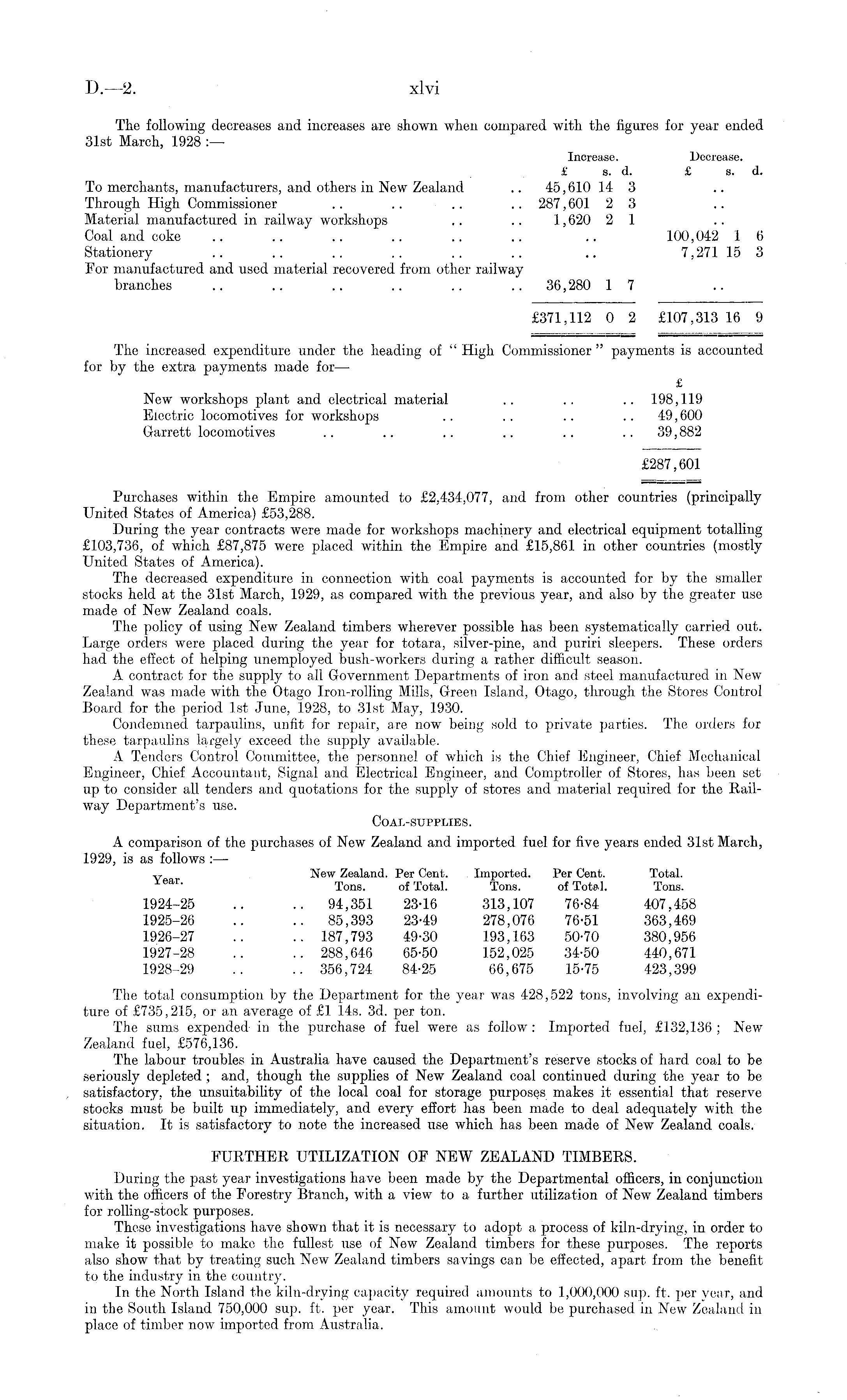 The following decreases and increases are shown when compared with the figures for year ended 31st March, 1928 : —- Increase. Decrease. £ s. d. £ s. d. To merchants, manufacturers, and others in New Zealand .. 45,610 14 3 Through High Commissioner .. .. .. .. 287,601 2 3 Material manufactured in railway workshops .. .. 1,620 2 1 Coal and coke .. .. .. .. .. .. .. 100,042 1 6 Stationery .. .. .. .. .. .. .. 7,271 15 3 For manufactured and used material recovered from other railway branches .. .. .. .. .. 36,280 17 £371,112 0 2 £107,313 16 9 The increased expenditure under the heading of " High Commissioner " payments is accounted for by the extra payments made for— £ New workshops plant and electrical material .. .. .. 198,119 Electric locomotives for workshops .. .. .. .. 49,600 Garrett locomotives .. .. .. .. .. 39,882 £287,601 Purchases within the Empire amounted to £2,434,077, and from other countries (principally United States of America) £53,288. During the year contracts were made for workshops machinery and electrical equipment totalling £103,736, of which £87,875 were placed within the Empire and £15,861 in other countries (mostly United States of America). The decreased expenditure in connection with coal payments is accounted for by the smaller stocks held at the 31st March, 1929, as compared with the previous year, and also by the greater use made of New Zealand coals. The policy of using New Zealand timbers wherever possible has been systematically carried out. Large orders were placed during the year for totara, silver-pine, and puriri sleepers. These orders had the effect of helping unemployed bush-workers during a rather difficult season. A contract for the supply to all Government Departments of iron and steel manufactured in New Zealand was made with the Otago Iron-rolling Mills, Green Island, Otago, through the Stores Control Board for the period Ist June, 1928, to 31st May, 1930. Condemned tarpaulins, unfit for repair, are now being sold to private parties. The orders for these tarpaulins largely exceed the supply available. A Tenders Control Committee, the personnel of which is the Chief Engineer, Chief Mechanical Engineer, Chief Accountant, Signal and Electrical Engineer, and Comptroller of Stores, has been set up to consider all tenders and quotations for the supply of stores and material required for the Kailway Department's use. Coal-supplies. A comparison of the purchases of New Zealand and imported fuel for five years ended 31st March, 1929, is as follows : — v New Zealand. Per Cent. Imported. Per Cent. Total. Tons. of Total. Tons. of Total. Tons. 1924-25 .. .. 94,351 23-16 313,107 76-84 407.458 1925-26 .. .. 85,393 23-49 278,076 76-51 363,469 1926-27 .. .. 187,793 49-30 193,163 50-70 380,956 1927-28 .. .. 288,646 65-50 152,025 34-50 440,671 1928-29 .. .. 356,724 84-25 66,675 15-75 423,399 The total consumption by the Department for the year was 428,522 tons, involving an expenditure of £735,215, or an average of £1 14s. 3d. per ton. The sums expended in the purchase of fuel were as follow : Imported fuel, £132,136 ; New Zealand fuel, £576,136. The labour troubles in Australia have caused the Department's reserve stocks of hard coal to be seriously depleted ; and, though the supplies of New Zealand coal continued during the year to be satisfactory, the unsuitability of the local coal for storage purposes makes it essential that reserve stocks must be built up immediately, and every effort has been made to deal adequately with the situation. It is satisfactory to note the increased use which has been made of New Zealand coals. FURTHER UTILIZATION OF NEW ZEALAND TIMBERS. During the past year investigations have been made by the Departmental officers, in conjunction with the officers of the Forestry Btanch, with a view to a further utilization of New Zealand timbers for rolling-stock purposes. These investigations have shown that it is necessary to adopt a process of kiln-drying, in order to make it possible to make the fullest use of New Zealand timbers for these purposes. The reports also show that by treating such New Zealand timbers savings can be effected, apart from the benefit to the industry in the country. In the North Island the kiln-drying capacity required amounts to 1,000,000 sup. ft. per year, and in the South Island 750,000 sup. ft. per year. This amount would be purchased in New Zealand in place of timber now imported from Australia.