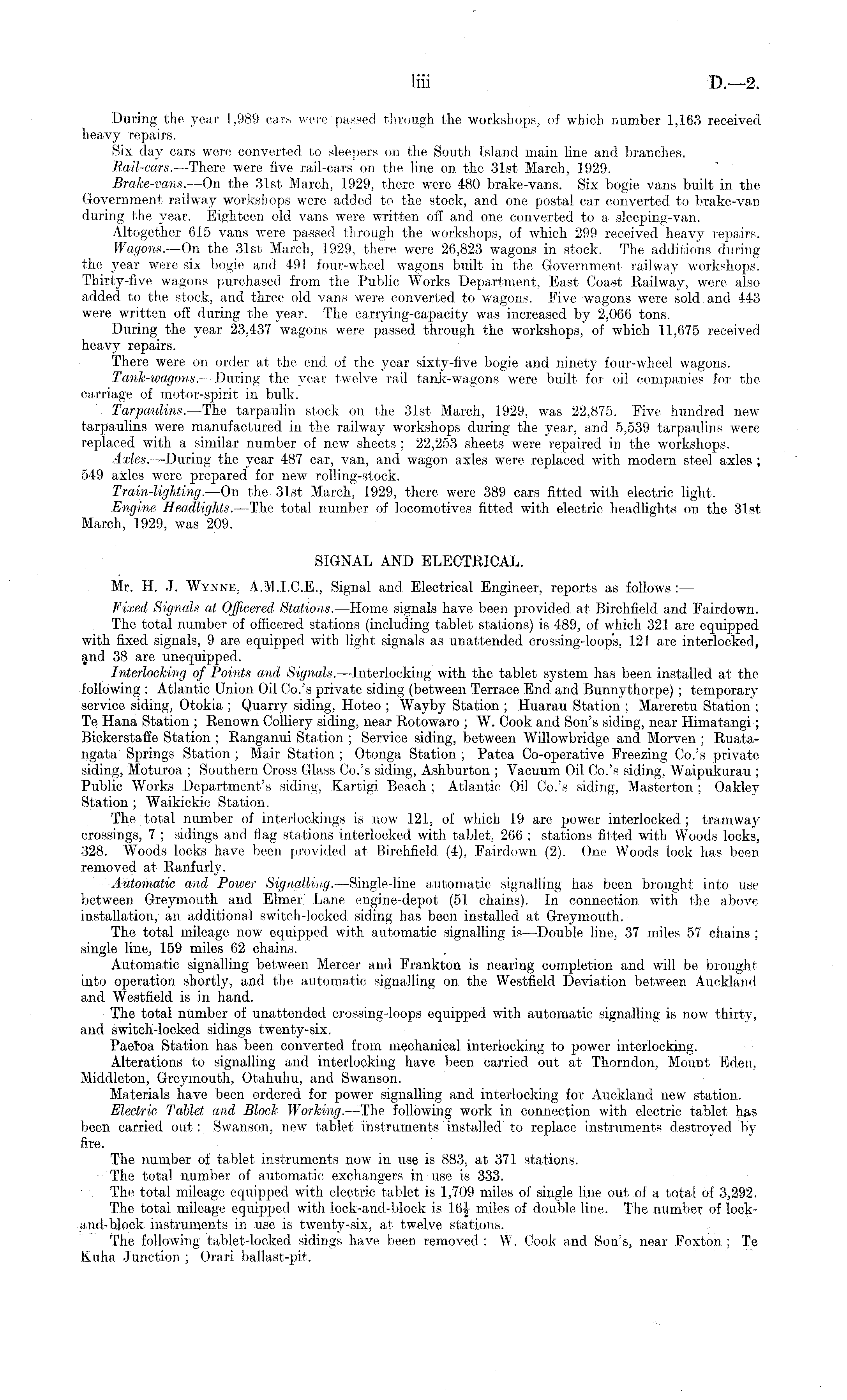 During the year 1,989 cars were passed through the workshops, of which number 1,163 received heavy repairs. Six day cars were converted to sleepers on the South Island main line and branches. Bail-cars. —There were five rail-cars on the line on the 31st March, 1929. Brake-vans.—On the 31st March, 1929, there were 480 brake-vans. Six bogie vans built in the Government railway workshops were added to the stock, and one postal car converted to brake-van. during the year. Eighteen old vans were written off and one converted to a sleeping-van. Altogether 615 vans were passed through the workshops, of which 299 received heavy repairs. Wagons.—On the 31st March, 1929, there were 26,823 wagons in stock. The additions during the year were six bogie and 49i. four-wheel wagons built in the Government railway workshops. Thirty-five wagons purchased from the Public Works Department, East Coast Railway, were also added to the stock, and three old vans were converted to wagons. Five wagons were sold and 443 were written off during the year. The carrying-capacity was increased by 2,066 tons. During the year 23,437 wagons were passed through the workshops, of which 11,675 received heavy repairs. There were on order at the end of the year sixty-five bogie and ninety four-wheel wagons. Tank-wagons.—During the year twelve rail tank-wagons were built for oil companies for the carriage of motor-spirit in bulk. Tarpaulins.—The tarpaulin stock on the 31st March, 1929, was 22,875. Five hundred new tarpaulins were manufactured in the railway workshops during the year, and 5,539 tarpaulins were replaced with a similar number of new sheets ; 22,253 sheets were repaired in the workshops. Axles.—During the year 487 car, van, and wagon axles were replaced with modern steel axles ; 549 axles were prepared for new rolling-stock. Train-lighting.—On the 31st March, 1929, there were 389 cars fitted with electric light. Engine Headlights. —The total number of locomotives fitted with electric headlights on the 31st March, 1929, was 209. SIGNAL AND ELECTRICAL. Mr. H. J. Wynne, A.M.1.C.E., Signal and Electrical Engineer, reports as follows Fixed Signals at Officered Stations. —Home signals have been provided at Birchfield and Fairdown. The total number of officered stations (including tablet stations) is 489, of which 321 are equipped with fixed signals, 9 are equipped with light signals as unattended crossing-loops, 121 are interlocked, and 38 are unequipped. Interlocking of Points and Signals.—lnterlocking with the tablet system has been installed at the following : Atlantic Union Oil Co.'s private siding (between Terrace End and Bunnythorpe) ; temporary service siding. Otokia ; Quarry siding, Hoteo ; Wayby Station ; Huarau Station ; Mareretu Station ; Te Hana Station ; Renown Colliery siding, near Rotowaro ; W. Cook and Son's siding, near Himatangi; Bickerstaffe Station ; Ranganui Station ; Service siding, between Willowbridge and Morven ; Ruatangata Springs Station ; Mair Station ; Otonga Station ; Patea Co-operative Freezing Co.'s private siding, Moturoa ; Southern Cross Glass Co.'s siding, Ashburton ; Vacuum Oil Co.'s siding, Waipukurau ; Public Works Department's siding, Kartigi Beach ; Atlantic Oil Co.'s siding, Masterton; Oakley Station ; Waikiekie Station. The total number of interlocking® is now 121, of which 19 are power interlocked; tramway crossings, 7 ; sidings and flag stations interlocked with tablet, 266 ; stations fitted with Woods locks, 328. Woods locks have been provided at Birchfield (4), Fairdown (2). One Woods lock has been removed at- Ranfurly. Automatic and Power Signalling.—Single-line automatic signalling has been brought into use between Greymouth and Elmer Lane engine-depot (51 chains). In connection with the above installation, an additional switch-locked siding has been installed at Greymouth. The total mileage now equipped with automatic signalling is—Double line, 37 miles 57 chains ; single line, 159 miles 62 chains. Automatic signalling between Mercer and Frankton is nearing completion and will be brought into operation shortly, and the automatic signalling on the Westfield Deviation between Auckland and Westfield is in hand. The total number of unattended crossing-loops equipped with automatic signalling is now thirty, and switch-locked sidings twenty-six. Paeroa Station has been converted from mechanical interlocking to power interlocking. Alterations to signalling and interlocking have been carried out at Thorndon, Mount Eden, Middleton, Greymouth, Otahuhu, and Swanson. Materials have been ordered for power signalling and interlocking for Auckland new station. Electric Tablet and Block Working. —The following work in connection with electric tablet has been carried out: Swanson, new tablet instruments installed to replace instruments destroyed by fire. The number of tablet instruments now in use is 883, at 371 stations. The total number of automatic exchangers in use is 333. The total mileage equipped with electric tablet is 1,709 miles of single line out of a total of 3,292. The total mileage equipped with lock-and-block is 16| miles of double line. The number of lock-a,ud-block instruments- in use is twenty-six, at twelve stations. The following tablet-locked sidings have been removed : W. Cook and Son's, near Foxton ; Te Kuha Junction ; Orari ballast-pit.