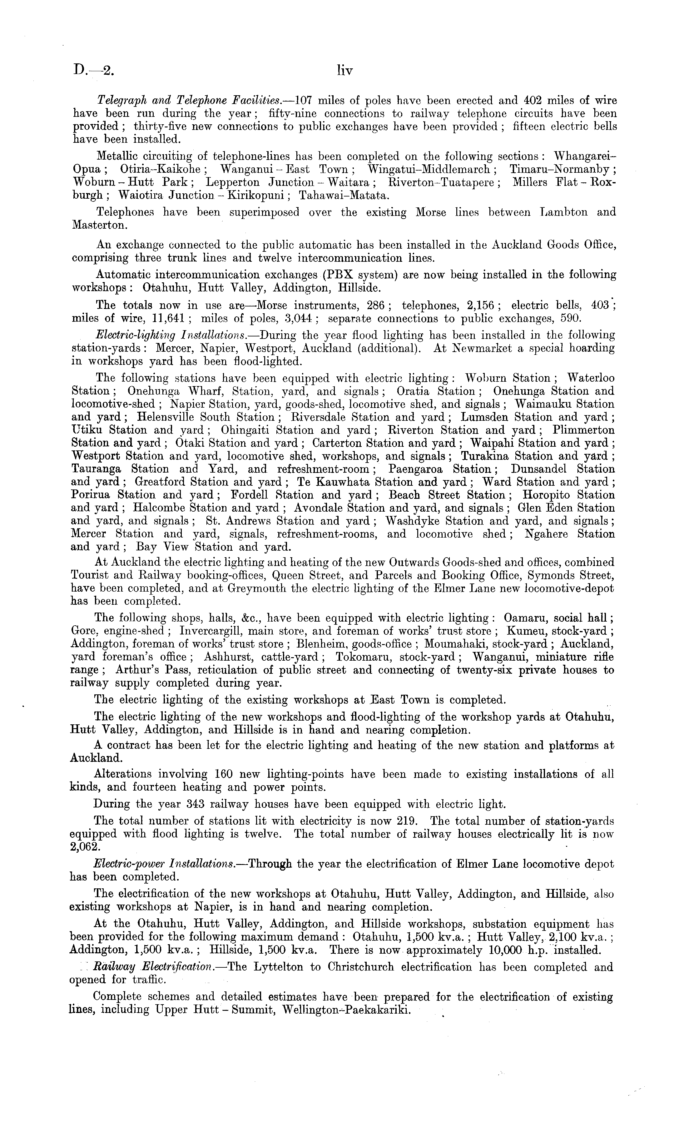 Telegraph and Telephone Facilities.—lo7 miles of poles have been erected and 402 miles of wire have been run during the year; fifty-nine connections to railway telephone circuits have been provided ; thirty-five new connections to public exchanges have been provided ; fifteen electric bells have been installed. Metallic circuiting of telephone-lines has been completed on the following sections : WhangareiOpua ; Otiria-Kaikohe ; Wanganui - East Town ; Wingatui-Middlemarch ; Timaru-Normanby ; Woburn-Hutt Park; Lepperton Junction - Waitara ; Riverton-Tuatapere ; Millers Flat - Roxburgh ; Waiotira Junction - Kirikopuni; Tahawai-Matata. Telephones have been superimposed over the existing Morse lines between Lambton and Masterton. An exchange connected to the public automatic has been installed in the Auckland Goods Office, comprising three trunk lines and twelve intercommunication lines. Automatic intercommunication exchanges (PBX system) are now being installed in the following workshops: Otahuhu, Hutt Valley, Addington, Hillside. The totals now in use are —-Morse instruments, 286 ; telephones, 2,156 ; electric bells, 403 ; miles of wire, 1 ] ,641 ; miles of poles, 3,044 ; separate connections to public exchanges, 590. Electric-lighting Installations. —During the year flood lighting has been installed in the following station-yards : Mercer, Napier, Westport, Auckland (additional). At Newmarket a special hoarding in workshops yard has been flood-lighted. The following stations have been equipped with electric lighting : Woburn Station ; Waterloo Station; Onehunga Wharf, Station, yard, and signals ; Oratia Station; Onehunga Station and locomotive-shed ; Napier Station, yard, goods-shed, locomotive shed, and signals ; Waimauku Station and yard ; Helen sville South Station ; Riversdale Station and yard ; Lumsden Station and yard ; TJtiku Station and yard ; Ohingaiti Station and yard ; Riverton Station and yard ; Plimmerton Station and yard ; Otaki Station and yard ; Carterton Station and yard ; Waipahi Station and yard ; Westport Station and yard, locomotive shed, workshops, and signals; Turakina Station and yard ; Tauranga Station and Yard, and refreshment-room; Paengaroa Station; Dunsandel Station and yard ; Greatford Station and yard ; Te Kauwhata Station and yard ; Ward Station and yard ; Porirua Station and yard; Fordell Station and yard; Beach Street Station; Horopito Station and yard ; Halcombe Station and yard ; Avondale Station and yard, and signals ; Glen Eden Station and yard, and signals ; St. Andrews Station and yard ; Washdyke Station and yard, and signals ; Mercer Station and yard, signals, refreshment-rooms, and locomotive shed; Ngahere Station and yard ; Bay View Station and yard. At Auckland the electric lighting and heating of the new Outwards Goods-shed and offices, combined Tourist and Railway booking-offices, Queen Street, and Parcels and Booking Office, Symonds Street, have been completed, and at Greymouth the electric lighting of the Elmer Lane new locomotive-depot has been completed. The following shops, halls, &c., have been equipped with electric lighting : Oamaru, social hall; Gore, engine-shed ; Invercargill, main store, and foreman of works' trust store ; Kumeu, stock-yard ; Addington, foreman of works' trust store ; Blenheim, goods-office ; Moumahaki, stock-yard ; Auckland, yard foreman's office ; Ashhurst, cattle-yard ; Tokomaru, stock-yard ; Wanganui, miniature rifle range ; Arthur's Pass, reticulation of public street and connecting of twenty-six private houses to railway supply completed during year. The electric lighting of the existing workshops at East Town is completed. The electric lighting of the new workshops and flood-lighting of the workshop yards at Otahuhu, Hutt Valley, Addington, and Hillside is in hand and nearing completion. A contract has been let for the electric lighting and heating of the new station and platforms at Auckland. Alterations involving 160 new lighting-points have been made to existing installations of all kinds, and fourteen heating and power points. During the year 343 railway houses have been equipped with electric light. The total number of stations lit with electricity is now 219. The total number of station-yards equipped with flood lighting is twelve. The total number of railway houses electrically lit is now 2,062. Electric-power Installations.—Through the year the electrification of Elmer Lane locomotive depot has been completed. The electrification of the new workshops at Otahuhu, Hutt Valley, Addington, and Hillside, also existing workshops at Napier, is in hand and nearing completion. At the Otahuhu, Hutt Valley, Addington, and Hillside workshops, substation equipment has been provided for the following maximum demand : Otahuhu, 1,500 kv.a. ; Hutt Valley, 2.100 kv.a.; Addington, 1,500 kv.a. ; Hillside, 1,500 kv.a. There is now approximately 10,000 h.p. installed. Railway Electrification.—The Lyttelton to Christchurch electrification has been completed and opened for traffic. Complete schemes and detailed estimates have been prepared for the electrification of existing lines, including Upper Hutt - Summit, Wellington-Paekakariki.