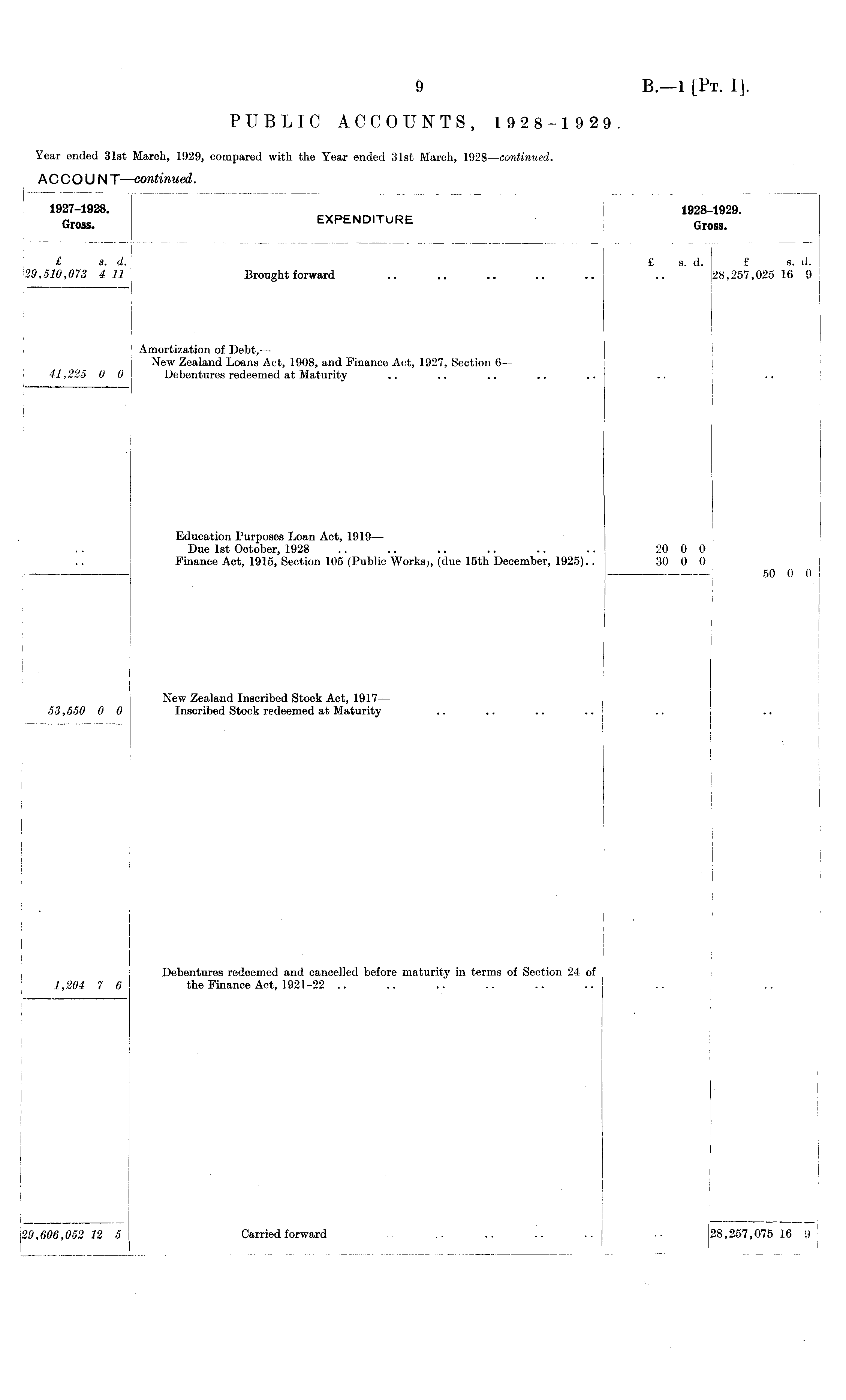 1927-1928. 1928-1929. Gross. EXPENDITURE Qross# £ s. d. £ a. d. £ s. d. 29,510,073 4 11 Brought forward .. .. .. .. .. .. 28,257,025 16 9 Amortization of Debt, — New Zealand Loans Act, 1908, and Finance Act, 1927, Section 6— 41,225 0 0 Debentures redeemed at Maturity Education Purposes Loan Act, 1919— Due 1st October, 1928 .. .. .. .. .. .. 20 0 0 Finance Act, 1915, Section 105 (Public Works;, (due 15th December, 1925).. 30 0 0 i j 50 0 0 ' . New Zealand Inscribed Stock Act, 1917— 53,550 0 0 Inscribed Stock redeemed at Maturity .. .. .. .. .. I I | | • ' I I I • I • I I I I I | Debentures redeemed and cancelled before maturity in terms of Section 24 of 1,204 7 6 the Finance Act, 1921-22 .. ' 129,606,052 12 5 Carried forward .. .. .. •• 28,257,075 16 9 _ . |