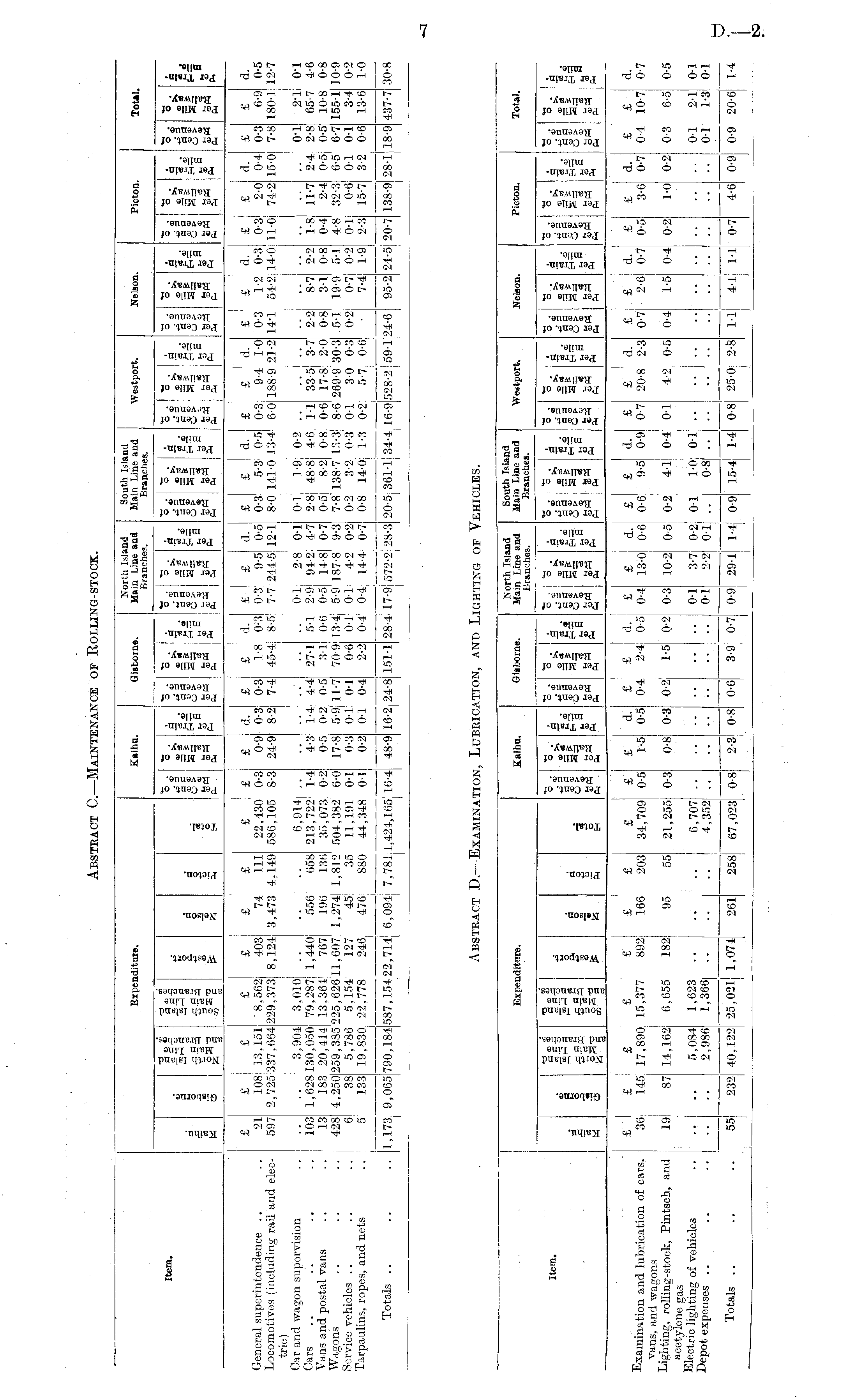 North Island South Island j Expenditure. Kaihu. Giaborne. Main Line and Main Line and Westport. Nelson. Picton. Total. Branches. Branches. Item. . ggl Is! J « °.S a °.£ a °.£ a a °-s a °-s I i § Sa2 " § g -i Is H= .Q2 si B= ®g s| H= ss H= gg Hi s= s » a | b= ag h= al .a 5 -3 PP M « 2 u £ «eMB,© e ©,cemP tj es M H |3 " O|B g|« £ 5 s S 8f§ 8« £ Srt £ SM fe« £ Si3 (S fed? Srt £ grt Stf £ M M j SSrt Stf ® W C5 S § . PH H fL ) p H W AHP4 hH 0HCL, t,i| PL ) PH^ 1 P4P4 l,i, PHpM hM (l(pL| hH P^PM^ £ £ £ £ £ £ £ £ £ £ d. £ £ d. £ £ d. £ £ d. £ £ d. £ £ d. £ £ d. £ £ d. Examination and lubrication of cars, 36 145 17,890 15,377 892 166 203 34,709 0-5 1-5 0-5 0-4 2-4 0-5 0-4 13-0 0-6 0-6 9-5 0-9 0-7 20-8 2-3 0-7 2-6 0-7 0-5 3-6 0-7 0-4 10-7 0-7 vans, and wagons Lighting, rolling-stock, Pintsch, and 19 87 14,162 6,655 182 95 55 21,255 0-3 0-8 0-3 0-2 1-5 0-2 0-3 10-2 0-5 0-2 4-1 0-4 0-1 4-2 0-5 0-4 1-5 0-4 0-2 1-0 0-2 0-3 6'5 0-5 acetylene gas Electric lighting of vehicles .. . , .. 5,084 1,623 .. .. . . 6,707 0-1 3-7 0-2 0-1 1-0 0-1 0-1 2-1 0-1 Depot expenses .. .. 2,986 1,366 4,352 0-1 2-2 0-1 .. 0-8 0-1 1-3 0-1 Totals .. .. .. 55 232 40,122 25,021 1,074 261 258 67,023 0-8 2-3 0-8 0-6 3-9 0-7 0-9 29-1 1-4 0-9 15-4 1-4 0 8 25-0 2-6 1-1 4-1 1 1 0-7 4-6 0-9 0-9 20-6 1-4 i ■ ■ ■ ; . ..I- m- I