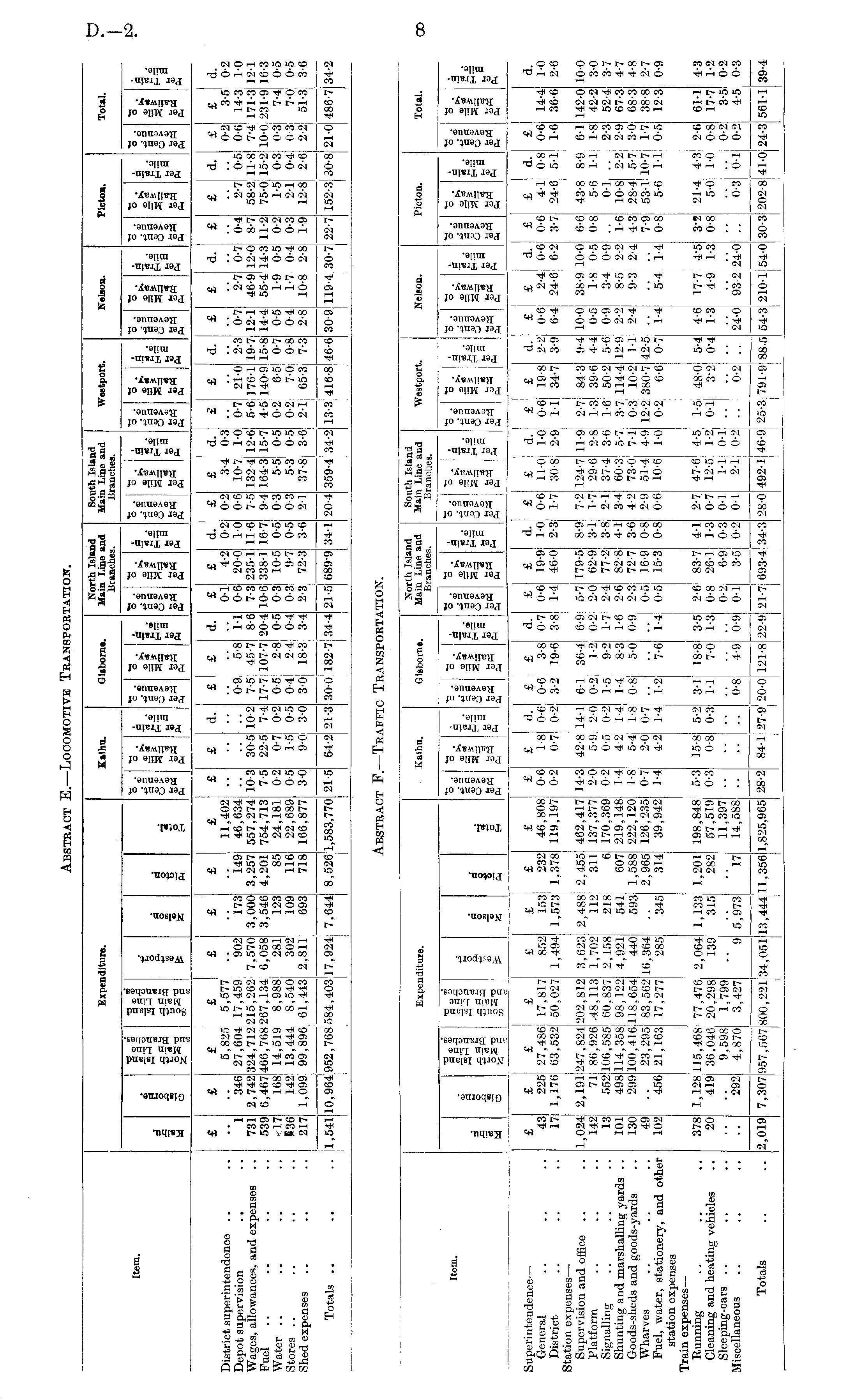 North Island South Island Expenditure. Kaihu. Gigborne. Main Line and Main Line and Westport. Nelson. Picton. Total. Branches. Branches. Item. . |s! Is! - =, p a ° s ° * .£? g ° £ 3 % "'Ji ° d ° a "i i % .9 s »Sa «3o g . . aa =5 Si Sn 5| Si aa =? S» an ='| !i Sa 35 1i S« 8b 5S Sd Is aj !i • £ c3 c3 2 rj qjcd am «-i "z: o 115 15 ,C S z—i ~ c-a> -r-i < ~ oo *s2 Ji Eh ~ % & s-ffl 5-S5 § I | -3 s ? a 5 .a ,3 t!s "a °5 'B "3 J 'S .2 SgTi gS-o & « .2 o SSM SStf £ SM Srt £ Stf Stf £ j3« £ Sf3 fetf £ Stf Stf £ S3« feM £ S« SPi £ W O K 3 oo A £5 PH H P-IP-I Superintendence— £ £ £ £ £ £ £ £ £ £ d. £ £ d. £ £ d. £ £ d. £ £ d. £ £ ! d. £ £ d. £ d. General .. .. .. 43 225 27,486 17,817 852 153 232 46,808 0-6 1-8 0-6 0-6 3-8 0-7 0-6 19-9 1-0 0-6 11-0 1-0 0-6 19-8 2-2 0-6 2-4 0-6 0-6 4-1 0-8 0-6 14-4 1-0 District .. .. .. 17 1,176 63,532 50,027 1,494 1,573 1,378 119,197 0-2 0-7 0-2 3-2 19-6 3-8 1-4 46-0 2-3 1-7 30-8 2-9 1 1 34-7 3-9 6-4 24-6 6-2 3-7 24-6 5-1 1-6 36-6 2-6 Station expenses — Supervision and office .. .. 1,024 2,191247,824 202,812 3,623 2,488 2,455 462,417 14-3 42-8 14-1 6-1 36-4 6-9 5-7 179-5 8-9 7-2 124-7 11-9 2-7 84-3 9-4 10-0 38-9 10-0 6-6 43-8 8-9 6-1 142-0 10-0 Platform .. .. .. 142 71 86,926-48,113 1,702 112 311 137,377 2-0 5-9 2-0 0-2 1-2 0-2 2-0 62-9 3-1 1-7 29-6 2-8 1-3 39-6 4-4 0-5 1-8 0-5 0-8 5-6 1-1 1-8 42-2 3-0 Signalling .. .. .. 13 552 106,585 60,837 2,158 218 6 170,369 0-2 0-5 0-2 1-5 9-2 1-7 2-4 77-2 3-8 2-1 37-4 3-6 1-6 50-2 5-6 0-9 3-4 0-9 .. 0-1 .. 2-3 52-4 3-7 Shunting and marshalling yards .. 101 498114,358 98,122 4,921 541 607 219,148 1-4 4 2 1-4 1-4 8-3 1-6 2-6 82-8 4-1 3-4 60-3 5-7 3-7 114-4 12-9 2-2 8-5 2-2 1-6 10-8 2-2 2-9 67-3 4-7 Goods-sheds and goods-yards .. 130 299 100,416118,654 440 593 1,588 222,120 1-8 5-4 1-8 0-8 5-0 0-9 2-3 72-7 3-6 4-2 73-0 7-1 0-3 10-2 1-1 2-4 9-3 2-4 4-3 28-4 5-7 3-0 68-3 4-8 Wharves .. .. .. 49 .. 23,295 83,562 16,364 .. 2,965 126,235 0-7 2-0 0-7 0-5 16-9 0-8 2-9 51-4 4-9 12-2 380-7 42-5 7-9 53-1 10-7 1-7 38-8 2-7 Fuel, water, stationery, and other 102 456 21,163 17,277 285 345 314 39,942 1-4 4-2 1-4 1-2 7-6 1-4 0-5 15-3 0-8 0-6 10-6 1-0 0-2 6-6 0-7 1-4 5-4 1-4 0-8 5-6 1-1 0-5 12-3 0-9 station expenses Train expenses — Running .. .. .. 378 1,128115,468 77,476 2,064 1,133 1,201 198,848 5-3 15-8 5-2 3-1 18-8 3-5 2-6 83-7 4-1 2-7 47-6 4-5 1-5 48-0 5-4 4-6 17-7 4"5 3'2 21-4 4-3 2-6 61-1 4-3 Cleaning and heating vehicles .. 20 419 36,046 20,298 139 315 282 57,519 0-3 0-8 0-3 1-1 7-0 1-3 0-8 26-1 1-3 0-7 12-5 1-2 0-1 3*2 0*4 1-3 4-9 1-3 0-8 5-0 1-0 0-8 17-7 1-2 Sleeping-cars .. .. 9,598 1,799 11,397 0-2 6-9 0-3 0-1 1-1 0-1 0-2 3-5 0-2 Miscellaneous .. .. .. .. 292 4,870 3,427 9 5,973 17 14,588 0-8 4-9 0-9 0-1 3-5 0-2 0-1 2-1 0-2 .. 0-2 .. 24-0 93-2 24-0 .. 0-3 0-1 0-2 4-5 0-3 Totals .. .. 2,019 7,307 957,567 800,22134,05113,444 11,3561,825,965 28-2 84-1 27-9j 20-0 121-8 22-9 21-7 693-4 34-3 28-0 492-1 46-9 25-3 791-9 88-5 54-3 210-1 54-0 30-3 202-8 41-0 24-3 561-1 39-4