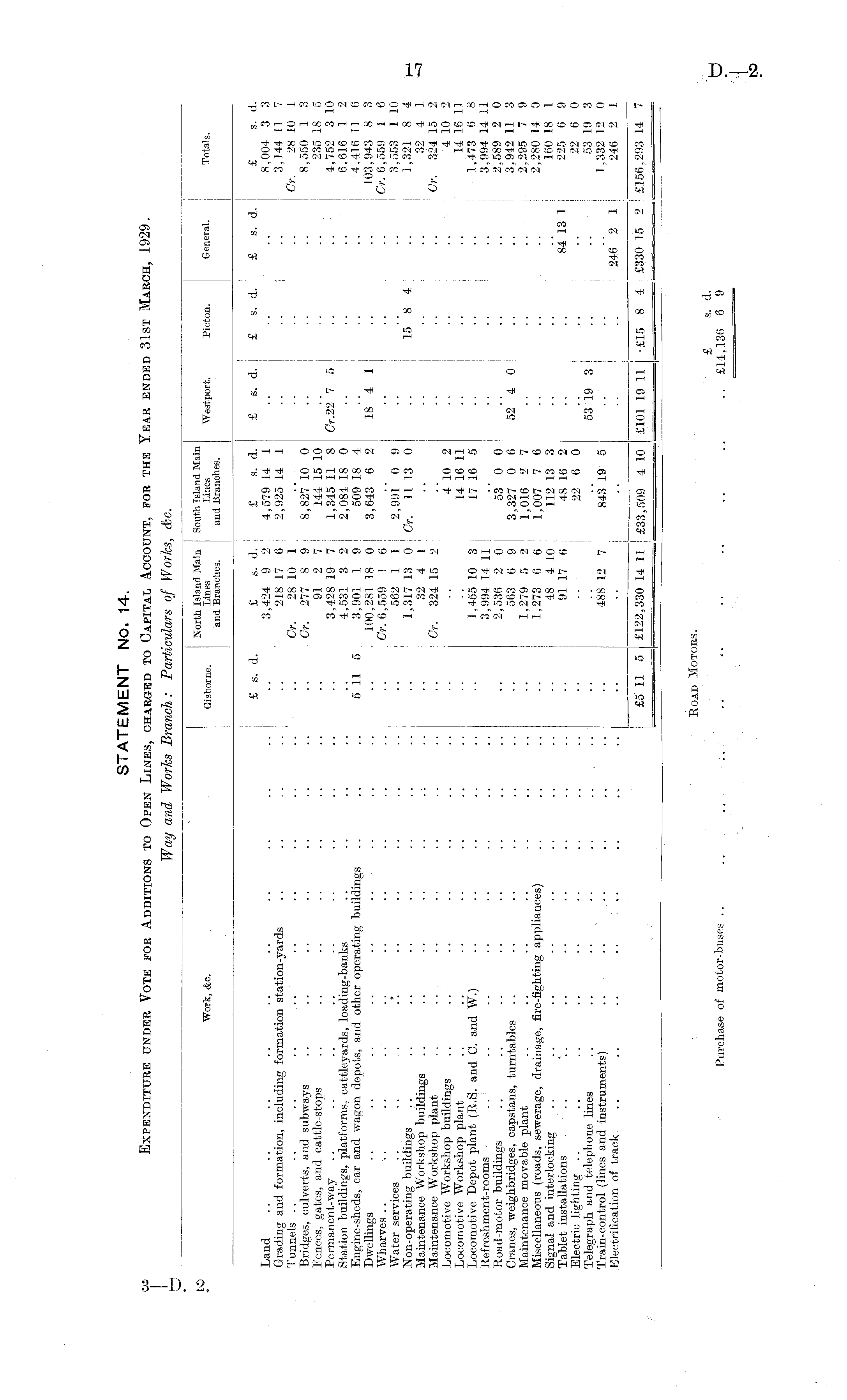 STATEMENT No. 14. Expenditure under Vote for Additions to Open Lines, charged to Capital Account, for the Year ended 31st March, 1929. Way and Works Branch: Particulars of Works, &c.