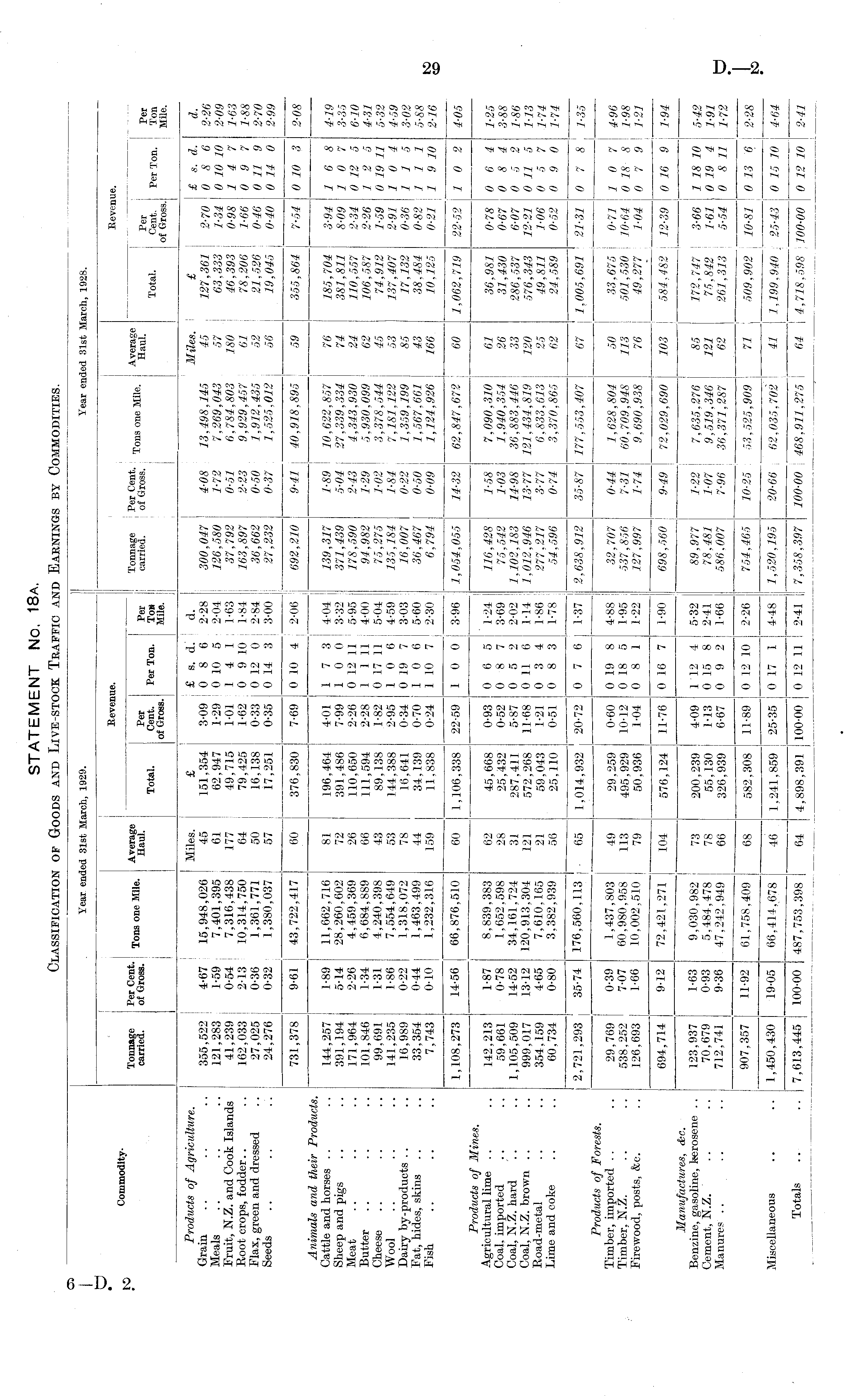 Year ended 31st March, 1929. Year ended 31st March, 1928. Revenue. Revenue. Commodity- i , __ Tonnage Per Cent. T Mil Average Tonnage Per Cent. Tn - a AT1 _ m;)a Average j [ carried. ot Gross. 10118 one Mlle ' Haul. I Per Per carried. of Gross. Tons one Mlle - Haul. Per Per Total. ; Cent. Per Ton. Ton Total. Cent, Per Ton. ! Ton of Gross. Mile. of Gross. Mile. I i I Products of Agriculture. • Miles. £ £ s. d. d. Miles, i £ £ s d d Grain .. .. .. 355,522 4-67 15,948,026 45 151,354 309 0 8 6! 2-28 i 300,047 4-08 13,498,145 45 \ 127,361 j 2-70 0 8 6 2-26 Meals .. .. .. 121,283 1-59 7,401,395 61 62,947 1-29 0 10 5: 2-04 ; 126,580 1-72 7,269,043 57 63,333 ! 1-34 0 10 10 2-09 Fruit, N.Z. and Cook Islands 41,239 0-54 7,316,438 177 49,715 1-01 1 4 1 1-63 I 37,792 0-51 6,784,803 180 46,393 \ 0-98 1 4 7 1-63 Root crops, fodder.. .. 162,033 2-13 10,314,750 64 79,425 1-62 0 9 10 1-84 163,897 2-23 9,929,457 61 78,206 1-66 0 9 7 1-88 Flax, green and dressed .. 27,025 0-36 1,361,771 50 16,138 0-33 0 12 0 2-84 36,662 0-50 1,912,435 52 21,526 0-46 0 11 9 v-70 Seeds .. .. .. 24,276 0-32 1,380,037 57 17,251 0-35 0 14 3 3-00 27,232 0-37 1,525,012 56 19,045 0-40 0 14 0 2-99 731,378 9-61 | 43,722,417 60 376,830 7-69 0 10 4 j 2-06 692,210 9-41 40,918,895 59 355,864 7-54 0 10 3 2-08 Animals and their Products. Cattle and horses .. .. 144,257 1-89 11,662,716 81 196,464 4-01 1 7 3 4-04 139,317 1-89 10,622,857 76 185,704 3-94 1 6 8 4-19 Sheep and pigs .. .. 391,194 5-14 28,260,602 72 391,486 7-99 1 0 0 3-32 371,439 5-04 27,339,334 74 381,811 8-09 1 0 7 3-35 Meat .. .. .. 171,964 2-26 4,459,369 26 110,650 2-26 0 12 11 5-95 178,590 2-43 4,343,930 24 110,557 2-34 0 12 5 6-10 Butter .. .. .. 101,846 1-34 6,684,889 66 111,594 2-28 1 1 11 4-00 94,982 1-29 5,930,099 62 106,587 2-26 1 2 5 4-31 Cheese .. .. .. 99,691 1-31 4,240,398 43 89,138 1-82 0 17 11 5-04 75,275 1-02 3,378,544 45 74,912 1-59 0 19 11 5-32 Wool .. .. .. 141,235 1-86 7,554,649 53 144.388 2-95 1 0 6 4-59 135,184 1-84 7,181,122 53 137,407 2-91 1 0 4 4-59 Dairy by-products .. .. 16,989 0-22 1,318,072 78 16,641 0-34 0 19 7 3-03 16,007 0-22 1,359,199 85 17,132 0-36 1 1 5 3-02 Fat, hides, skins .. .. 33,354 0-44 1,463,499 44 34,139 0-70 1 0 6 5-60 36,467 0-50 1,567,661 43 38,484 0-82 111 5-88 Fish .. .. .. 7,743 0-10 1,232,316 159 11.838 0-24 1 10 7 2-30 6,794 0-09 1,124,926 166 10,125 0-21 1 9 10 2-16 1,108,273 14-56 66,876,510 60 1,106,338 22-59 1 0 0 3-96 1,054,055 14-32 62,847,672 60 1,062,719 22-52 1 0 2 4-05 Products of Mines. ~ ! Agricultural lime .. .. 142,213 1-87 8,839,383 62 45,668 0-93 0 6 5 1-24 I 116,428 1-58 7,090,310 61 36,981 0-78 0 6 4 1-25 Coal, imported .. .. 59,661 0-78 1,652,598 28 25,432 0-52 0 8 7 3-69 75,542 1-03 1,940,354 26 31,430 0-67 0 8 4 3-88 Coal, N.Z. hard .. .. 1,105.509 14-52 34,161,724 31 287,411 5-87 0 5 2 2-02 ! 1,102,183 14-98 36,883,446 33 286,537 6-07 0 5 2 1-86 Coal, N.Z. brown .. .. 999,017 13-12 120,913,304 121 572,268 11-68 0 11 6 1 14 i 1,012,946 13-77 121,434,819 120 576,343 12-21 0 11 5 1-13 Road-metal .. .. 354.159 4-65 7,610,165 21 59,043 1-21 0 3 4 1-86 277.217 3-77 6,833,613 25 49,811 1-06 0 5 7 1-74 Lime and coke .. .. 60,734 0-80 3,382,939 56 25,110 0-51 0 8 3 1-78 54,596 0-74 3,370,865 62 24,589 0-52 0 9 0 1-74 2,721,293 | 35-74 176,560,113 65 1,014,932 20-72 0 7 6 1-37 2,638,912 35-87 177,5-53,407 67 1,005,691 21-31 0 7 8 1-35 Products of Forests. ~ ~ Timber, imported . . .. 29,769 0-39 1,437,803 49 29,259 0-60 0 19 8 4-88 32,707 0-44 1,628,804 50 33,675 0-71 1 0 7 4-96 Timber, N.Z. .. .. 538,252 7-07 60,980,958 113 495,929 10-12 0 18 5 1-95 1 537,856 7-31 60,709,948 113 501,530 10-64 0 18 8 1-98 Firewood, posts, &e. .. 126,693 1-66 10,002,510 79 50,936 1-04 0 8 1 1-22 127,997 1-74 9,690,938 76 j 49,277 1-04 0 7 9 1-21 694,714 9-12 72,421,271 104 576,124 11-76 0 16 7 1-90 698,560 9-49 72,029,690 103 584,482 12-39 0 16 9 1-94 Manufactures, &c. ~ j" ' Benzine, gasoline, kerosene .. 123,937 1-63 9,030,982 73 200,239 4-09 1 12 4 5-32 89,977 1-22 j 7,635,276 85 172,747 3-66 1 18 10 5-42 Cement, N.Z. .. .. 70,679 0-93 5,484,478 78 55,130 1 13 0 15 8 2-41 78,481 1-07 I 9,519,346 121 75,842 1-61 0 19 4 1-91 Manures .. .. .. 712,741 9-36 47,242,949 66 326,939 6-67 0 9 2 1-66 586,007 7-96 36,371,287 62 261,313 5-54 0 8 11 1-72 907,357 11-92 61,758,409 68 582,308 11-89 0 12 10 2-26 754,465 10-25 \ 53,525,909 71 j 509,902 10-81 0 13 6 2-28 Miscellaneous .. .. 1,450,430 19-05 66,414,678 46 1,241,859 25-35 0 17 1 4-48 1,520,195 20-66. 62,035,702 41 1,199,940 25-43 0 15 10 4-64 Totals .. .. 7,613,445 100-00 487,753,398 64 4,898,391 100-00 0 12 11 2-41 7,358,397 100-00 \ 468,911 ,275 64 \ 4,718,598 100-00 0 12 10 2-41
