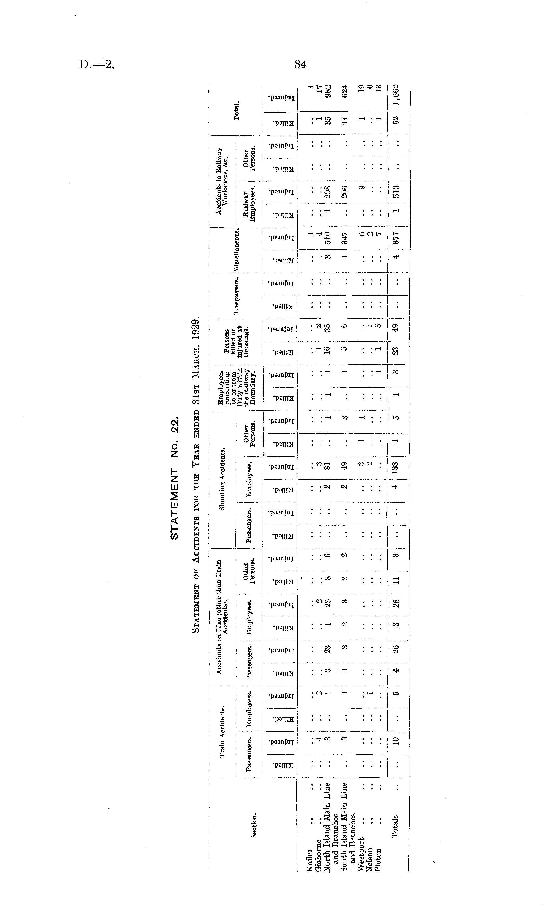 | Train Accidents. Accents on Line (other than Train Shnnting Accident,. Mg- I persons j —7 j j Duty"within injured°at ! Trespassers. Miscellaneous. Total. Section. Passengers. ! Employees. Passengers. Employees. Passengers. Employees. ; BoSyf ° r0SSingS - Empires. P^ons. T3 . "O i . 1 . | T3 "2 . *D .TJ '.tj . T3 , "O j . 13 . "d . **3 T3 £ ri 9 \ n ■ p -O P 'U P T3 -a £ T3 £ T3 p : £ t: £ -a P ■ P P T3 £ 2 S 2 3 ' £ i a 1 S S 3 .8,3 3 3 s g 1 S i A s 3 is § J; 3 j> S .2 8 9 S M >5 w I 5 S 5* 0 5 SIS 5 5 5 5 3 5 5 8 S 5 S 5* I 3 5 S I 3 5 5* * j : . i i j i i : j j | j i j | 1 j i i 7 T Kaihu .. \ .. | .. I .. .. 1 1 Gisborne .. .. .. 4 .. 2 2 .. .. ..j.. .. 3 1 2 1 j 4 .. 1 17 North Island Main Line .. 3 1 3 23 1 23 8 6 1.... 2 81 1 1 1 16 35 .... 3 510 1 298 .... 35 982 and Branches South Island Main Line .. 3 1 1 3 2 I 3 3 2 1..!.. 2 49 .. 3 .. 1 5 6 .. 1 347 .. 206 .. .. 14 624 and Branches ' ! i : j Westport .. .. .. i ... .. .. | 3 1 1 6 .. 9 .. .. I 19 Nelson .. .. .... .. 1 2 .. .. 1 2 6 Picton .. .. .. 1 1 5 7 .. 1 13 ■ ! Totals .... 10 .. 5 4 26 3 28 11 8 4 138 1 5 1 3 23 49 4 877 1 513 .... 52 ' 1,662 1 I ' I I I 1 1 ! ___
