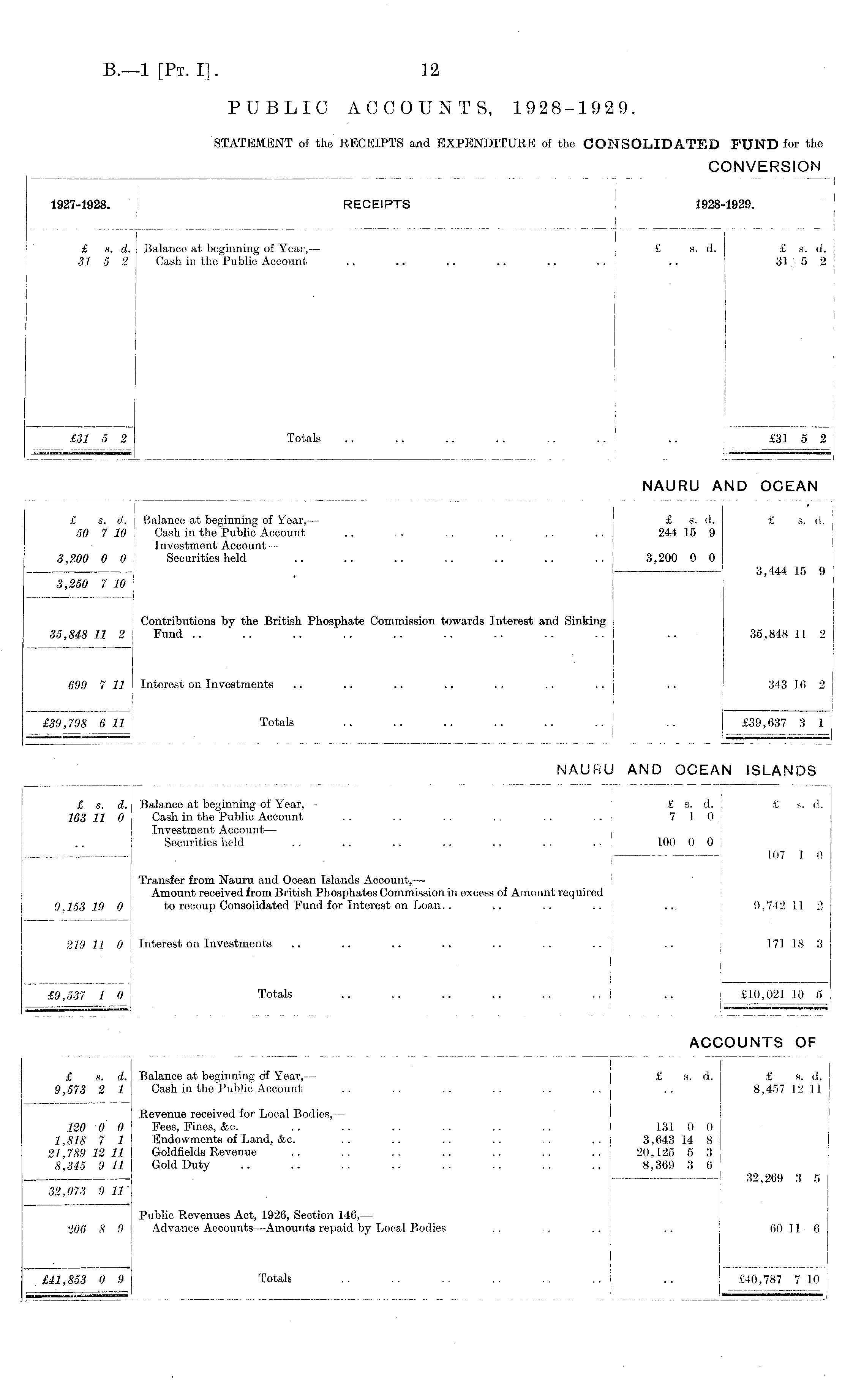 CONVERSION 1927-1928. RECEIPTS 1928-1929. £ a. d. Balance at beginning of Year, — £ s. d. £ s. d. 31 5 2 Cash in the Public Account .. .. .. .. .. .. .. 315 2 I I i ■ £31 5 2 Totals .. .. .. .. .. .. .. £31 5 2 NAURU AND OCEAN ' £ s. d. | Balance at beginning of Year, — £ s. d. £ s. d. 50 7 10 Cash in the Public Account .. . . .. .. .. .. 244 15 9 I Investment Account - 3,200 0 0 Securities held .. .. .. .. .. .. .. 3,200 0 0 — 1 3,444 15 9 3,250 7 10 Contributions by the British Phosphate Commission towards Interest and Sinking 35,848 11 2 Fund .. .. .. .. .. .. .. .. .. .. 35,848 11 2 699 7 11 Interest on Investments .. .. .. .. .. , . .. .. 343 16 2 f | £39,798 6 11 Totals .. .. .. .. .. .. .. £39,637 3 1 NAURU AND OCEAN ISLANDS £ s. d. Balance at beginning of Year, — £ s. d. £ s. d. 163 11 0 Cash in the Public Account .. .. .. 710 Investment Account— Securities held .. .. .. .. . . . . . 100 0 0 ; _ | 107 I 0 Transfer from Nauru and Ocean Islands Account, — Amount received from British Phosphates Commission in excess of Amount required 9,153 19 0 to recoup Consolidated Fund for Interest on Loan.. .. .. .. ... 9,742 11 2 219 11 0 Interest on Investments .. .. .. .. .. .. .. .. 171 18 3 £9,537 1 0 Totals .. .. .. .. .. .. .. i £10,021. 10 5 ~ I ACCOUNTS OF £ s. d. Balance at beginning of Year, — £ s. d. £ s. d. 9,573 2 1 Cash in the Public Account .. .. .. .. .. .. .. 8,457 12 11 Revenue received for Local Bodies, — 120 0 0 Fees, Fines, &e. .. .. .. .. .. .. 131 0 0 1,818 7 1 Endowments of Land, &c. .. .. .. .. .. .. 3,643 14 8 21,789 12 11 Goldfields Revenue .. .. .. .. .. .. .. 20,125 5 3 8,345 9 11 Gold Duty .. .. .. .. .. .. .. .. 8,369 3 6 32,269 3 5 32,073 9 11' Public Revenues Act, 1926, Section 146, — 206 8 9 Advance Accounts—Amounts repaid by Local Bodies . . .. .. 60 11 6 £41,853 0 9 Totals .. .. .. .. .. £40,787 7 10