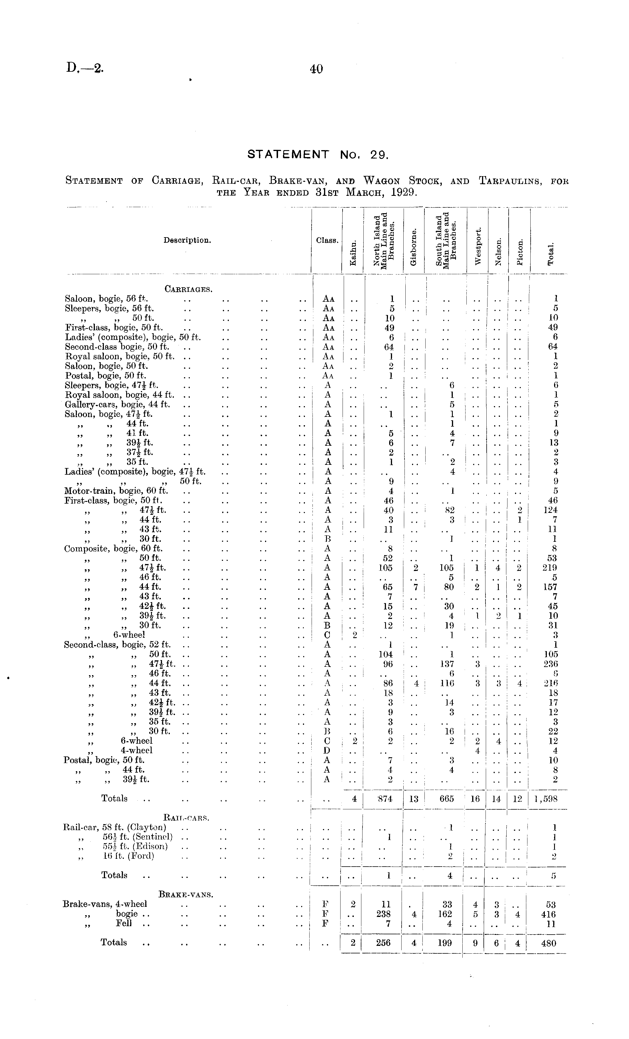 STATEMENT No. 29. Statement of Carriage, Rail-car, Brake-van, and Wagon Stock, and Tarpaulins, for the Year ended 31st March, 1929.