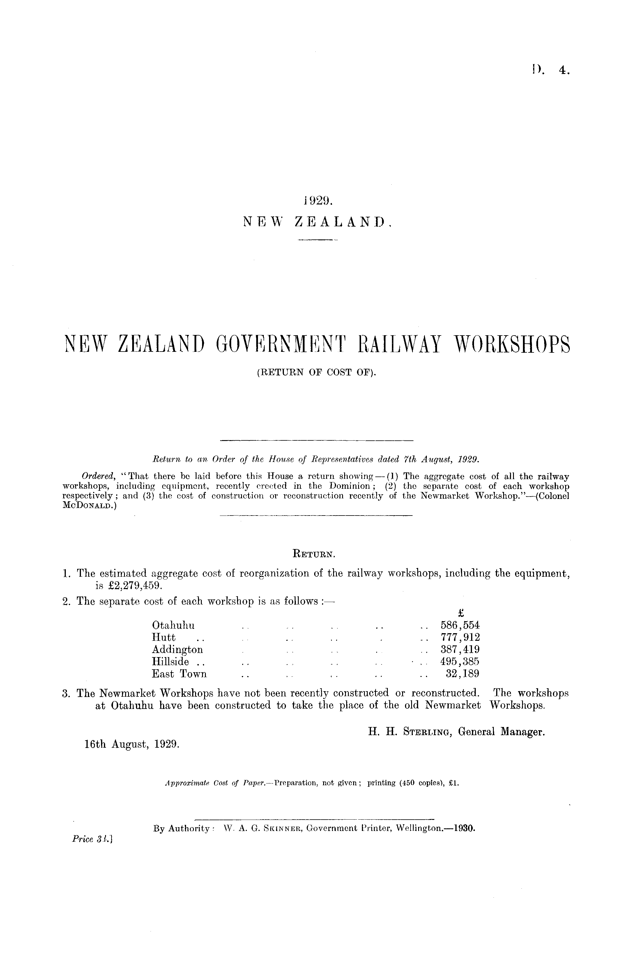 Return to an Order of the House of Representatives dated 7th August, 1929. Ordered, "That there be laid before this House a return showing — (1) The aggregate cost of all the railway workshops, including equipment, recently erected in the Dominion; (2) the separate cost of each workshop respectively ; and (3) the cost of construction or reconstruction recently of the Newmarket Workshop."—(Colonel McDonald.)