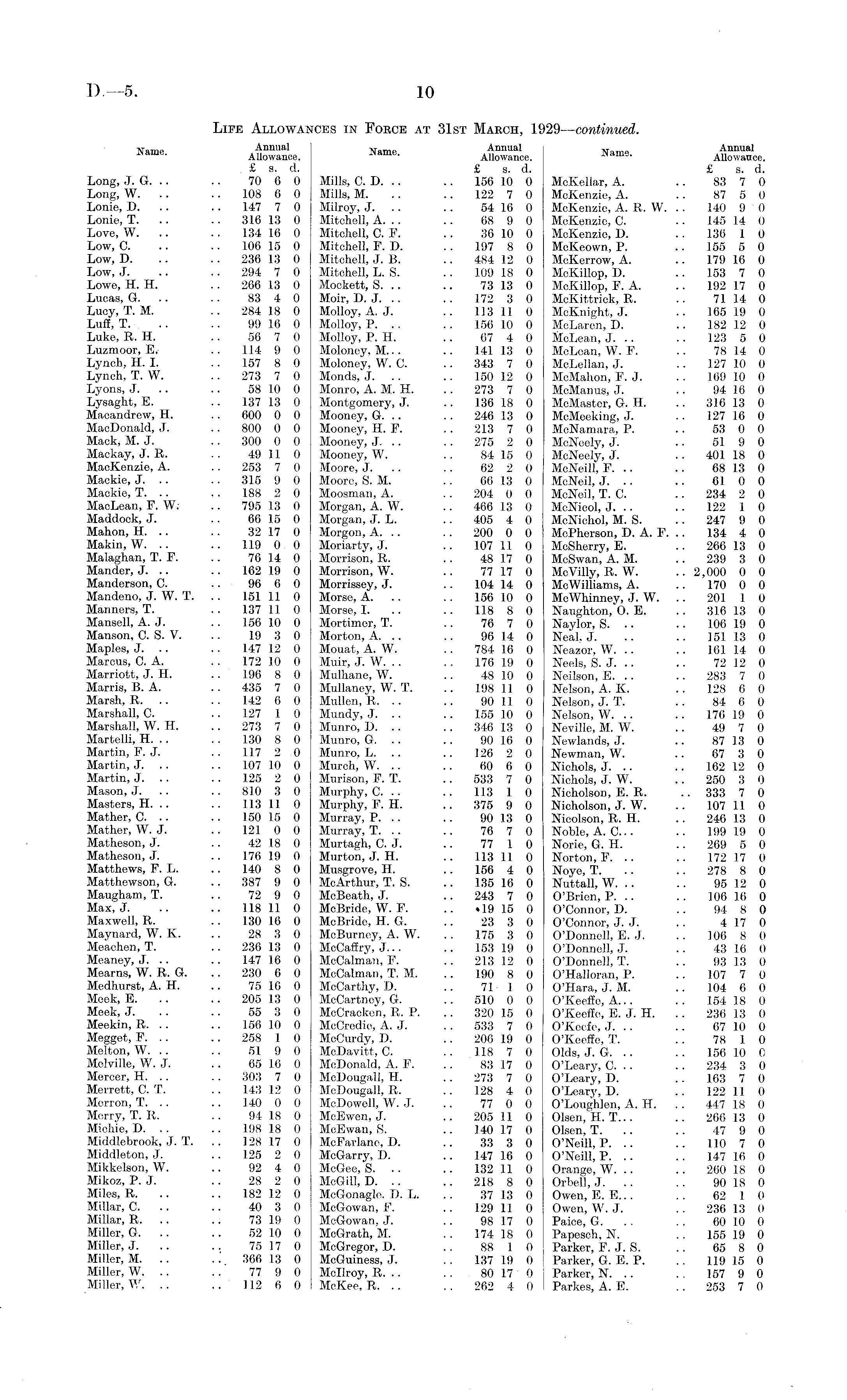 Life Allowances in Force at 31st March, 1929 —continued. "Name Annual Annual tm„™„ Annual Allowance. ~ ' Allowance. Allowance. £ s. d. £ a. d. £ s. d. Long, J. G. .. .. 70 6 0 Mills, C. D. .. .. 156 10 0 McKellar, A. .. 83 7 0 Long, W. .. 108 6 0 Mills, M. .. .. 122 7 0 McKenzie, A. .. 87 5 0 Lonie, D. .. .. 147 7 0 Milroy, J. .. 54 16 0 McKenzie, A. R. W. . . 140 9 0 Lonie, T. .. .. 316 13 0 Mitchell, A. . . .. 68 9 0 McKenzie, C. .. 145 14 0 Love, W. .. . . 134 16 0 Mitchell, C. F. .. 36 10 0 McKenzie, I>. .. 136 1 0 Low, C. .. .. 106 15 0 Mitchell, F. D. .. 197 8 0 McKeown, P. .. 155 5 0 Low, D. .. .. 236 13 0 Mitchell, J. 15. .. 484 12 0 McKerrow, A. . . 179 16 0 Low, J. .. .. 294 7 0 Mitchell, L. S. .. 109 18 0 McKillop, D. 153 7 0 Lowe, H. H. . . 266 13 0 Mockett, S. .. .. 73 13 0 McKillop, F. A. . . 192 17 0 Lucas, G. .. .. 83 4 0 Moir, D. J. .. .. 172 3 0 McKit.trick, R. .. 71 14 0 Lucy, T. M. .. 284 18 0 Molloy, A. J. .. 113 11 0 McKnight, J. .. 165 19 0 Luff, T. . . .. 99 16 0 Molloy, P. .. .. 156 10 0 McLaren, D. .. 182 12 0 Luke, R. H. .. 56 7 0 Molloy, P. H. .. 07 4 0 McLean, J. .. .. 123 5 0 Luzmoor, E. .. 114 9 0 Moloney, M... .. 141 13 0 McLean, W. F. .. 78 14 0 Lynch, H. I. .. 157 8 0 Moloney, W. C. .. 343 7 0 McLellan, J. .. 127 10 0 Lynch, T. W. .. 273 7 0 Monds, J. .. .. 150 12 0 McMahon, F. J. . . 169 10 0 Lyons, J. .. .. 58 10 0 Monro, A. M. H. . . 273 7 0 McManus, J. .. 94 16 0 Lysaght, E. .. 137 13 0 Montgomery, J. .. 136 18 0 MeMaster, G. H. .. 316 13 0 Macandrew, H. .. 600 0 0 Mooney, G. .. .. 246 13 0 McMeeking, J. .. 127 16 0 Mac Donald, .1. .. 800 0 0 Mooney, H. F. .. 213 7 0 McNamara, P. .. 53 0 0 Mack, M. J. .. 300 0 0 Mooney, J. .. .. 275 2 0 McNeely, J. .. 51 9 0 Mackay, J. R. . . 49 11 0 Mooney, W. .. 84 15 0 MeNeely, J. .. 401 18 0 MacKenzie, A. .. 253 7 0 Moore, J. .. .. 62 2 0 McNeill, F. .. .. 68 13 0 Mackie, J. .. .. 315 9 0 Moore, S. M. .. 66 13 0 McNeil, J. .. .. 61 0 0 Mackie, T. .. . . 188 2 0 Moosman, A. .. 204 0 0 McNeil, T. C. 234 2 0 Mac Lean, F. W. . . 795 13 0 Morgan, A. W. .. 466 13 0 McNicol, J. .. .. 122 1 0 Maddock, J. 66 15 0 Morgan, J. L. .. 405 4 0 McNichol, M. S. .. 247 9 0 Mahon, H. .. .. 32 17 0 Morgon, A. .. . . 200 0 0 McPherson, D. A. F. .. 134 4 0 Makin, W. .. . . 119 0 0 Moriarty, J. .. 107 11 0 McSherry, E. .. 266 13 0 Malaghan, T. F. .. 76 14 0 Morrison, R. . . 48 17 0 McSwan, A. M. .. 239 3 0 Mander, J. .. .. 162 19 0 Morrison, W. .. 77 17 0 McVilly, R. W. .. 2,000 0 0 Manderson, C. .. 96 6 0 Morrissey, J. .. 104 14 0 McWilliams, A. .. 170 0 0 Mandeno, J. W. T. . . 151 11 0 Morse, A. .. .. 156 10 0 McWhinney, J. W. .. 201 1 0 Manners, T. . . 137 11 0 Morse, I. .. .. 118 8 0 Naughton, O. E. . . 316 13 0 Mansell, A. J. .. 156 10 0 Mortimer, T. .. 76 7 0 Naylor, S. .. .. 106 19 0 Manson, C. 8. V. .. 19 3 0 Morton, A. .. .. 96 14 0 Neal. J. .. .. 15113 0 Maples, J. .. .. 147 12 0 Mouat, A. W. .. 784 16 0 Neazor, W. .. .. 161 14 0 Marcus, C. A. .. 172 10 0 Muir, J. W. .. .. 176 19 0 Neels, S. J. .. .. 72 12 0 Marriott, J. 11. .. 196 8 0 Mulhane, W. .. 48 10 0 Neilson, E. .. .. 283 7 0 Marris, B. A. .. 435 7 0 Mullaney, W. T. .. 198 11 0 Nelson, A. K. .. 128 6 0 Marsh, R. .. .. 142 6 0 Mullen, R. .. .. 90 11 0 Nelson, J. T. .. 84 6 0 Marshall, C. 127 1 0 Mundy, J. .. .. 155 10 0 Nelson, W. .. .. 176 19 0 Marshall, W. H. .. 273 7 0 Munro, D. .. .. 346 13 0 Neville, M. W. .. 49 7 0 Martelli, H. .. .. 130 8 0 Munro, G. .. .. 90 16 0 Newlands, J. .. 87 13 0 Martin, F. J. .. 117 2 0 Munro, L. .. .. 126 2 0 Newman, W. .. 67 3 0 Martin, J. .. .. 107 10 0 Murch, W. .. .. 60 6 0 Nichols, J. .. .. 162 12 0 Martin, J. . . . . 125 2 0 Murison, F. T. .. 533 7 0 Nichols, J. W. .. 250 3 0 Mason, J. .. .. 810 3 0 Murphy, C. .. .. 113 1 0 Nicholson, E. R. .. 333 7 0 Masters, H... .. 113 11 0 Murphy, F. H. .. 375 9 0 Nicholson, J. W. .. 107 11 0 Mather, C. .. .. 150 15 0 Murray, P. .. .. 90 13 0 Nicolson, R. H. .. 246 13 0 Mather, W.J. .. 121 0 0 Murray, T. .. .. 76 7 0 Noble, A. C... .. 199 19 0 Matheson, J . .. 42 18 0 Murtagh, C. J. .. 77 1 0 Norie, G. H. .. 269 5 0 Matheaon, J. .. 176 19 0 Murton, J. H. .. 113 11 0 Norton, F. .. .. 172 17 0 Matthews, F. L. .. 140 8 0 Musgrove, H. .. 156 4 0 Noye, T. .. .. 278 8 0 Matthewson, G. .. 387 9 0 McArthur, T. S. .. 135 16 0 Nut-tall, W. .. .. 95 12 0 Maugham, T. .. 72 9 0 Mcßeath, J. .. 243 7 0 O'Brien, P. .. .. 106 16 0 Max, J. .. .. 118 11 0 Mcßride, W. F. .. .19 15 0 O'Connor,!). .. 94 8 0 Maxwell, R. .. 130 16 0 Mcßride, H. G. .. 23 3 0 O'Connor, J. J. . . 417 0 Maynard, W. K. .. 28 3 0 Mcßurney, A. W. .. 175 3 0 O'Donnell, E. J. .. 106 8 0 Meachen, T. .. 236 13 0 McCaffry, J... .. 153 19 0 O'Donnell, J. .. 43 16 0 Meaney, J. .. .. 147 16 0 McCalman, F. .. 213 12 0 O'Donnell, T. .. 93 13 0 Mearns, W. R. G. .. 230 6 0 McCalman, T. M. .. 190 8 0 O'Halloran, P. .. 107 7 0 Medhurst, A. H. .. 75 16 0 McCarthy, D. .. 71 1 0 O'Hara, J. M. .. 104 6 0 Meek, E. .. .. 205 13 0 McCartney, G. .. 510 0 0 O'Keeffe, A... .. 154 18 0 Meek, J. .. .. 55 3 0 MeCracken, R. P. .. 320 15 0 O'Keeffe, E. J. H. .. 236 13 0 Meekin, R. .. .. 156 10 0 McCredie, A. J. .. 533 7 0 O'Keefe, J. .. .. 67 10 0 Megget, F. .. .. 258 1 0 McCurdy, D. .. 206 19 0 O'Keeffe, T. .. 78 1 0 Melton, W. .. .. 51 9 0 McDavitt, C. .. 118 7 0 Olds, J. G. .. .. 156 10 0 Melville, W. J. .. 65 16 0 McDonald, A. F. .. 83 17 0 O'Leary, C. .. .. 234 3 0 Mercer, H. .. .. 303 7 0 McDougall, H. .. 273 7 0 O'Leary, D. .. 163 7 0 Merrett, C. T. .. 143 12 0 McDougall, R. .. 128 4 0 O'Leary, D. .. 122 11 0 Merron, T. .. .. 140 0 0 McDowell, W. J. .. 77 0 0 O'Loughlen, A. H. . . 447 18 0 Merry, T. R. .. 94 18 0 McEwen, J. .. 205 11 0 Olsen, H. T... .. 266 13 0 Michie, D. .. .. 198 18 0 McEwan, S. .. 140 17 0 Olsen, T. .. .. 47 9 0 Middlebrook, J. T. .. 128 17 0 McFarlane, D. .. 33 3 0 O'Neill, P. .. .. 110 7 0 Middleton, J. . . 125 2 0 McGarry, D. .. 147 16 0 O'Neill, P. .. . . 147 16 0 Mikkelson, W. .. 92 4 0 McGee, S. . . .. 132 11 0 Orange, 