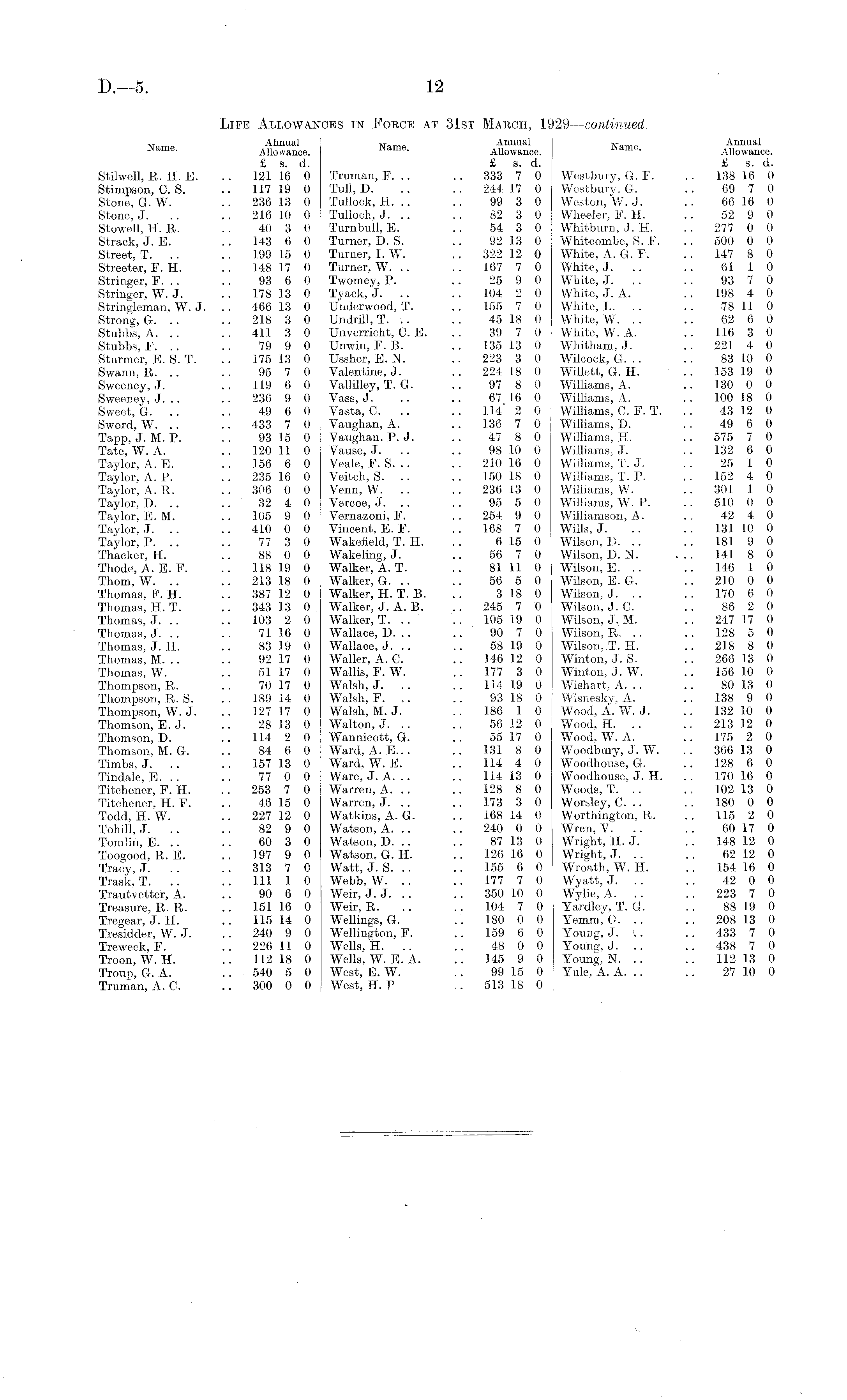 Life Allowances in Force at 31st March, 1929 —continued. w» ™ Ahnual „ Annual N Annual Name - Allowance. JName. Allowance. JName. Allowance. £ s. d. £ s. d. £ s. d. Stilwell, R. H. E. .. 121 16 0 Truman, F. .. .. 333 7 0 Westbury, G. F. .. 138 16 0 Stimpson, C. S. .. 117 19 0 Tull, L>. .. .. 244 17 0 Westbury, G. .. 69 7 0 Stone, G. W. .. 236 13 0 Tullock, H. .. .. 99 3 0 Weston, W. J. .. 66 16 0 Stone, J. .. .. 216 10 0 Tulloch, J. .. .. 82 3 0 Wheeler, F. H. .. 52 9 0 Stowell, H. R. .. 40 3 0 Turnbull, E. .. 54 3 0 Whitburn, J. H. .. 277 0 0 Strack, J. E. .. 143 6 0 Tumor, X). S. .. 92 13 0 Whitcombe, S. F. .. 500 0 0 Street, T. .. .. 199 15 0 Turner, I. W. .. 322 12 0 White, A. G. F. .. 147 8 0 Streeter, F. H. .. 148 17 0 Turner, W. .. .. 167 7 0 White, J. .. 61 1 0 Stringer, F. .. .. 93 6 0 Twomey, P. .. 25 9 0 White, J. .. 93 7 0 Stringer, W. J. . . 178 13 0 Tyaek, J. .. 104 2 0 White, J. A. .. 198 4 0 Stringleman, W. J. . . 466 13 0 Underwood, T. .. 155 7 0 White, L. .. .. .78 11 0 Strong, G. .. .. 218 3 0 Undrill, T. .. .. 45 18 0 White, W. .. .. 62 6 0 Stubbs, A. .. .. 411 3 0 Unverricht, C. E. .. 39 7 0 White, W. A. .. 116 3 0 Stubbs, F. .. .. 79 9 0 Unwin, F. B. .. 135 13 0 Whitham, J. .. 221 4 0 Sturmer, E. S. T. .. 175 13 0 Ussher, E. N. .. 223 3 0 Wilcook, G. .. .. 83 10 0 Swann, R. .. . . 95 7 0 Valentine, J. .. 224 18 0 Willett, G. H. .. .153 19 0 Sweenev, J. .. 119 6 0 Vallilley, T. G. .. 97 8 0 Williams, A. .. 130 0 0 Sweeney, J... .. 236 9 0 Vass, J. .. .. 67 16 0 Williams, A. .. 100 18 0 Sweet, G. .. .. 49 6 0 Vasta, C. .. .. 114' 2 0 Williams, C. F. T. .. 43 12 0 Sword. W. .. .. 433 7 0 Vaughan, A. .. 136 7 0 Williams, D. . . 49 6 0 Tapp, J. M. P. .. 93 15 0 Vaughan. P. J. .. 47 8 0 Williams, H. .. 575 7 0 Tate, W. A. .. 120 11 0 Vause, J. .. .. 98 10 0 Williams, J. .. 132 6 0 Taylor, A. E. .. 156 6 0 Veale, F. S. .. .. 210 16 0 Williams, T. J. .. 25 1 0 Taylor, A. P. .. 235 16 0 Veiteh, S. .. .. 150 18 0 Williams, T. P. .. 152 4 0 Taylor, A. R. .. 306 0 0 Venn, W. .. 236 13 0 Williams, W. .. 301 1 0 Taylor, D. .. .. 32 4 0 Vercoe, J. .. .. 95 5 0 Williams, W. P. .. 510 0 0 Taylor. E. M. .. 105 9 0 Vernazoni, F. .. 254 9 0 Williamson, A. .. 42 4 0 Taylor, J. . . .. 410 0 0 Vincent, E. F. .. 168 7 0 Wills, J. .. .. 131 10 0 Taylor, P. .. .. 77 3 0 Wakefield, T. H. .. 615 0 Wilson, IS. .. .. 181 9 0 Thacker, H. .. 88 0 0 Wakeling, J. .. 56 7 0 Wilson, D. N. ... 141 8 0 Thode, A. E. F. .. 118 19 0 Walker, A. T. .. 8111 0 Wilson, E. .. .. 146 1 0 Thorn, W. .. .. 213 18 0 Walker, G. .. .. 56 5 0 Wilson, E. G. .. 210 0 0 Thomas, F. H. .. 387 12 0 Walker, H. T. B. .. 318 0 Wilson, J. .. .. 170 6 0 Thomas, H. T. .. 343 13 0 Walker, J. A. B. .. 245 7 0 Wilson, J. C. .. 86 2 0 Thomas, J. .. .. 103 2 0 Walker, T. .. .. 105 19 0 Wilson, J. M. .. 247 17 0 Thomas, J. .. .. 71 16 0 Wallace, D. .. .. 90 7 0 Wilson, R. .. .. 128 5 0 Thomas, J. H. .. 83 19 0 Wallace, J. .. .. 58 19 0 Wilson,,T. H. .. 218 8 0 Thomas, M... .. 92 17 0 Waller, A. C. .. 146 12 0 Winton, J. S. .. 266 13 0 Thomas, W. .. 51 17 0 Wallis, F. W. .. 177 3 0 Winton, J. W. .. 156 10 0 Thompson, R. .. 70 17 0 Walsh, J. .. .. 114 19 0 Wishart, A. .. .. 80 13 0 Thompson, R. S. .. 189 14 0 Walsh, F. .. 93 18 0 Wisnesky, A. .. 138 9 0 Thompson, W. J. .. 127 17 0 Walsh, M. J. .. 186 1 0 Wood, A. W. J. .. 132 10 0 Thomson, E. J. .. 28 13 0 Walton, J. .. .. 56 12 0 Wood, H. .. .. 213 12 0 Thomson, I). .. 114 2 0 Wannicott, G. .. 55 17 0 Wood, W. A. .. 175 2 0 Thomson, M. G. .. 84 6 0 Ward, A. E... .. 131 8 0 Woodbury, J. W. .. 366 13 0 Timbs, J. .. .. 157 13 0 Ward, W. E. .. 114 4 0 Woodhouse, G. .. 128 6 0 Tindale, E. .. .. 77 0 0 Ware, J. A. .. .. 114 13 0 Woodhouse, J. H. .. 170 16 0 Titchener, F. H. .. 253 7 0 Warren, A. .. .. 128 8 0 Woods, T. .. .. 102 13 0 Titehener, H. F. .. 46 15 0 Warren, J. .. .. 173 3 0 Worsley, C. .. .. 180 0 0 Todd, H. W. .. 227 12 0 Watkins, A. G. .. 168 14 0 Worthington, R. .. 115 2 0 Tohill, J. .. .. 82 9 0 Watson, A... .. 240 0 0 Wren, V. .. .. 60 17 0 Tomlin, E. .. .. 60 3 0 Watson, D. .. .. 87 13 0 Wright, H. J. .. 148 12 0 Toogood, R. E. .. 197 9 0 Watson, G. H. .. 126 16 0 Wright, J. . . .. 62 12 0 Tracy, J. .. .. 313 7 0 Watt, J. S. .. .. 155 6 0 Wroath, W. H. .. 154 16 0 Traak, T. .. .. 11l 1 0 Webb, W. .. .. 177 7 0 Wyatt, J. .. .. 42 0 0 Trautvetter, A. .. 90 6 0 Weir, J. J. . . .. 350 10 0 Wylie, A. .. .. 223 7 0 Treasure, R. R. .. 151 16 0 Weir, R. .. .. 104 7 0 Yardley, T. G. .. 88 19 0 Tregeax, J. H. .. 115 14 0 Wellings, G. .. 180 0 0 Yemm, G. . . .. 208 13 0 Tresidder, W. J. .. 240 9 0 Wellington, F. .. 159 6 0 Young, J. U .. 433 7 0 Treweck, F. .. 226 11 0 Wells, H. .. .. 48 0 0 Young, J. .. .. 438 7 0 Troon, W. H. .. 112 18 0 Wells, W. E. A. .. 145 9 0 Young, N. .. .. 112 13 0 Troun, G. A. .. 540 5 0 West, E. W. , . 99 15 0 Yule, A. A. .. .. 27 10 0 Truman, A. C. .. 300 0 0 West, H. P ~ 513 18 0