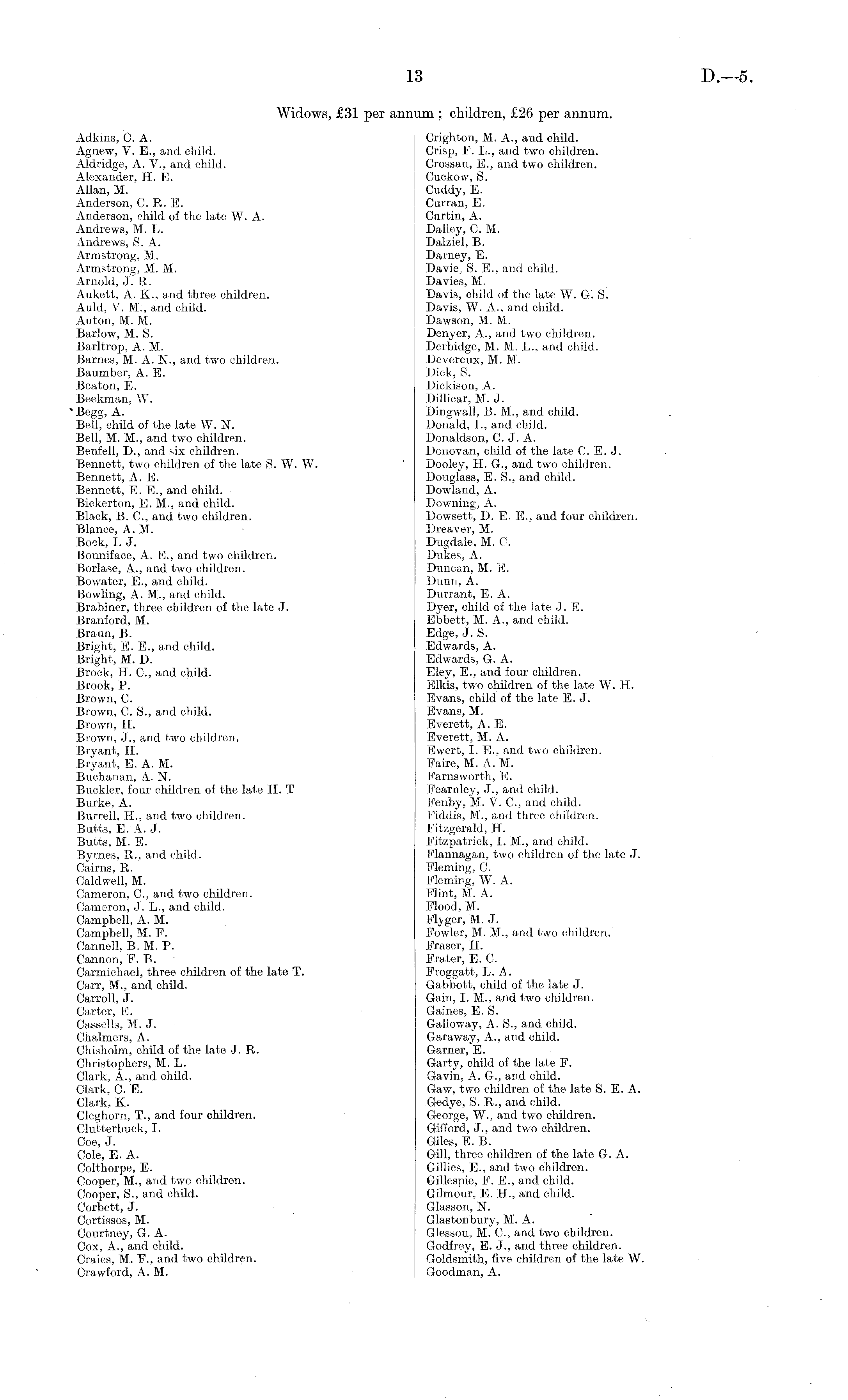 Widows, £31 per annum ; children, £26 per annum. Adkins, C. A. Crighton, M. A., and child. Agnew, V. E., and child. Crisp, I:'. L., and two children. Aldridge, A. V., and child. Crossan, E., and two children. Alexander, H. E. Cuckovv, S. Allan, M. Cuddy, E. Anderson, C. F». E. Curran, E. Anderson, child of the late W. A. Curtin, A. Andrews, M. L. Dalley, C. M. Andrews, S. A. Dalziel, B. Armstrong, M. Darney, E. Armstrong, M. M. Davie, S. E., and child. Arnold, J. R. Da vies, M. Aukett, A. K., and three children. Davis, child of the late W. G. S. Auld, V. M., and child. Davis, W. A., and child. Auton, M. M. Dawson, M. M. Barlow, M. S. Denyer, A., and two children. Barltrop, A. M. Derbidge, M. M. L., and child. Barnes, M. A. N., and two children. Devereux, M. M. Baumber, A. E. Dick, S. Beaton, E. Dickison, A. Beekman, W. Dillicar, M. J. Begg, A. Dingwall, B. M., and child. Bell, child of the late W. N. Donald, 1., and child. Bell, M. M., and two children. Donaldson, C. J. A. Benfell, D., and six children. Donovan, child of the late C. E. J. Bennett, two children of the late S. W. W. ' Dooley, H. G., and two children. Bennett, A. E. Douglass, E. S., and child. Bennett, E. E., and child. Dowland, A. Bickerton, E. M., and child. Downing, A. Black, B. C., and two children. Dowsett, D. E. E., and four children. Blance, A. M. Dreaver, M. Bock, I. J. Dugdale, M. C. Bonniface, A. E., and two children. Dukes, A. Borlase, A., and two children. Duncan, M. E. Bowater, E., and child. Dunn, A. Bowling, A. M., and child. Durrant, E. A. Brabiner, three children of the late J. Dyer, child of the late J. E. Branford, M. Ebbett, M. A., and child. Braun, B. Edge, J. S. Bright, E. E., and child. Edwards, A. Bright, M. D. Edwards, G. A. Brock, H. C., and child. Eley, E., and four children. Brook, P. Elkis, two children of the late W. H. Brown, C. Evans, child of the late E. J. Brown, C. S., and child. Evans, M. Brown, H. Everett, A. E. Brown, J., and two children. Everett, M. A. Bryant, H. Ewert, I. E., and two children. Bryant, E. A. M. Faire, M. A. M. Buchanan, A N. Farnsworth, E. Buckler, four children of the late H. T Fearnley, J., and child. Burke, A. Fenby, M. V. C., and child. Burrell, H., and two children. Fiddis, M., and three children. Butts, E. A. J. Fitzgerald, H. Butts, M. E. Fitzpatrick, I. M., and child. Byrnes, R., and child. Flannagan, two children of the late J. Cairns, R. Fleming, C. Caldwell, M. Fleming, W. A. Cameron, C., and two children. Flint, M. A. Cameron, J. L., and child. Flood, M. Campbell, A. M. Flyger, M. J. Campbell, M. F. Fowler, M. M., and two children. Cannell, B. M. P. Fraser, H. Cannon, F. B. Frater, E. C. Carmichael, three children of the late T. Froggatt, L. A. Carr, M., and child. Gabbott, child of the late J. Carroll, J. Gain, I. M., and two children. Carter, E. Gaines, E. S. Cassells, M. J. Galloway, A. S., and child. Chalmers, A. Garaway, A., and child. Chisholm, child of the late J. R. Garner, E. Christophers, M. L. Garty, child of the late F. Clark, A., and child. Gavin, A. G., and child. Clark, C. E. Gaw, two children of the late S. E. A. Clark, K. Gedye, S. R., and child. Cleghorn, T., and four children. George, W., and two children. Clutterbuck, I. Gift'ord, J., and two children. Coe, J. Giles, E. B. Cole, E. A. Gill, three children of the late G. A. Colthorpe, E. Gillies, E., and two children. Cooper, M., and two children. Gillespie, F. E., and child. Cooper, S., and child. Gilmour, E. H., and child. Corbett, J. Glasson, N. Cortissos, M. Glastonbury, M. A. Courtney, G. A. Glesson, M. C., and two children. Cox, A., and child. Godfrey, E. J., and three children. Craies, M. F., and two children. Goldsmith, five children of the late W. Crawford, A. M. Goodman, A.