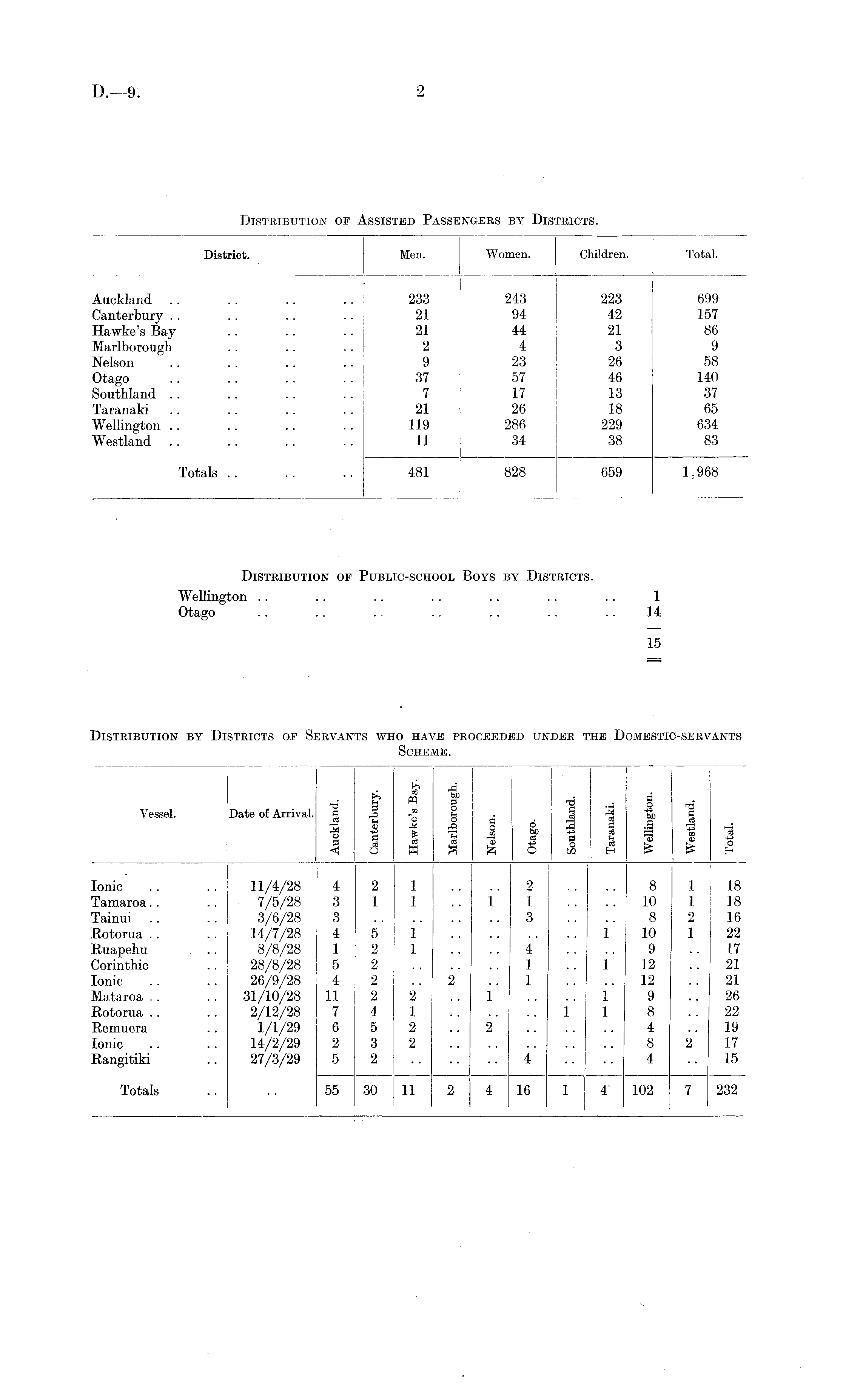Distribution op Assisted Passengers by Districts. District. Men. Women. Children. | Total. , I Auckland .. . . . . .. 233 243 223 699 Canterbury .. . . . . .. 21 94 42 157 Hawke's Bay ...... 21 44 21 86 Marlborough ...... 2 4 3 9 Nelson .. .. .. .. 9 23 26 58 Otago .. .. .. .. 37 57 46 140 Southland 7 17 13 37 Taranaki .. .. . . . . 21 26 18 65 Wellington .. .. .. .. 119 286 229 634 Westland .. .. .. .. 11 34 38 83 Totals .. .. .. 481 828 659 1,968 Distribution of Public-school Boys by Districts. Wellington .. . . . . . . . . . . .. 1 Otago .. .. . . . .. . . .. ] 4 15 Distribution by Districts of Servants who have proceeded under the Domestic-servants Scheme. co ri 'd S O rrt Vessel. Date of Arrival. 5 % S • § "7* g TOf_)<UOrH • i—i 2 C w "M <D rX 3 -H S -5 5 w S £3 M dj C "t? 5 O t>r-° Ionic .. .. 11/4/28 4 2 1 .. ..2 .. .. 8 1 18 Tamaroa.. .. 7/5/28 3 1 1 ..1 1 .. ..10 1 18 Tainui .. .. 3/6/28 3 3 .. .. 8 2 16 Rotorua .. .. 14/7/28 4 5 1 1 10 1 22 Ruapehu . .. 8/8/28 1 2 1 .. .. 4 .. .. 9 .. 17 Corinthic .. 28/8/28 5 2 1 .. 1 12 .. 21 Ionic .. .. 26/9/28 4 2 .. 2 .. 1 .. .. 12 .. 21 Mataroa .. .. 31/10/28 11 2 2 1 .. 1 9 26 Rotorua .. .. 2/12/28 7 4 1 1 1 8 22 Remuera .. 1/1/29 6 5 2 .. 2 4 .. 19 Ionic .. .. 14/2/29 2 3 2 8 2 17 Rangitiki .. 27/3/29 5 2 4 .. .. 4 .. 15 Totals .. .. 55 30 | 11 2 4 16 1 4" 102 7 232