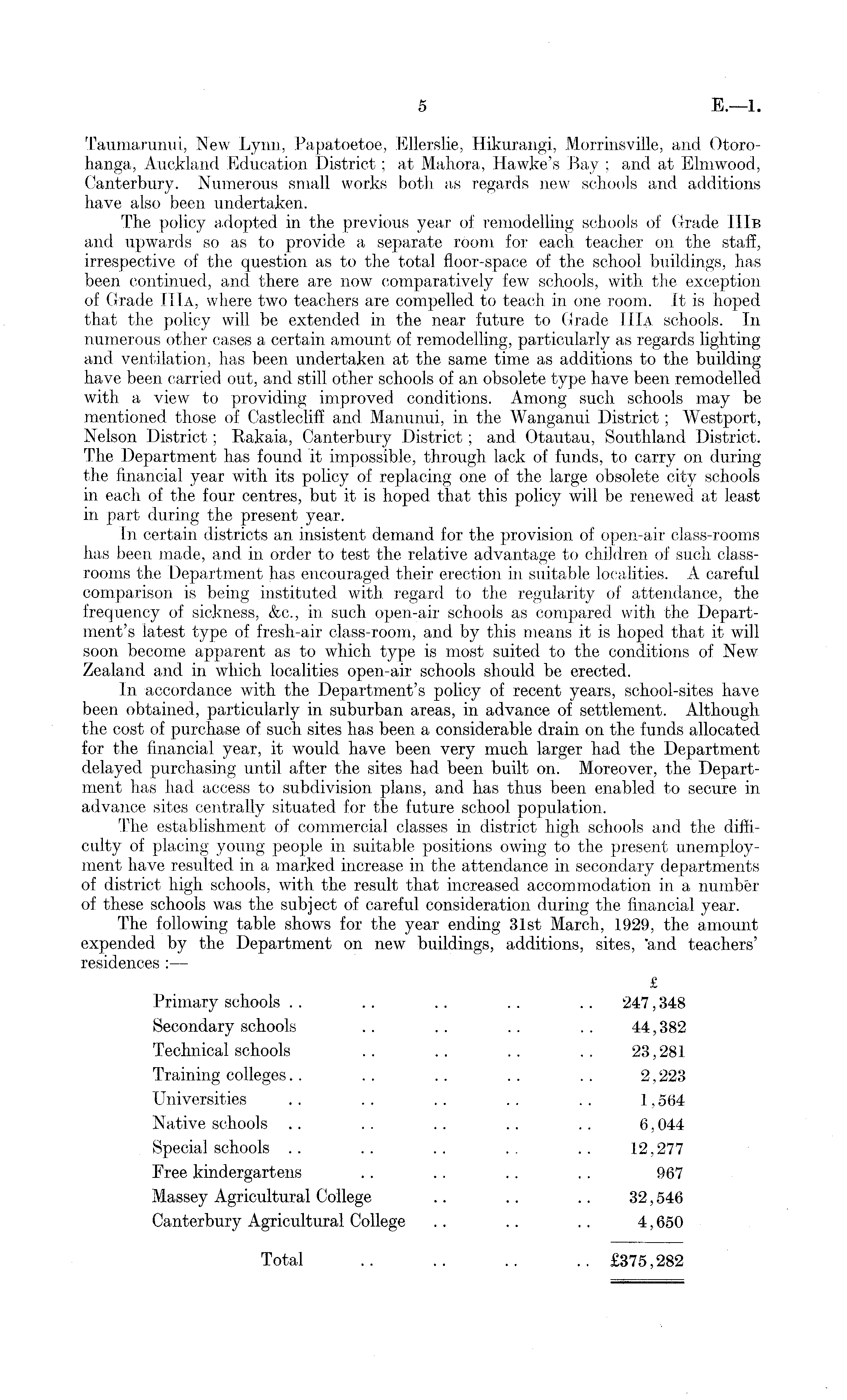 Taumarunui, New Lynn, Papatoetoe, Ellerslie, Hikurangi, Morrinsville, and Otorohanga, Auckland Education District ; at Mahora, Hawke's Bay ; and at Elmwood, Canterbury. Numerous small works both as regards new schools and additions have also been undertaken. The policy adopted in the previous year of remodelling schools of Grade IIIb and upwards so as to provide a separate room for each teacher on the staff, irrespective of the question as to the total floor-space of the school buildings, has been continued, and there are now comparatively few schools, with the exception of Grade IIIa, where two teachers are compelled to teach in one room. It is hoped that the policy will be extended in the near future to Grade IIIa schools. In numerous other cases a certain amount of remodelling, particularly as regards lighting and ventilation, has been undertaken at the same time as additions to the building have been carried out, and still other schools of an obsolete type have been remodelled with a view to providing improved conditions. Among such schools may be mentioned those of Castlecliff and Manunui, in the Wanganui District ; Westport, Nelson District; Rakaia, Canterbury District; and Otautau, Southland District. The Department has found it impossible, through lack of funds, to carry on during the financial year with its policy of replacing one of the large obsolete city schools in each of the four centres, but it is hoped that this policy will be renewed at least in part during the present year. In certain districts an insistent demand for the provision of open-air class-rooms has been made, and in order to test the relative advantage to children of such classrooms the Department has encouraged their erection in suitable localities. A careful comparison is being instituted with regard to the regularity of attendance, the frequency of sickness, &c., in such open-air schools as compared with the Department's latest type of fresh-air class-room, and by this means it is hoped that it will soon become apparent as to which type is most suited to the conditions of New Zealand and in which localities open-air schools should be erected. In accordance with the Department's policy of recent years, school-sites have been obtained, particularly in suburban areas, in advance of settlement. Although the cost of purchase of such sites has been a considerable drain on the funds allocated for the financial year, it would have been very much larger had the Department delayed purchasing until after the sites had been built on. Moreover, the Department has had access to subdivision plans, and has thus been enabled to secure in advance sites centrally situated for the future school population. The establishment of commercial classes in district high schools and the difficulty of placing young people in suitable positions owing to the present unemployment have resulted in a marked increase in the attendance in secondary departments of district high schools, with the result that increased accommodation in a number of these schools was the subject of careful consideration during the financial year. The following table shows for the year ending 31st March, 1929, the amount expended by the Department on new buildings, additions, sites, "and teachers' residences : — £ Primary schools .. .. .. .. .. 247,348 Secondary schools . . . . . . . . 44,382 Technical schools .. .. .. .. 23,281 Training colleges. . .. .. .. . . 2,223 Universities . . . . . . . . . . 1,564 Native schools .. . . .. .. . . 6,044 Special schools .. .. .. .. .. 12,277 Eree kindergartens . . . . . . . . 967 Massey Agricultural College .. .. .. 32,546 Canterbury Agricultural College . . .. . . 4,650 Total .. .. .. .. £375,282