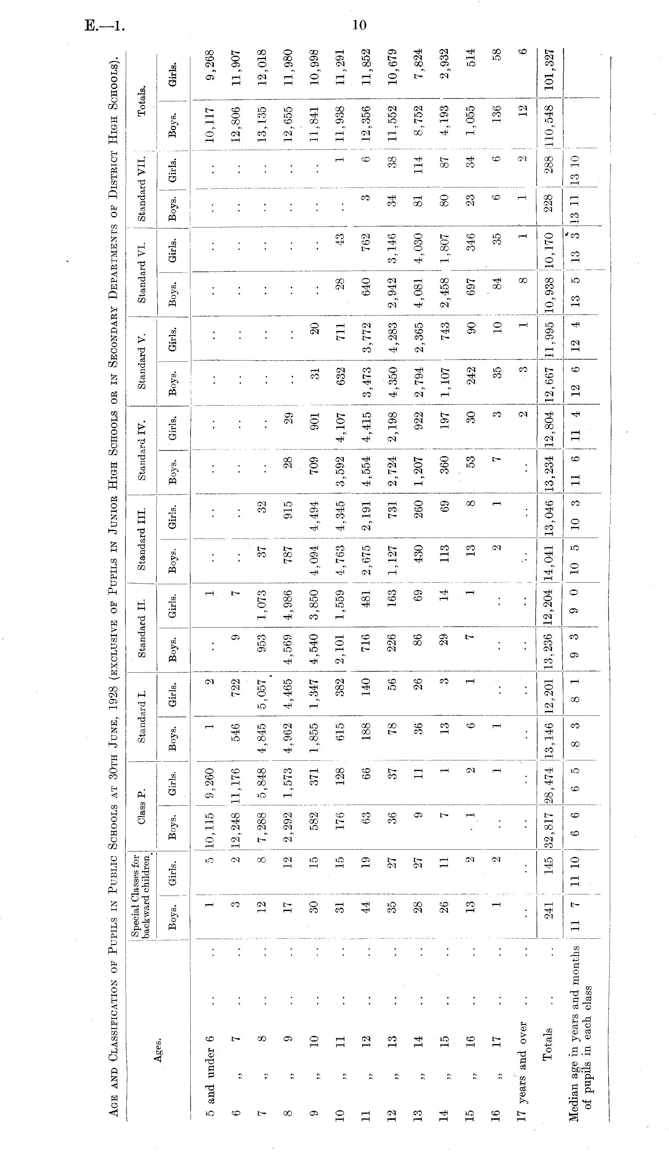 Class P. Standard I. Standard II. Standard III. Standard IV. Standard V. Standard VI. Standard VII. Totals. Ages. 1 ; : :—: —; p ; ; Boys. I Girls. Boys. Girls. Boys. Girls. Boys. Girls. Boys. Girls. Boys. Girls. Boys. Girls. Boys, j Girls. Boys. j Girls. Boys. Girls. 5 and under 6 .. . . 1 5 10,115 9,260 1 2 .. 1 .. | .. .. 10,117 9,268 | 6 „ 7 .. .. | 3 2 12,248 11,176 546 722 9 7 12,806 11,907 7 „ 8 .. ..12 8 7,288 5,848 4,845 5,057 953 1,073 37 32 13,135 12,018 8 „ 9 .. .. ! 17 12 2,292 1,573 4,962 4,465 4,569 4,986 787 915 28 29 12,655 11,980 9 ,,.10 .. .. 30 15 582 371 1,855 1,347 4,540 3,850 4,094 4,494 709 901 31 20 11,841 10,998 10 „ 11 .. .. 31 15 176 128 615 382 2,101 1,559 4,763 4,345 3,592 4,107 632 711 28 13 1 11,938 11,291 I i 11 12 .. .. 44 19 63 66 188 140 716 481 | 2,675 2,191 4,554 4,415 3,473 3,772 640 762 3 ; 6 12,356 11,852 j . 12 13 .. .. 35 27 36 37 78 56 226 163 1 1,127 731 2,724 2,198 4,350 4,283 2,942 3,146 34! 38 11,552 10,679 13 ,,.14 .. .. 28 27 9 11 36 26 86 69 430 260 1,207 922 2,794 2,365 4,081 4,030 81 114 8,752 7,824 14 „ 15 26 11 7 1 13 3 29 14 113 69 360 197 1,107 743 2,458 1,807 80 87 4,193 2,932 15 „ 16 ..13 2-1 2 6 1 7 1 13 8 53 30 242 90 697 346 23 34 1,055 514 16 17 .. .. 1 2 1 1 2 1 7 3 35 10 84 35 6 6 136 58 17 years and over .. .. .. .. .. .. .. .. .. .. -.. .. .. 2 3 1 8 1 1 2 j 12 6 Totals .. .. 241 j 145 32,817 28,474 13,146 12,201 13,236 12,204,14,041 13,046 13,234 12,804 12,667 11,995 10,938 10,170 228 288 1110,548 101,327 Median age in years and months 11 7 11 10 6 6 6 5 8 3 8 1 9 3 9 0 10 5 10 3 11 6 11 4 12 6 12 4 13 5 | 13 3 13 11 13 10 j of pupils in each class