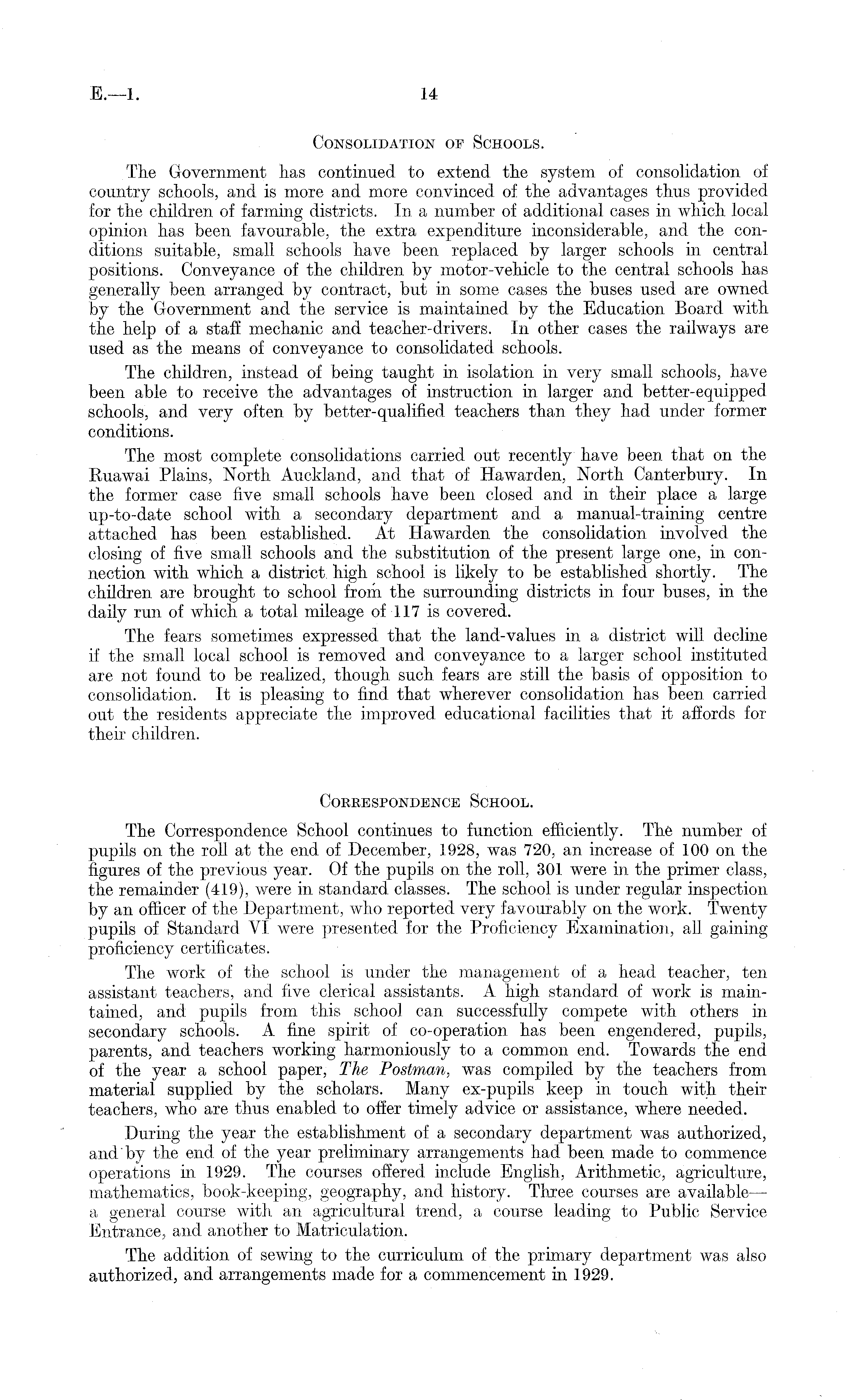 Consolidation or Schools. The Government lias continued to extend the system of consolidation of country schools, and is more and more convinced of the advantages thus provided for the children of farming districts. In. a number of additional cases in which local opinion has been favourable, the extra expenditure inconsiderable, and the conditions suitable, small schools have been replaced by larger schools in central positions. Conveyance of the children by motor-vehicle to the central schools has generally been arranged by contract, but in some cases the buses used are owned by the Government and the service is maintained by the Education Board with the help of a staff mechanic and teacher-drivers. In other cases the railways are used as the means of conveyance to consolidated schools. The children, instead of being taught in isolation hi very small schools, have been able to receive the advantages of instruction in larger and better-equipped schools, and very often by better-qualified teachers than they had under former conditions. The most complete consolidations carried out recently have been that on the Ruawai Plains, North Auckland, and that of Hawarden, North Canterbury. In the former case five small schools have been closed and in their place a large up-to-date school with a secondary department and a manual-training centre attached has been established. At Hawarden the consolidation involved the closing of five small schools and the substitution of the present large one, in connection with which a district high school is likely to be established shortly. The children are brought to school from the surrounding districts in four buses, in the daily run of which a total mileage of 117 is covered. The fears sometimes expressed that the land-values in a district will decline if the small local school is removed and conveyance to a larger school instituted are not found to be realized, though such fears are still the basis of opposition to consolidation. It is pleasing to find that wherever consolidation has been carried out the residents appreciate the improved educational facilities that it affords for their children. Correspondence School. The Correspondence School continues to function efficiently. The number of pupils on the roll at the end of December, 1928, was 720, an increase of 100 on the figures of the previous year. Of the pupils on the roll, 301 were in the primer class, the remainder (419), were in standard classes. The school is under regular inspection by an officer of the Department, who reported very favourably on the work. Twenty pupils of Standard VI were presented for the Proficiency Examination, all gaining proficiency certificates. The work of the school is under the management of a head teacher, ten assistant teachers, and five clerical assistants. A high standard of work is maintained, and pupils from this school can successfully compete with others in secondary schools. A fine spirit of co-operation has been engendered, pupils, parents, and teachers working harmoniously to a common end. Towards the end of the year a school paper, The Postman, was compiled by the teachers from material supplied by the scholars. Many ex-pupils keep in touch with their teachers, who are thus enabled to offer timely advice or assistance, where needed. During the year the establishment of a secondary department was authorized, and'by the end. of the year preliminary arrangements had been made to commence operations in 1929. The courses offered include English, Arithmetic, agriculture, mathematics, book-keeping, geography, and history. Three courses are available — a general course with an agricultural trend, a course leading to Public Service Entrance, and another to Matriculation. The addition of sewing to the curriculum of the primary department was also authorized, and arrangements made for a commencement in 1929.
