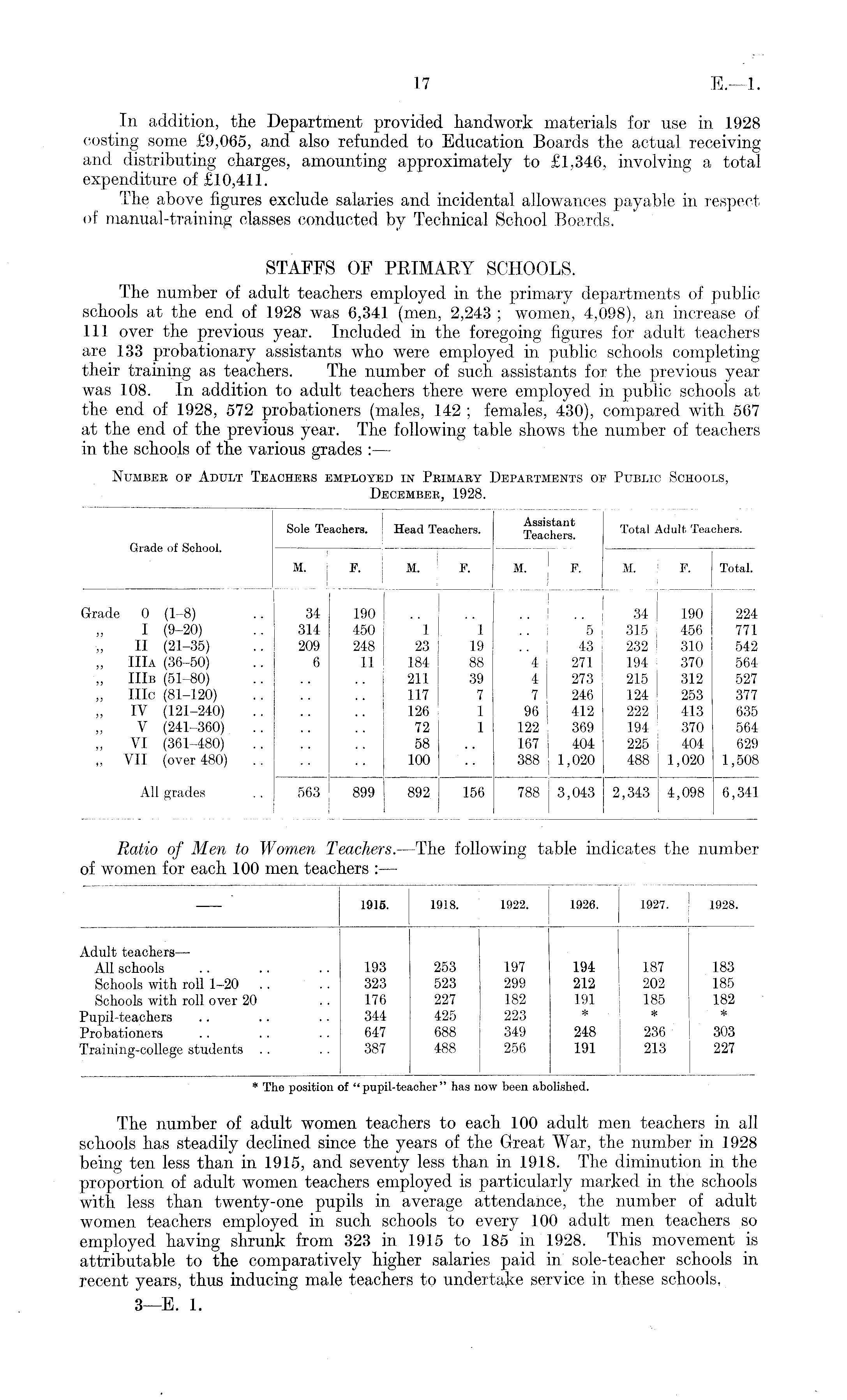 In addition, the Department provided handwork materials for use in 1928 costing some £9,065, and also refunded to Education Boards the actual receiving and distributing charges, amounting approximately to £1,346, involving a total expenditure of £10,411. The above figures exclude salaries and incidental allowances payable in respect of manual-training classes conducted by Technical School Boards. STAFFS OF PRIMARY SCHOOLS. The number of adult teachers employed in the primary departments of public schools at the end of 1928 was 6,341 (men, 2,243 ; women, 4,098), an increase of 111 over the previous year. Included in the foregoing figures for adult teachers are 133 probationary assistants who were employed in public schools completing their training as teachers. The number of such assistants for the previous year was 108. In addition to adult teachers there were employed in public schools at the end of 1928, 572 probationers (males, 142 ; females, 430), compared with 567 at the end of the previous year. The following table shows the number of teachers in the schools of the various grades : —