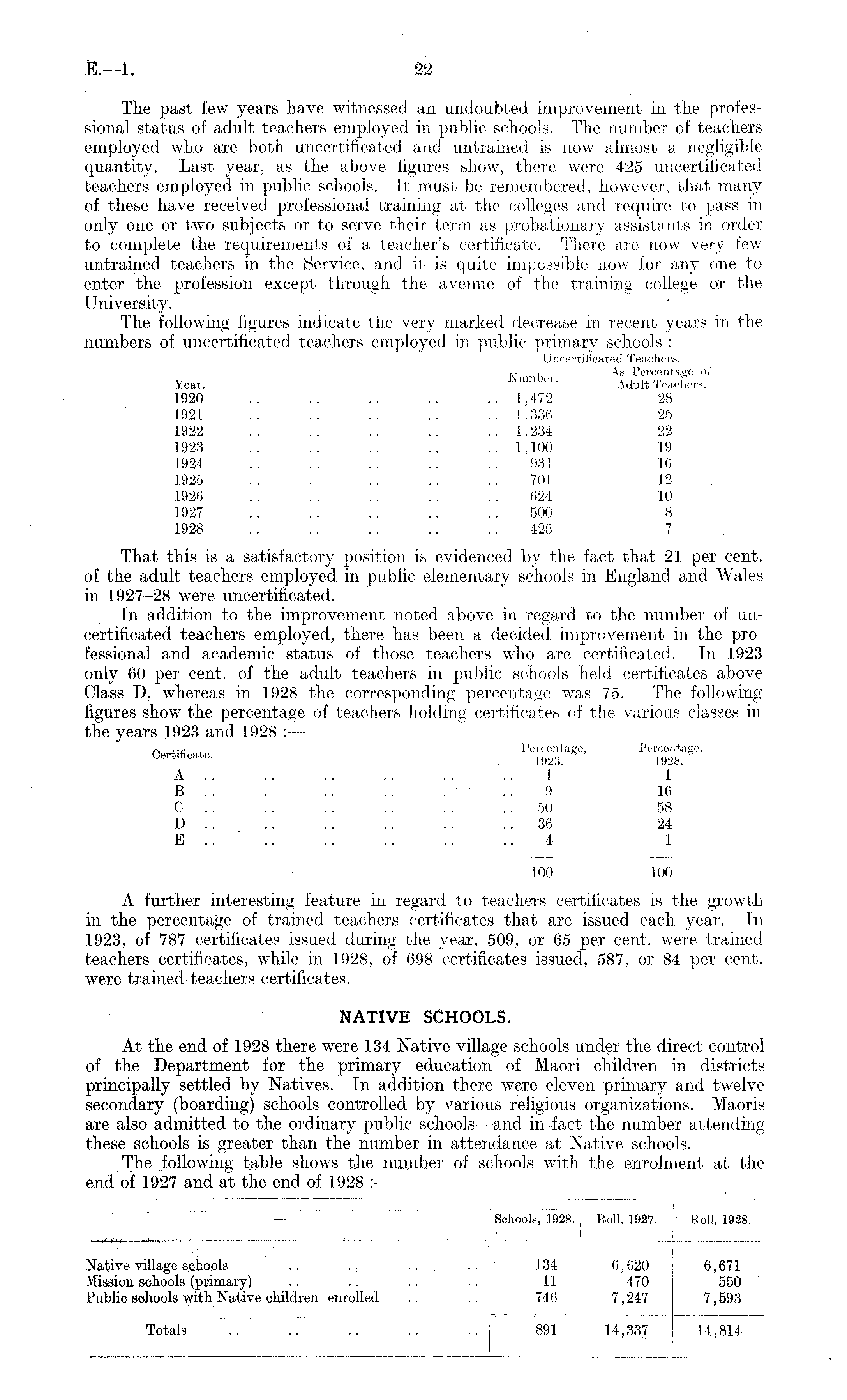 The past few years have witnessed an undoubted improvement in the professional status of adult teachers employed in public schools. The number of teachers employed who are both uncertificated and untrained is now almost a negligible quantity. Last year, as the above figures show, there were 425 uncertificated teachers employed in public schools. It must be remembered, however, that many of these have received professional training at the colleges and require to pass in only one or two subjects or to serve their term as probationary assistants in order to complete the requirements of a, teacher's certificate. There are now very few untrained teachers in the Service, and it is quite impossible now for any one to enter the profession except through the avenue of the training college or the University. The following figures indicate the very marked decrease in recent years in the numbers of uncertificated teachers employed in public primary schools :— Uncertificated Teachers. Kr , As Percentage of Year. um 11 ' Adult Teachers. 1920 .. .. .. .. .. 1,472 28 1921 .. .. .. .. .. 1,336 25 1922 .. .. .. .. .. 1,234 22 1923 .. .. .. .. ..1,100 19 1924 .. .. .. .. ..931 16 1925 .. .. .. .. .. 701 12 1926 .. .. .. .. 624 10 1927 .. .. .. .. 500 8 1928 .. .. .. .. 425 7 That this is a satisfactory position is evidenced by the fact that 21 per cent, of the adult teachers employed in public elementary schools in England and Wales in 1927-28 were uncertificated. In addition to the improvement noted above in regard to the number of uncertificated teachers employed, there has been a decided improvement in the professional and academic status of those teachers who are certificated. In 1923 only 60 per cent, of the adult teachers in public schools held certificates above Class D, whereas in 1928 the corresponding percentage was 75. The following figures show the percentage of teachers holding certificates of the various classes in the years 1923 and 1928 ~ , Percentage, Percentage, ig2g ]92g A .. .. .. 1 1 B .. .. .. .. 9 16 C .. .. .. .. .. .. 50 58 D .. .. .. .. .. .. 36 24 E .. .. .. .. 4 1 100 100 A further interesting feature in regard to teachers certificates is the growth in the percentage of trained teachers certificates that are issued each year. In 1923, of 787 certificates issued during the year, 509, or 65 per cent, were trained teachers certificates, while in 1928, of 698 certificates issued, 587, or 84 per cent, were trained teachers certificates. NATIVE SCHOOLS. At the end of 1928 there were 134 Native village schools under the direct control of the Department for the primary education of Maori children in districts principally settled by Natives. In addition there were eleven primary and twelve secondary (boarding) schools controlled by various religious organizations. Maoris are also admitted to the ordinary public schools —and in fact the number attending these schools is greater than the number in attendance at Native schools. The following table shows the number of schools with the enrolment at the end of 1927 and at the end of 1928 :—