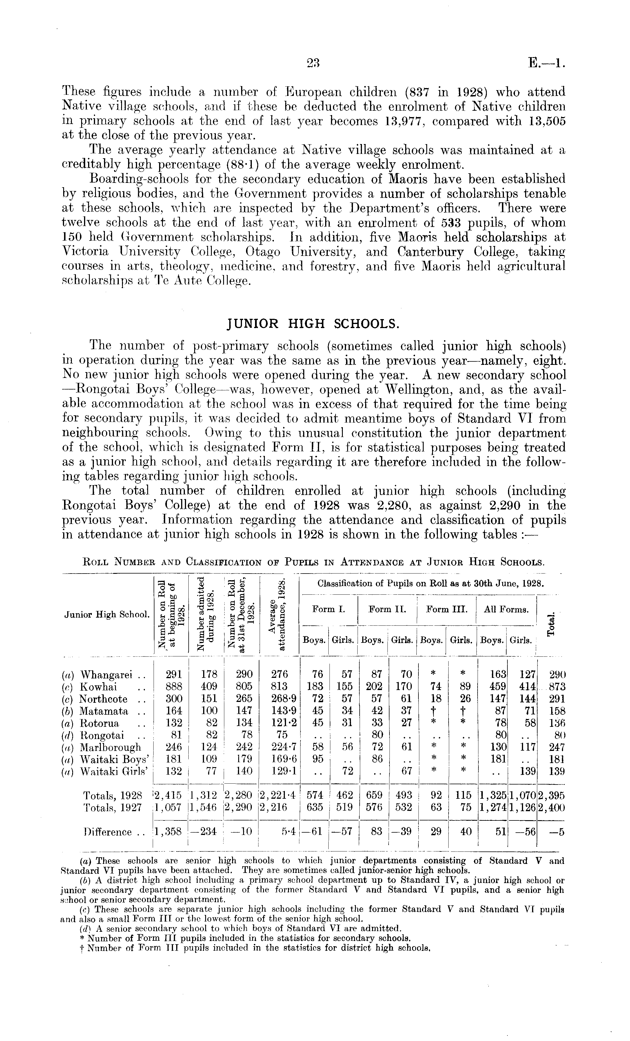 These figures include a number of European children (837 in 1928) who attend Native village schools, and if these be deducted the enrolment of Native children in primary schools at the end of last year becomes 13,977, compared with 13,505 at the close of the previous year. The average yearly attendance at Native village schools was maintained at a creditably high percentage (88-1) of the average weekly enrolment. Boarding-schools for the secondary education of Maoris have been established by religious bodies, and the Government provides a number of scholarships tenable at these schools, which are inspected by the Department's officers. There were twelve schools at the end of last year, with an enrolment of 533 pupils, of whom 150 held Government scholarships. In addition, five Maoris held scholarships at Victoria University College, Otago University, and Canterbury College, taking courses in arts, theology, medicine, and forestry, and five Maoris held agricultural scholarships at Te Ante College. JUNIOR HIGH SCHOOLS. The number of post-primary schools (sometimes called junior high schools) in operation during the year was the same as in the previous year —namely, eight. No new junior high schools were opened during the year. A new secondary school —Rongotai Boys' College—was, however, opened at Wellington, and, as the available accommodation at the school was in excess of that required for the time being for secondary pupils, it was decided to admit meantime boys of Standard VI from neighbouring schools. Owing to this unusual constitution the junior department of the school, which is designated Form 11, is for statistical purposes being treated as a junior high school, and details regarding it are therefore included in the following tables regarding junior high schools. The total number of children enrolled at junior high schools (including Rongotai Boys' College) at the end of 1928 was 2,280, as against 2,290 in the previous year. Information regarding the attendance and classification of pupils in attendance at junior high schools in 1928 is shown in the following tables :■ —