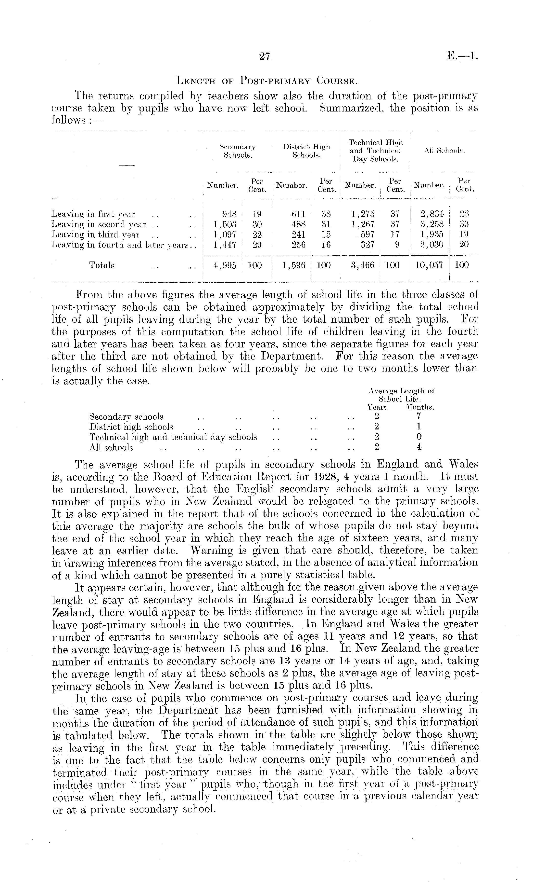 From the above figures the average length of school life in the three classes of post-primary schools can be obtained approximately by dividing the total school life of all pupils leaving during the year by the total number of such pupils. For the purposes of this computation the school life of children leaving in the fourth and later years has been taken as four years, since the separate figures for each year after the third are not obtained by the Department. For this reason the average lengths of school life shown below will probably be one to two months lower than is actually the case. Average Length of School Life. Years. Months. Secondary schools .. .. .. .. .. 2 7 District high schools . . .. .. .. .. 2 1 Technical high and technical day schools .. .. .. 2 0 All schools .. . . .. .. .. . . 2 4 The average school life of pupils in secondary schools in England and Wales is, according to the Board of Education Eeport for 1928, 4 years 1 month. It must be understood, however, that the English secondary schools admit a very large number of pupils who in New Zealand would be relegated to the primary schools. It is also explained in the report that of the schools concerned in the calculation of this average the majority are schools the bulk of whose pupils do not stay beyond the end of the school year in which they reach the age of sixteen years, and many leave at an earlier date. Warning is given that care should, therefore, be taken in drawing inferences from the average stated, in the absence of analytical information of a kind which cannot be presented in a purely statistical table. It appears certain, however, that although for the reason given above the average length of stay at secondary schools in England is considerably longer than in New Zealand, there would appear to be little difference in the average age at which pupils leave post-primary schools in the two countries. In England and Wales the greater number of entrants to secondary schools are of ages 11 years and 12 years, so that the average leaving-age is between 15 plus and 16 plus. In New Zealand the greater number of entrants to secondary schools are 13 years or 14 years of age, and, taking the average length of stay at these schools as 2 plus, the average age of leaving postprimary schools in New Zealand is between 15 plus and 16 plus. In the case of pupils who commence on post-primary courses and leave during the same year, the Department has been furnished with information showing in months the duration of the period of attendance of such pupils, and this information is tabulated below. The totals shown in the table are slightly below those shown as leaving in the first year in the table. immediately preceding. This difference is clue to the fact that the table below concerns only pupils who commenced and terminated their post-primary courses in the same year, while the table above includes under" first year" pupils who, though in the first year of a post-primary course when they left, actually commenced that course in a previous calendar year or at a private secondary school.