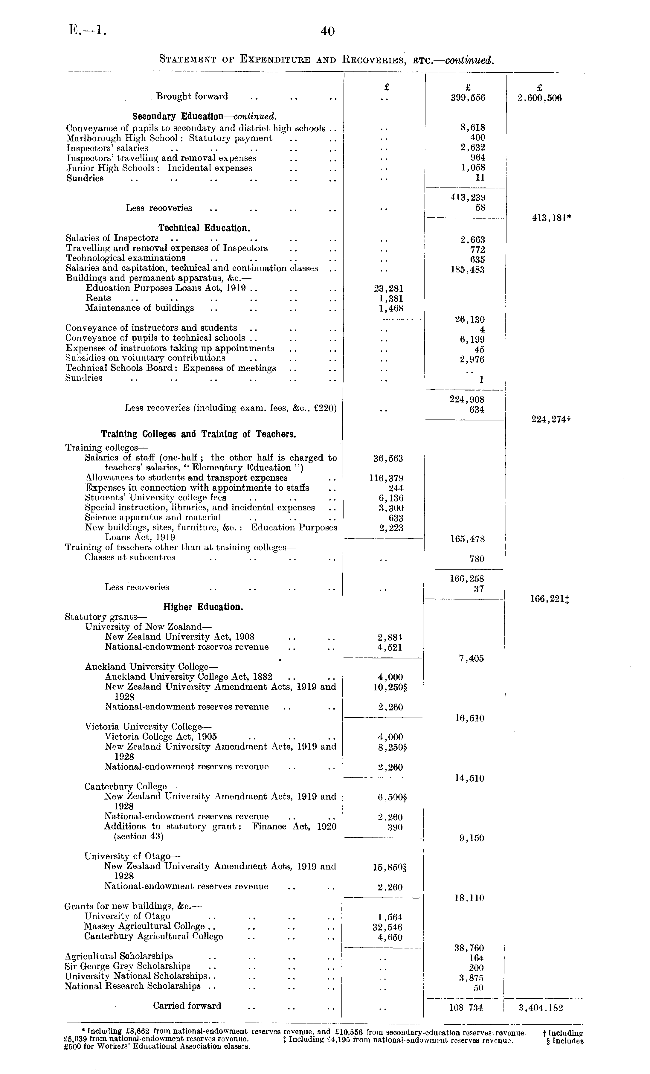 £ £ £ Brought forward .. .. .. .. 399,556 2,600,506 Secondary Education —continued. Conveyance of pupils to secondary and district high schools .. • • 8,618 Marlborough High School: Statutory payment .. .. ■ • 400 Inspectors' salaries .. .. .. .. .. •• 2,632 Inspectors' travelling and removal expenses .. .. • • 964 Junior High Schools: Incidental expenses .. .. ■■ 1,058 Sundries .. .. .. .. .. .. • • 11 413,239 Less recoveries .. .. .. .. • • 58 413,181* Technical Education. Salaries of Inspectors .. .. .. .. .. .. 2,663 Travelling and removal expenses of Inspectors .. .. .. 772 Technological examinations .. .. .. .. .. (535 Salaries and capitation, technical and continuation classes .. .. 185,483 Buildings and permanent apparatus, &c.—• Education Purposes Loans Act, 1919 .. .. .. 23,281 Rents .. .. .. .. .. .. 1,381 Maintenance of buildings .. .. .. .. 1,468 26,130 Conveyance of instructors and students .. .. .. . . 4 Conveyance of pupils to technical schools .. . . .. .. 6,199 Expenses of instructors taking up appointments .. .. .. 45 Subsidies on voluntary contributions .. .. .. .. 2,976 Technical Schools Board: Expenses of meetings Sundries .. .. .. .. .. .. .. 1 224,908 Less recoveries (including exam, fees, &c., £220) .. 634 224,274f Training Colleges and Training of Teachers. Training colleges— Salaries of staff (one-half ; the other half is charged to 36,563 teachers' salaries, " Elementary Education ") Allowances to students and transport expenses .. 116,379 Expenses in connection with appointments to staffs .. 244 Students'University college fees .. .. .. 6,136 Special instruction, libraries, and incidental expenses .. 3,300 Science apparatus and material .. .. .. 633 New buildings, sites, furniture, &c. : Education Purposes 2,223 Loans Act, 1919 165,478 Training of teachers other than at training colleges— Classes at subcentres .. .. .. .. .. 780 166,258 Less recoveries .. .. .. .. . . 37 166,221+ Higher Education. Statutory grants— University of New Zealand— New Zealand University Act, 1908 .. .. 2,881 National-endowment reserves revenue .. .. 4,521 7,405 Auckland University College— Auckland University College Act, 1882 .. .. 4,000 New Zealand University Amendment Acts, 1919 and 10,250§ 1928 National-endowment reserves revenue .. .. 2,260 16,510 Victoria University College— Victoria College Act, 1905 .. .. .. 4,000 New Zealand University Amendment Acts, 1919 and 8,250§ 1928 National-endowment reserves revenue .. .. 2,260 14,510 Canterbury College— New Zealand University Amendment Acts, 1919 and 6,500§ 1928 National-endowment reserves revenue .. .. 2,260 Additions to statutory grant: Finance Act, 1920 390 (section 43) 9,150 University of Otago— New Zealand University Amendment Acts, 1919 and 15,850§ 1928 National-endowment reserves revenue .. .. 2,260 18,110 Grants for new buildings, &c.— University of Otago .. .. .. .. 1,564 Massey Agricultural College .. .. .. .. 32,546 Canterbury Agricultural College .. .. .. 4,650 38,760 Agricultural Scholarships .. .. .. .. .. 164 j Sir George Grey Scholarships .. . . .. .. . . 200 University National Scholarships.. .. .. .. .. 3,875 I National Research Scholarships .. .. .. .. .. 50 Carried forward .. .. .. 108 734 1 3,404,182 * including £8,662 from national-endowment reserves revenue, _ and £10,556 from secondary-education reserves revenue- f Including £5,039 from national-endowment reserves revenue. X Including £4,195 from national-endowment reserves revenue. § Includes £500 for Workers' Educational Association classes.