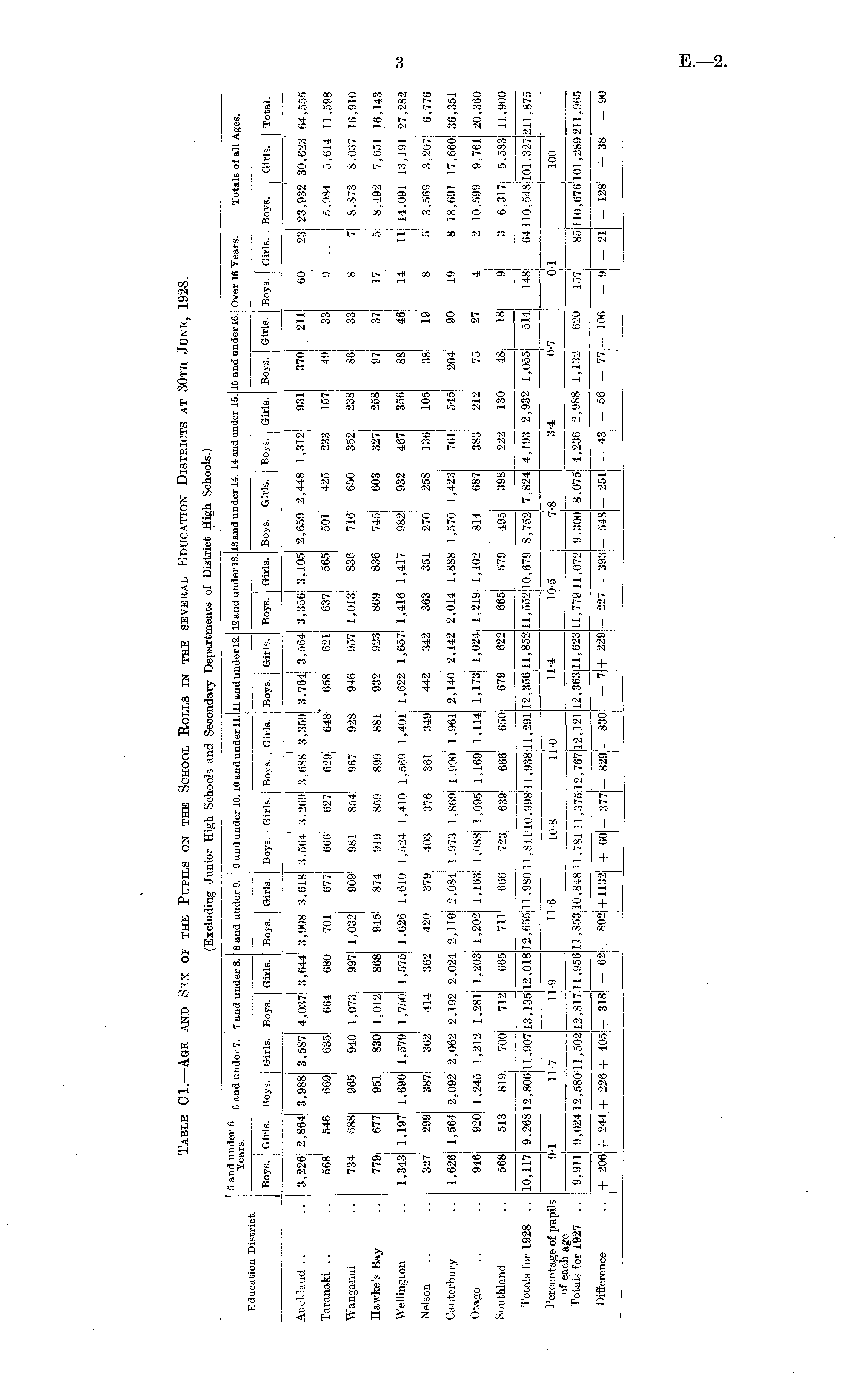 (Excluding Junior High Schools and Secondary Departments of District High Schools.) 5aD Years er6 6 and under 7. 7 and under 8. 8 and under 9. 9 andunder 10. 10 and under 11. 11 and under 12. 12and under 13.13and under 14. 14 and under 15. 15 and under 16. Over 16 Years. Totals of all Ages. Education District. 1 : Boys. Girls. Boys. Girls. Boys. Girls. Boys. Girls. Boys. Girls. Boys, i Girls. Boys. Girls. Boys. Girls. Boys. Girls. Boys. Girls. Boys. Girls. Boys. I Girls. Boys. Girls. Total. J ; I Auckland.. .. 3,226 2,864 3,988 3,587 4,037 3,644 3,908 3,618 3,564 3,269 3,688 3,359 3,764 3,564 3,356 3,105 2,659 2,448 1,312 931 370 211 60 23 23,932 30,623 64,555 Taranaki .. .. 568 546 669 635 664 680 701 677 666 627 629 648' 658 621 637 565 501 425 233 157 49 33 9 .. 5,984 5,614 11,598 . Wanganui .. 734 688 965 940 1,073 997 1,032 909 981 854 967 928 946 957 1,013 836 716 650 352 238 86 33 8 7 8,873 8,037 16,910 Hawke's Bay .. 779 677 951 830 1,012 868 945 874 919 859 899 881 932 923 869 836 745 603 327 258 97 37 17 5 8,492 7,651 16,143 Wellington .. 1,343 1,197 1,690 1,579 1,750 1,575 1,626 1,610 1,524 1,410 1,569; 1,401 1,622 1,657 1,416 1,417 982 932 467 356 88 46 14 11 14,091 13,191 27,282 Nelson .. .. 327 299 387 362 414 362 420 379 403 376 361 349 442 342 363 351 270 258 136 105 38 19 8 5 3,569 3,207 6,776 Canterbury .. 1,626 1,564 2,092 2,062 2,192 2,024 2,110 2,084 1,973 1,869 1,990 1,961 2,140 2,142 2,014 1,888 1,570 1,423 761 545 204 90 19 8 18,691 17,660 36,351 Otago .. .. 946 920 1,245 1,212 1,281 1,203 1,202 1,163 1,088 1,095 1,169 1,114 1,173 1,024 1,219 1,102 814 687 383 212 75 27 4 2 10,599 9,761 20,360 Southland .. 568 513 819 700 712 665 711 666 723 639 666 650 679 622 665 579 495 398 222 130 48 18 9 3 6,317 5,583 11,900 Totals for 1928 .. 10,117 9,26812,806 11,907 13,135 12,018 12,655 11,98ojll ,84110,998 11,938 11,291 12,356| 1X,852 11,552 10,679 8,752 7,824 4,193 2,932 1,055 514 148 64110,548101,327 211,875 Percentage of pupils 9-1 11-7 11-9 11-6 10-8 11-0 H'4 10-5 7-8 3-4 0-7 0-1 j 100 of 6£tcll | . ■ __ ) —. —- —— . 1 ' Totals for 1927 .. 9,91lj 9,024 12,580 11,502 12,817 11,956 11,853 10,848 11,781 111, 375 12,767 12,121 12,363 11,623 11,779 11,072 9,300 8,075 4,236| 2,988 1,132] 620 157 85110,676101,289211,965 Difference .. + 206;+ 244+ 226+ 405 + 318 + 62+ 802+1132 + 60- 377- 829- 830 - 7 + 229- 227 - 393- 548- 251 - 43 - 56 - 77 - 106 _ 9 - 21 - 128 + 38 - 90 I 1 | j