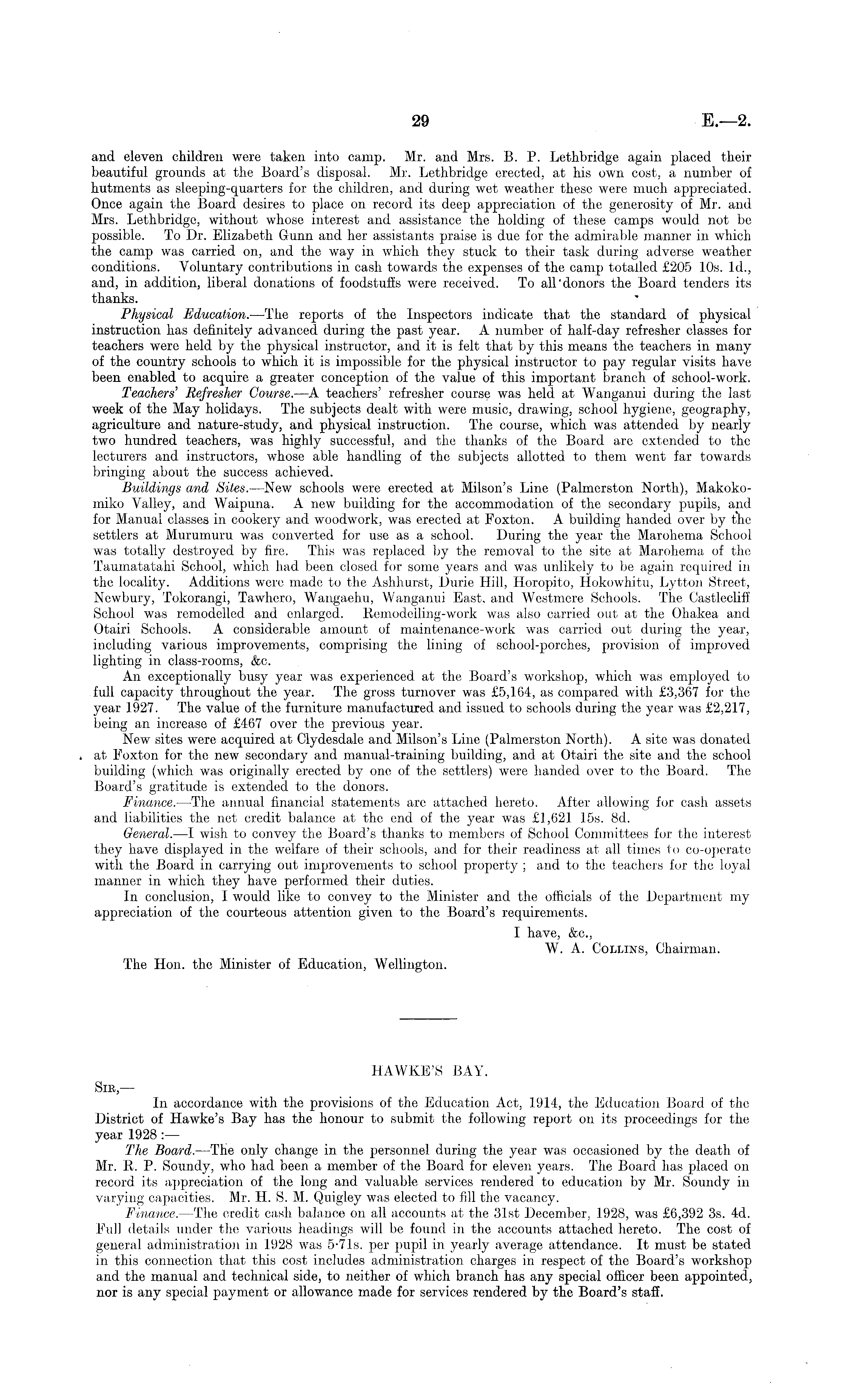 and eleven children were taken into camp. Mr. and Mrs. B. P. Lethbridge again placed their beautiful grounds at the .Board's disposal. Mr. Lethbridge erected, at his own cost, a number of hutments as sleeping-quarters for the children, and during wet weather these were much appreciated. Once again the Board desires to place on record its deep appreciation of the generosity of Mr. and Mrs. Lethbridge, without whose interest and assistance the holding of these camps would not be possible. To Dr. Elizabeth Gunn and her assistants praise is due for the admirable manner in which the camp was carried on, and the way in which they stuck to their task during adverse weather conditions. Voluntary contributions in cash towards the expenses of the camp totalled £205 10s. Id., and, in addition, liberal donations of foodstuffs were received. To all'donors the Board tenders its thanks. Physical Education. —The reports of the Inspectors indicate that the standard of physical instruction has definitely advanced during the past year. A number of half-day refresher classes for teachers were held by the physical instructor, and it is felt that by this means the teachers in many of the country schools to which it is impossible for the physical instructor to pay regular visits have been enabled to acquire a greater conception of the value of this important branch of school-work. Teachers' Refresher Course. —A teachers' refresher course was held at Wanganui during the last week of the May holidays. The subjects dealt with were music, drawing, school hygiene, geography, agriculture and nature-study, and physical instruction. The course, which was attended by nearly two hundred teachers, was highly successful, and the thanks of the Board are extended to the lecturers and instructors, whose able handling of the subjects allotted to them went far towards bringing about the success achieved. Buildings and Sites. —New schools were erected at Milson's Line (Palmerston North), Makokomiko Valley, and Waipuna. A new building for the accommodation of the secondary pupils, and for Manual classes in cookery and woodwork, was erected at Foxton. A building handed over by the settlers at Murumuru was converted for use as a school. During the year the Marohema School was totally destroyed by fire. This was replaced by the removal to the site at Marohema of the Tauinatatahi School, which had been closed for some years and was unlikely to be again required in the locality. Additions were made to the Ashhurst, Durie Hill, Horopito, Hokowhitu, Lytton Street, Newbury, Tokorangi, Tawhero, Wangaehu, Wanganui East, and Westmere Schools. The Castlecliff School was remodelled and enlarged. Remodciling-work was also carried out at the Ohakea and Otairi Schools. A considerable amount of maintenance-work was carried out during the year, including various improvements, comprising the lining of school-porches, provision of improved lighting in class-rooms, &c. An exceptionally busy year was experienced at the Board's workshop, which was employed to full capacity throughout the year. The gross turnover was £5,164, as compared with £3,367 for the year 1927. The value of the furniture manufactured and issued to schools during the year was £2,217, being an increase of £467 over the previous year. New sites were acquired at Clydesdale and Milson's Line (Palmerston North). A site was donated at Foxton for the new secondary and manual-training building, and at Otairi the site and the school building (which was originally erected by one of the settlers) were handed over to the Board. The Board's gratitude is extended to the donors. Finance. —The annual financial statements are attached hereto. After allowing for cash assets and liabilities the net credit balance at the end of the year was £1,621 15s. Bd. General. —I wish to convey the Board's thanks to members of School Committees for the interest they have displayed in the welfare of their schools, and for their readiness at all times to co-operate with the Board in carrying out improvements to school property ; and to the teachers for the loyal manner in which they have performed their duties. In conclusion, I would like to convey to the Minister and the officials of the Department my appreciation of the courteous attention given to the Board's requirements. 1 have, &c., W. A. Collins, Chairman. The Hon. the Minister of Education, Wellington. HAWKE'S BAY. Sir, — In accordance with the provisions of the Education Act, 1914, the Education Board of the District of Hawke's Bay has the honour to submit the following report on its proceedings for the year 1928 :• —• The Board. —The only change in the personnel during the year was occasioned by the death of Mr. R. P. Soundy, who had been a member of the Board for eleven years. The Board has placed on record its appreciation of the long and valuable services rendered to education by Mr. Soundy in varying capacities. Mr. H. S. M. Quigley was elected to fill the vacancy. Finance. —The credit cash balance on all accounts at the 31st December, 1928, was £6,392 3s. 4d. Full details under the various headings will be found in the accounts attached hereto. The cost of general administration in 1928 was 5-71s. per pupil in yearly average attendance. It must be stated in this connection that this cost includes administration charges in respect of the Board's workshop and the manual and technical side, to neither of which branch has any special officer been appointed, nor is any special payment or allowance made for services rendered by the Board's staff.