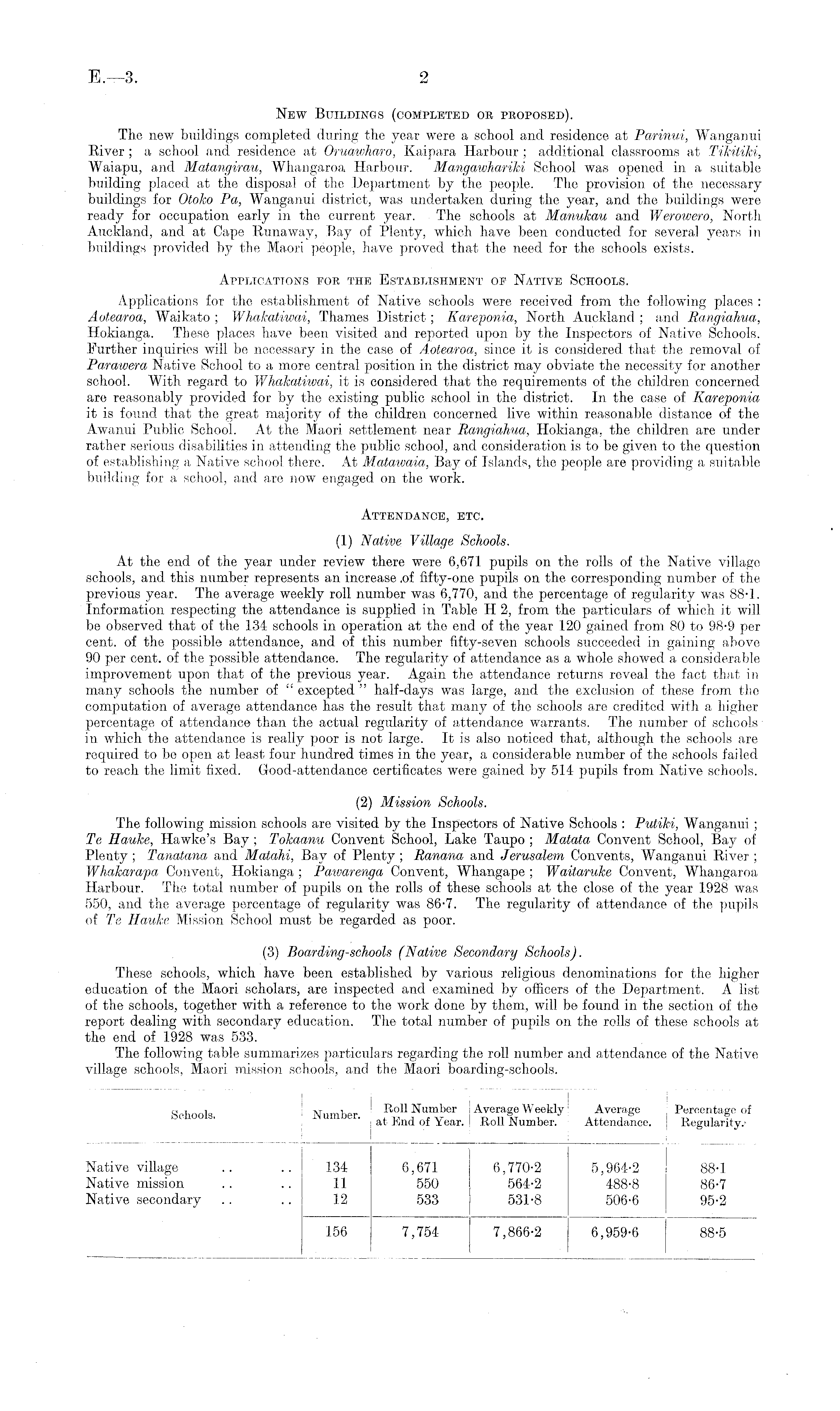 New Buildings (completed or proposed). The new buildings completed during the year were a school and residence at Parinui, Wanganui River ; a school and residence at Oruawharo, Kaipara Harbour ; additional classrooms at Tikitiki, Waiapu, and Matangirau, Whangaroa Harbour. Mangawhariki School was opened in a suitable building placed at the disposal of the Department by the people. The provision of the necessary buildings for Otoko Pa, Wanganui district, was undertaken during the year, and the buildings were ready for occupation early in the current year. The schools at Manukau and Werowero, North Auckland, and at Cape Runaway, Bay of Plenty, which have been conducted for several years in buildings provided by the Maori people, have proved that the need for the schools exists. Applications for the Establishment op Native Schools. Applications for the establishment of Native schools were received from the following places : Aotearoa, Waikato; Whakatiwai, Thames District; Kareponia, North Auckland ; and Rangiahua, Hokianga. These places have been visited and reported upon by the Inspectors of Native Schools. Further inquiries will be necessary in the case of Aotearoa, since it is considered that the removal of Parawera Native School to a more central position in the district may obviate the necessity for another school. With regard to Whakatiwai, it is considered that the requirements of the children concerned are reasonably provided for by the existing public school in the district. In the case of Kareponia it is found that the great majority of the children concerned live within reasonable distance of the Awanui Public School. At the Maori settlement near Rangiahua, Hokianga, the children are under rather serious disabilities in attending the public school, and consideration is to be given to the question of establishing a Native school there. At Matawaia, Bay of Islands, the people are providing a suitable building for a school, and are now engaged on the work. Attendance, etc. (1) Native Tillage Schools. At the end of the year under review there were 6,671 pupils on the rolls of the Native village schools, and this number represents an increase .of fifty-one pupils on the corresponding number of the previous year. The average weekly roll number was 6,770, and the percentage of regularity was 88-1. Information respecting the attendance is supplied in Table H 2, from the particulars of which it will be observed that of the 13-4 schools in operation at the end of the year 120 gained from. 80 to 98-9 per cent, of the possible attendance, and of this number fifty-seven schools succeeded in gaining above 90 per cent, of the possible attendance. The regularity of attendance as a whole showed a considerable improvement upon that of the previous year. Again the attendance returns reveal the fact that in many schools the number of " excepted " half-days was large, and the exclusion of these from the computation of average attendance has the result that many of the schools are credited with a higher percentage of attendance than the actual regularity of attendance warrants. The number of schools in which the attendance is really poor is not large. It is also noticed that, although the schools are required to be open at least four hundred times in the year, a considerable number of the schools failed to reach the limit fixed. Good-attendance certificates were gained by 514 pupils from Native schools. (2) Mission Schools. The following mission schools are visited by the Inspectors of Native Schools : Putiki, Wanganui ; Te Hauke, Hawke's Bay ; Tokaanu Convent School, Lake Taupo ; Matata Convent School, Bay of Plenty; Tanatana and Matahi, Bay of Plenty; Ranana and Jerusalem Convents, Wanganui River; Whakarapa Convent, Hokianga ; Pawarenga Convent, Whangape ; Waitaruke Convent, Whangaroa Harbour. The total number of pupils on the rolls of these schools at the close of the year 1928 was 550, and the average percentage of regularity was 86-7. The regularity of attendance of the pupils of Te Hauke Mission School must be regarded as poor. (3) Boarding-schools (Native Secondary Schools). These schools, which have been established by various religious denominations for the higher education of the Maori, scholars, are inspected and examined by officers of the Department. A list of the schools, together with a reference to the work done by them, will be found in the section of the report dealing with secondary education. The total number of pupils on the rolls of these schools at the end of 1928 was 533. The following table summarizes particulars regarding the roll number and attendance of the Native village schools, Maori mission schools, and the Maori boarding-schools.