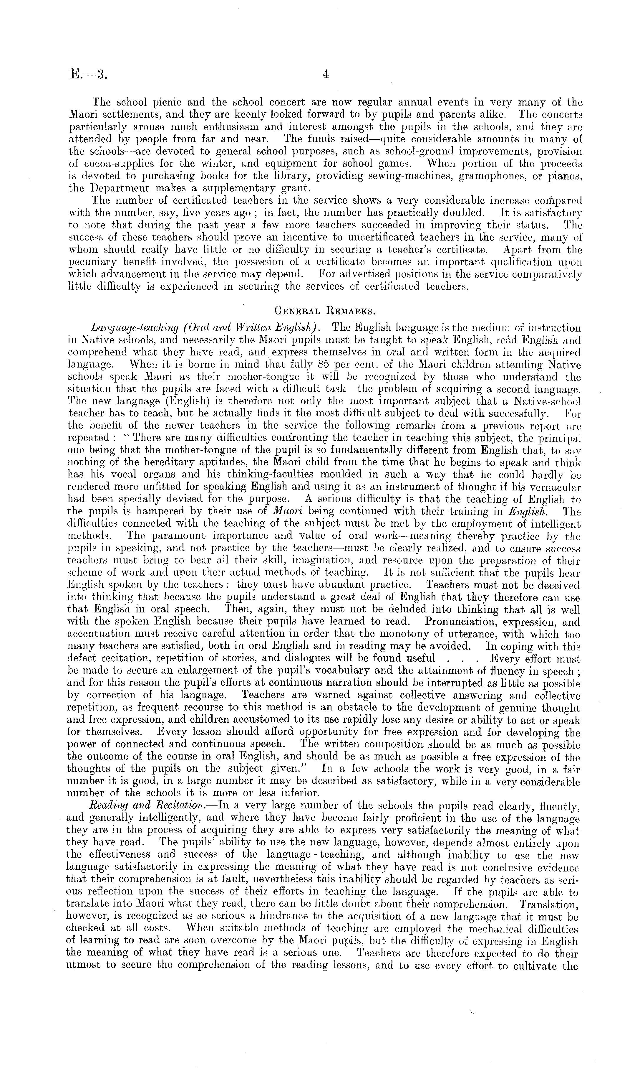 The school picnic and the school concert are now regular annual events in very many of the Maori settlements, and they are keenly looked forward to by pupils and parents alike. The concerts particularly arouse much enthusiasm and interest amongst the pupils in the schools, and they arc attended by people from far and near. The funds raised —quite considerable amounts in many of the schools —are devoted to general school purposes, such as school-ground improvements, provision of cocoa-supplies for the winter, and equipment for school games. When portion of the proceeds is devoted to purchasing books for the library, providing sewing-machines, gramophones, or pianos, the Department makes a supplementary grant. The number of certificated teachers in the service shows a very considerable increase coiftpared with the number, say, five, years ago ; in fact, the number has practically doubled. It is satisfactory to note that during the past year a few more teachers succeeded in improving their status. The success of these teachers should prove an incentive to uncertificated teachers in the service, many of whom should really have little or no difficulty in securing a teacher's certificate. Apart from the pecuniary benefit involved, the possession of a certificate becomes an important qualification upon which advancement in the service may depend. For advertised positions in the service comparatively little difficulty is experienced in securing the services of certificated teachers. General Remarks. Language-teaching (Oral and Written English). —The English language is the medium of instruction in Native schools, and necessarily the Maori pupils must be taught to speak English, read English and comprehend what they have read, and express themselves in oral and written form in the acquired language. When it is borne in mind that fully 85 per cent, of the Maori children attending Native schools speak Maori as their mother-tongue it will be recognized by those who understand the situation that the pupils are faced with a difficult task —the problem of acquiring a second language. The new language (English) is therefore not only the most important subject that a Native-school teacher has to teach, but he actually finds it the most difficult subject to deal with successfully. For the benefit of the newer teachers in the service the following remarks from a previous report are repeated : " There are many difficulties confronting the teacher in teaching this subject, the principal one being that the mother-tongue of the pupil is so fundamentally different from English that, to say nothing of the hereditary aptitudes, the Maori child from the time that he begins to speak and think has his vocal organs and his thinking-faculties moulded in such a way that he could hardly be rendered more unfitted for speaking English and using it as an instrument of thought if his vernacular had been specially devised for the purpose. A serious difficulty is that the teaching of English to the pupils is hampered by their use of Maori being continued with their training in English. The difficulties connected with the teaching of the subject must be met by the employment of intelligent methods. The paramount importance and value of oral work—meaning thereby practice by the pupils in speaking, and not practice by the teachers —must be clearly realized, and to ensure success teachers must bring to bear all their skill, imagination, and resource upon the preparation of their scheme of work and upon their actual methods of teaching. It is not sufficient that the pupils hear English spoken by the teachers : they must have abundant practice. Teachers must not be deceived into thinking that because the pupils understand a great deal of English that they therefore can use that English in oral speech. Then, again, they must not be deluded, into thinking that all is well with the spoken English because their pupils have learned to read. Pronunciation, expression, and accentuation must receive careful attention in order that the monotony of utterance, with which too many teachers are satisfied, both in oral English and in reading may be avoided. In coping with this defect recitation, repetition of stories, and dialogues will be found useful . . . Every effort must be made to secure an enlargement of the pupil's vocabulary and the attainment of fluency in speech ; and for this reason the pupil's efforts at continuous narration should be interrupted as little as possible by correction of his language. Teachers are warned against collective answering and collective repetition, as frequent recourse to this method is an obstacle to the development of genuine thought and free expression, and children accustomed to its use rapidly lose any desire or ability to act or speak for themselves. Every lesson should afford opportunity for free expression and for developing the power of connected and continuous speech. The written composition should be as much as possible the outcome of the course in oral English, and should be as much as possible a free expression of the thoughts of the pupils on the subject given." In a few schools the work is very good, in a fair number it is good, in a large number it may be described as satisfactory, while in a very considerable number of the schools it is more or less inferior. Reading and Recitation. —In a very large number of the schools the pupils read clearly, fluently, and generally intelligently, and where they have become fairly proficient in the use of the language they are in the process of acquiring they are able to express very satisfactorily the meaning of what they have read. The pupils' ability to use the new language, however, depends almost entirely upon the effectiveness and success of the language - teaching, and although inability to use the new language satisfactorily in expressing the meaning of what they have read is not conclusive evidence that their comprehension is at fau