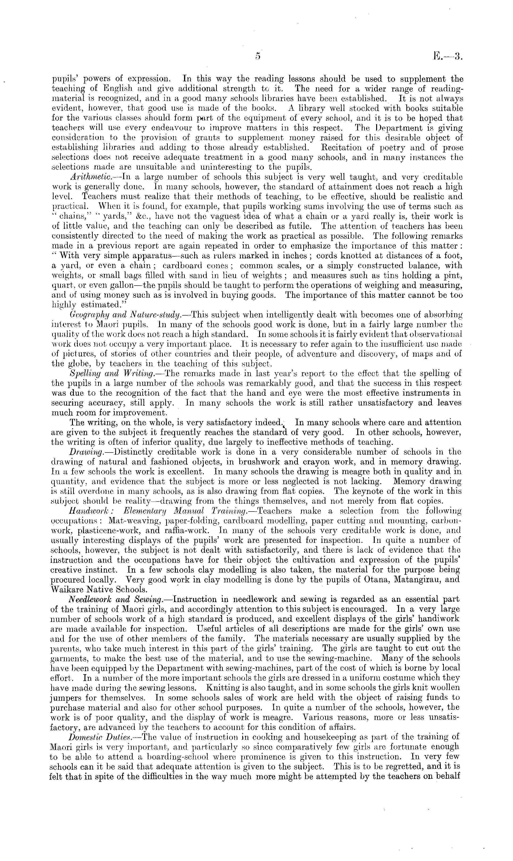 pupils' powers of expression. In this way the reading lessons should be used to supplement the teaching of English and give additional strength to it. The need for a wider range of readingmaterial is recognized, and in a good many schools libraries have been established. It is not always evident, however, that good use is made of the books. A library well stocked with books suitable for the various classes should form pert of the equipment of every school, and it is to be hoped that teachers will use every endeavour to improve matters in this respect. The Department is giving consideration to the provision of grants to supplement money raised for this desirable object of establishing libraries and adding to those already established. Eecitation of poetry and of prose selections does not receive adequate treatment in a good many schools, and in many instances the selections made are unsuitable and uninteresting to the pupils. Arithmetic. —In a large number of schools this subject is very well taught, and very creditable work is generally done. In many schools, however, the standard of attainment does not reach a high level. Teachers must realize that their methods of teaching, to be effective, should be realistic and practical. When it is found, for example, that pupils working sums involving the use of terms such as " chains," " yards," &c., have not the vaguest idea of what a chain or a yard really is, their work is of little value, and the teaching can only be described as futile. The attention of teachers has been consistently directed to the need of making the work as practical as possible. The following remarks made in a previous report are again repeated in order to emphasize the importance of this matter : " With very simple apparatus —such as rulers marked in inches ; cords knotted at distances of a foot, a yard, or even a chain ; cardboard cones ; common scales, or a simply constructed balance, with weights, or small bags filled with sand in lieu of weights ; and measures such as tins holding a pint, quart, or even gallon —the pupils should be taught to perform the operations of weighing and measuring, and of using money such as is involved in buying goods. The importance of this matter cannot be too highly estimated." Geography and Nature-study. —This subject when intelligently dealt with becomes one of absorbing interest to Maori pupils. In many of the schools good work is done, but in a fairly large number the quality of the work does not reach a high standard. In some schools it is fairly evident that observational work does not occupy a very important place. It is necessary to refer again to the insufficient use made of pictures, of stories of other countries and their people, of adventure and discovery, of maps and of the globe, by teachers in the teaching of this subject. Spelling and Writing.—The remarks made in last year's report to the effect that the spelling of the pupils in a large number of the schools was remarkably good, and that the success in this respect was due to the recognition of the fact that the hand and eye were the most effective instruments in securing accuracy, still apply. In many schools the work is still rather unsatisfactory and leaves much room for improvement. The writing, on the whole, is very satisfactory In many schools where care and attention are given to the subject it frequently reaches the standard of very good. In other schools, however, the writing is often of inferior quality, due largely to ineffective methods of teaching. Drawing. —Distinctly creditable work is done in a very considerable number of schools in the drawing of natural and fashioned objects, in brushwork and crayon work, and in memory drawing. In a few schools the work is excellent. In many schools the drawing is meagre both in quality and in quantity, and evidence that the subject is more or less neglected is not lacking. Memory drawing is still overdone in many schools, as is also drawing from flat copies. The keynote of the work in this subject should be reality—drawing from the things themselves, and not merely from flat copies. Handwork: Elementary Manual Training. —Teachers make a selection from the following occupations : Mat-weaving, paper-folding, cardboard modelling, paper cutting and mounting, carbonwork, plasticene-work, and raffia-work. In many of the schools very creditable work is done, and usually interesting displays of the pupils' work are presented for inspection. In quite a number of schools, however, the subject is not dealt with satisfactorily, and there is lack of evidence that the instruction and the occupations have for their object the cultivation and expression of the pupils' creative instinct. In a few schools clay modelling is also taken, the material for the purpose being procured locally. Very good work in clay modelling is done by the pupils of Otana, Matangirau, and Waikare Native Schools. Needlework and Sewing. —Instruction in needlework and sewing is regarded as an essential part of the training of Maori girls, and accordingly attention to this subject is encouraged. In a very large number of schools work of a high standard is produced, and excellent displays of the girls' handiwork are made available for inspection. Useful articles of all descriptions are made for the girls' own use and for the use of other members of the family. The materials necessary are usually supplied by the parents, who take much interest in this part of the girls' training. The girls are taught to cut out the garments, to make the best use of the material, and to use the sewing-machine. Many of the schools have been equipped by the Department with sewing-machines, part of the cost of which is borne by local effort. In a number of the more important schools the girls are dressed in a uniform costume which they have made during the sewing lessons. Knitting is also taught, and in some schools the girls knit woollen jumpers for themselves. In so