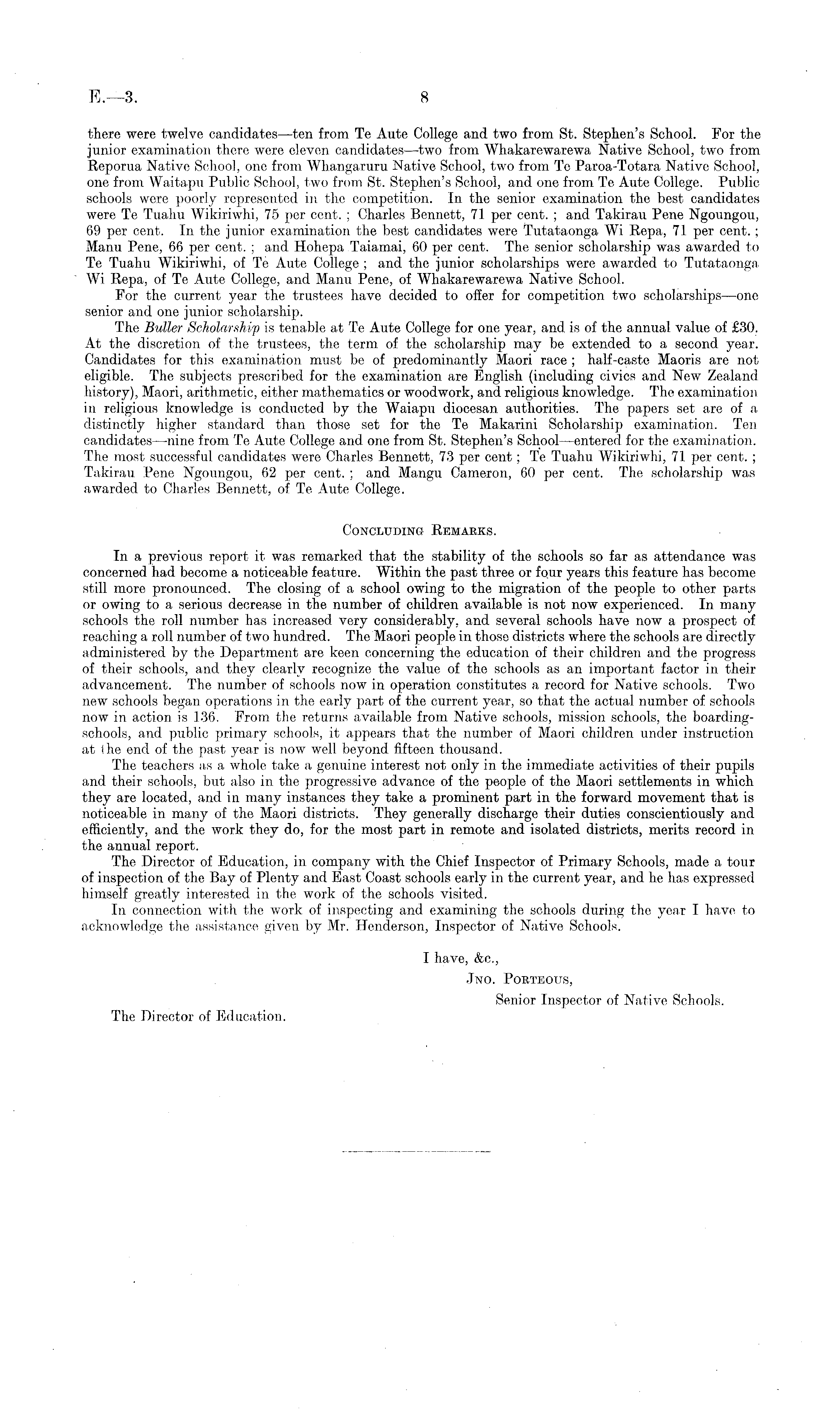 there were twelve candidates —ten from To Aute College and two from St. Stephen's School. For the junior examination there were eleven candidates—two from Whakarewarewa Native School, two from. Reporua Native School, one from Whangaruru Native School, two from Te Paroa-Totara Native School, one from Waitapu Public School, two from St. Stephen's School, and one from Te Aute College. Public schools were poorly represented in the competition. In the senior examination the best candidates were Te Tuahu Wikiriwhi, 75 per cent. ; Charles Bennett, 71 per cent. ; and Takirau Pene Ngoungou, 69 per cent. In the junior examination the best candidates were Tutataonga Wi Repa, 71 per cent.; Manu Pene, 66 per cent. ; and Hohepa Taiamai, 60 per cent. The senior scholarship was awarded to Te Tuahu Wikiriwhi, of Te Aute College ; and the junior scholarships were awarded to Tutataonga Wi Repa, of Te Aute College, and Manu Pene, of Whakarewarewa Native School. For the current year the trustees have decided to offer for competition two scholarships—one senior and one junior scholarship. The Buller Scholarship is tenable at Te Aute College for one year, and is of the annual value of £30. At the discretion of the trustees, the term of the scholarship may be extended to a second year. Candidates for this examination must be of predominantly Maori race ; half-caste Maoris are not eligible. The subjects prescribed for the examination are English (including civics and New Zealand history), Maori, arithmetic, either mathematics or woodwork, and religious knowledge. The examination in religious knowledge is conducted by the Waiapu diocesan, authorities. The papers set are of a distinctly higher standard than those set for the Te Makarini Scholarship examination. Ten candidates—nine from Te Aute College and one from St. Stephen's School—entered for the examination. The most successful candidates were Charles Bennett, 73 per cent; Te Tuahu Wikiriwhi, 71 per cent. ; Takirau Pene Ngoungou, 62 per cent. ; and Mangu Cameron, 60 per cent. The scholarship was awarded to Charles Bennett, of Te. Aute College. Concluding Remarks. In a previous report it was remarked that the stability of the schools so far as attendance was concerned had become a noticeable feature. Within the past three or four years this feature has become still more pronounced. The closing of a school owing to the migration of the people to other parts or owing to a serious decrease in the number of children available is not now experienced. In many schools the roll number has increased very considerably, and several schools have now a prospect of reaching a roll number of two hundred. The Maori people in those districts where the schools are directly administered by the Department are keen concerning the education of their children and the progress of their schools, and they clearly recognize the value of the schools as an important factor in their advancement. The number of schools now in operation constitutes a record for Native schools. Two new schools began operations in the early part of the current year, so that the actual number of schools now in action is 136. From the returns available from Native schools, mission schools, the boardingschools, and public primary schools, it appears that the number of Maori children under instruction at (he end of the past year is now well beyond fifteen thousand. The teachers as a whole take a genuine interest not only in the immediate activities of their pupils and their schools, but also in. the progressive advance of the people of the Maori settlements in which they are located, and in many instances they take a prominent part in the forward movement that is noticeable in many of the Maori districts. They generally discharge their duties conscientiously and efficiently, and the work they do, for the most part in remote and isolated districts, merits record in the annual report. The Director of Education, in company with the Chief Inspector of Primary Schools, made a tour of inspection of the Bay of Plenty and East Coast schools early in the current year, and he has expressed himself greatly interested in the work of the schools visited. In connection with the work of inspecting and examining the schools during the year I have to acknowledge the assistance given by Mr. Henderson, Inspector of Native Schools. I have, &c., Jno. Porteous, Senior Inspector of Native Schools. The Director of Education.