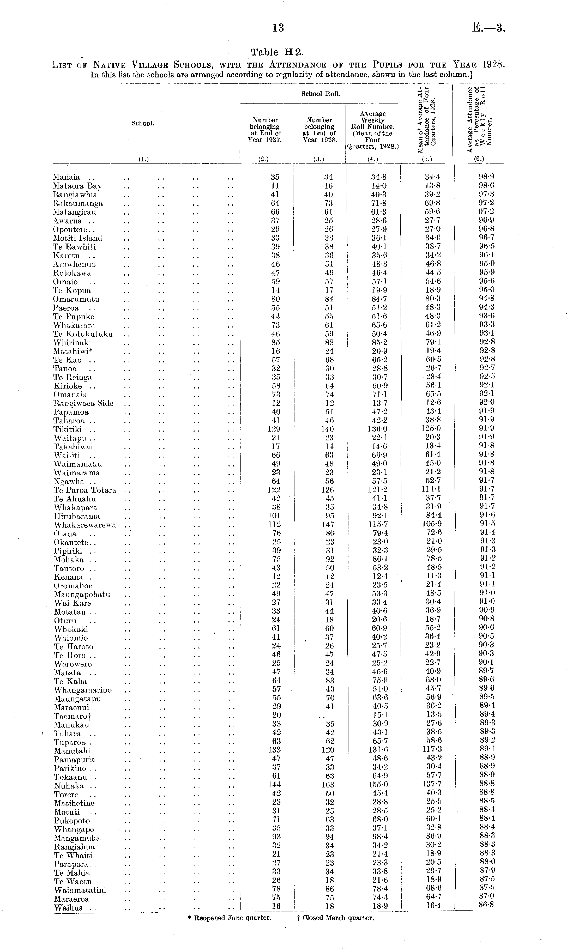 Table H2. List of Native Village Schools, with the Attendance of the Pupils for the Year 1928.