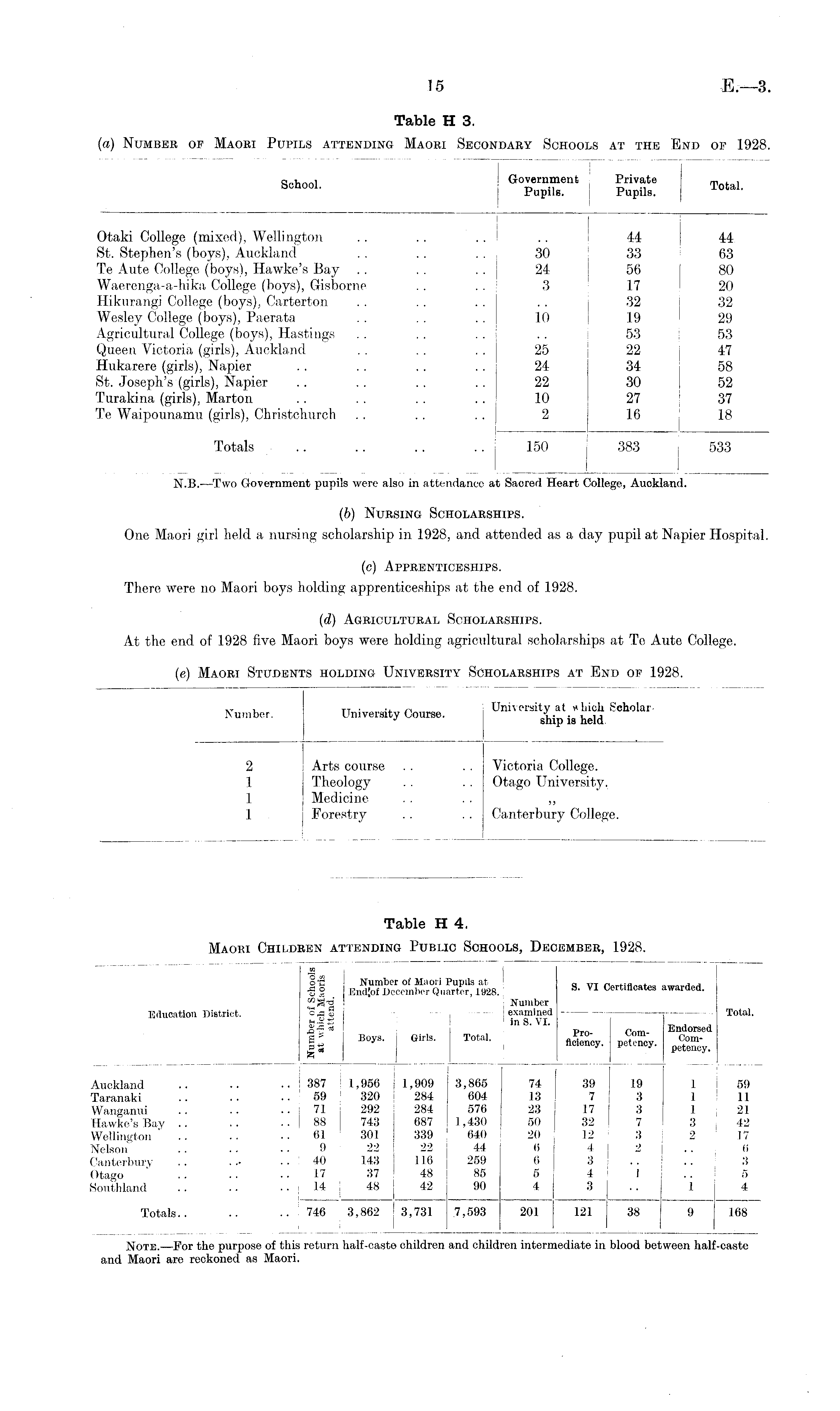 Table H3. (a) Number of Maori Pupils attending Maori Secondary Schools at the End of 1928.