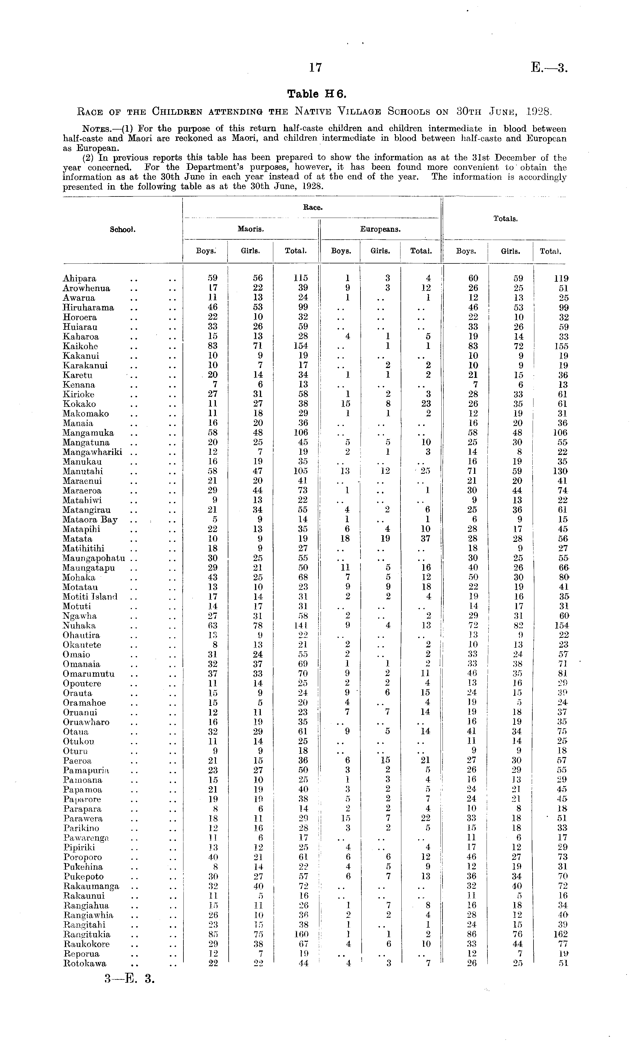Notes. —(1) For the purpose of this return half-caste children and children intermediate in blood between half-caste and Maori are reckoned as Maori, and children intermediate in blood between half-caste and European as European. (2) In previous reports this table has been prepared to show the information as at the 31st December of the year concerned. For the Department's purposes, however, it has been found more convenient to obtain the information as at the 30th June in each year instead of at the end of the year. The information is accordingly presented in the following table as at the 30th June, 1928. Race. Totals. School. Maoris. Europeans. Boys, j Girls. Total. Boys. Girls. Total. Boys, i Girls. Total. Ahipara .. .. 59 56 115 1 3 4 1 60 59 119 Arowhenua .. .. 17 22 39 9 3 12 26 25 51 Awarua .. .. 11 13 24 1 1 12 13 25 Hiruharama .. .. 46 53 99 .. .. .. 46 53 99 I-Ioroera .. .. 22 10 32 .. .. .. 22 10 32 Huiarau .. .. 33 26 59 .. .. .. 33 26 59 Kaharoa .... 15 13 28 4 1 5 19 14 33 Kaikohe .. .. 83 71 154 1 1 83 72 155 Kakanui .. .. 10 9 19 .. .. .. 10 9 19 Karakanui .. .. 10 7 17 2 2 10 9 19 Karetu .. 20 14 34 1 1 2 21 15 36 Kenana .. .. 7 6 13 .. .. .. 7 6 13 Kirioke .. .. 27 31 58 1 2 3 28 33 61 Kokako .. .. 11 27 38 15 8 23 26 35 61 Makomako .. .. 11 18 29 1 1 2 12 19 31 Manaia .. .. 16 20 36 .. .. .. 16 20 36 Mangamuka .. .. 58 48 106 .. .. .. 58 48 106 Mangatuna .. .. 20 25 45 5 5 10 25 30 55 Mangawhariki .. .. 12 7 19 I 2 1 1 3 14 8 22 Manukau .. .. 16 19 35 .... .. 16 19 35 Manutahi .. .. 58 47 105 13 : 12 ' 25 71 59 130 Maraenui .. .. 21 20 41 .. • .. .. 21 20 41 Maraeroa .. .. 29 44 73 1 1 30 44 74 Matahiwi .. .. 9 13 22 .. .. .. 9 13 22 Matangirau .. .. 21 34 55 4 2 6 25 36 61 Mataora Bay .. .. 5 9 14 1 1 6 9 15 Matapihi .. .. 22 13 35 6 4 10 28 17 45 Matata .. .. 10 9 19 18 19 37 28 28 56 Matihitihi .. .. 18 9 27 .. .. 18 9 27 Maungapohatu .. . . 30 25 55 .. ' .. .. 30 25 55 Maungatapu .. . . 29 21 50 11 5 16 40 26 66 Mohaka .. . . 43 25 68 7 5 12 50 30 80 Motatau .. . . 13 10 23 9 9 18 22 19 41 Motiti Island .. .. 17 14 31 2 2 4 19 16 35 Motuti .. .. 14 17 31 .. .. .. 14 17 31 Ngawha .. .. 27 31 58 2 2 29 31 60 Xfuhaka .. .. 63 78 141 9 4 13 72 82 154 Ohautira .. .. 13 9 22 .. .. .. 13 9 22 Okautete .. .. 8 13 21 2 2 10 13 23 Omaio .. .. 31 24 55 2 2 33 24 57 O manaia .. .. 32 37 69 1 1 2 33 38 71 Omarumutu .. .. 37 33 70 9 2 11 46 35 81 Opoutere .. .. 11 14 25 2 2 4 13 16 29 Orauta .. .. 15 9 24 9 6 15 24 15 39 Oramahoe .. .. 15 5 20 4 4 19 5 24 Oruanui .. .. 12 11 23 7 7 14 19 18 37 Oruawharo .. .. 16 19 35 .. .. .. 16 19 35 Otaua .. .. 32 29 61 9 5 14 41 34 75 Otukou .. .. 11 14 25 .. .. .. 11 14 25 Oturu .. .. 9 9 18 .. .. .. 9 9 18 Paeroa .. .. 21 15 36 6 15 21 27 30 57 Pamapuria .. .. 23 27 50 3 2 5 26 29 55 Pamoana .. .. 15 10 25 1 3 4 16 13 | 29 Papamoa .. .. 21 19 40 3 2 5 24 21 45 Paparore .. .. 19 19 38 5 2 7 24 21 45 Parapara .. .. 8 6 14 2 2 4 10 8 18 Parawera .. .. 18 11 29 ;j 15 7 22 33 18 51 Parikino .. .. 12 16 28 || 3 2 5 15 18 33 Pawarenga .. .. II 6 17 .. .. '' 6 17 Pipiriki .. .. 13 12 25 4 .. 4 17 12 29 Poroporo .. .. 40 21 61 6 6 12 46 27 73 Pukehina .... 8 14 22 4 5 9 12 19 31 Pukepoto .. .. 30 27 57 6 7 13 j 36 34 70 Rakaumanga .. .. 32 40 72 .. .. ' 32 40 72 Rakaunui .. .. II 5 16 .. .. .. 11 5 16 Rangiahua .. .. 15 11 26 I 7 8 16 18 34 Rangiawhia .. .. 26 10 36 2 2 4 28 12 40 Rangitahi .. .. 23 15 38 I I 24 15 39 Rangitukia .. .. 85 75 160 1 I 2 86 76 162 Raukokore .. .. 29 38 67 4 6 10 33 44 77 Reporua .. .. 12 7 19 .. .. .. 12 7 1 It Rotokawa .. .. 22 22 44 4 1 3 7 26 25 51