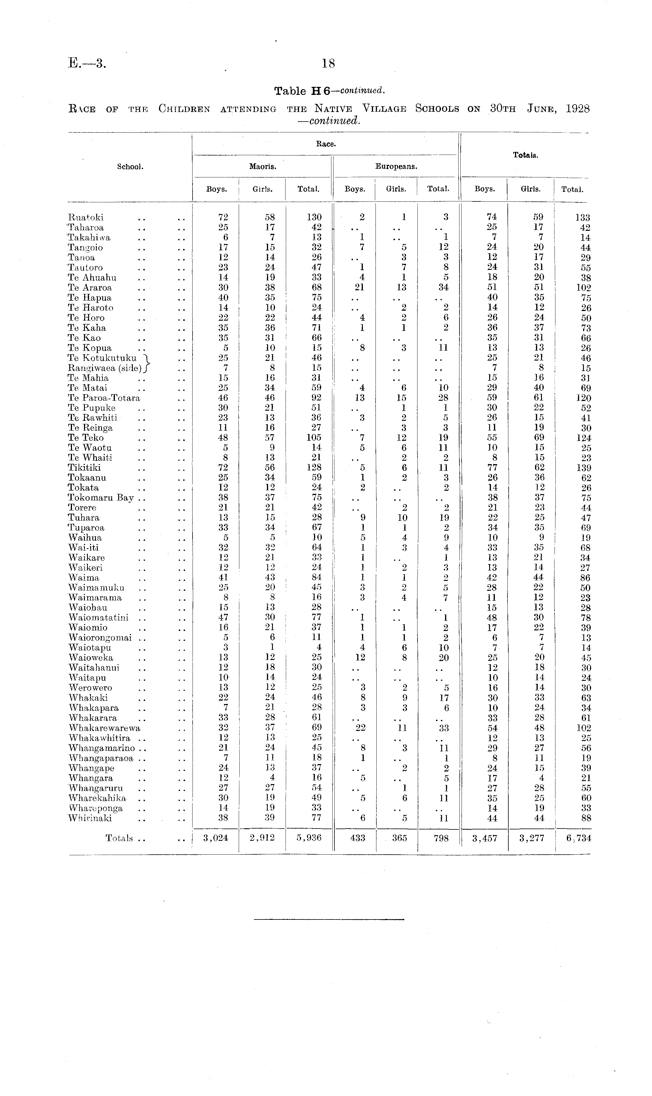 Table H6 —continued. Race of the Children attending the Native Village Schools on 30th June, 1928 —continued.