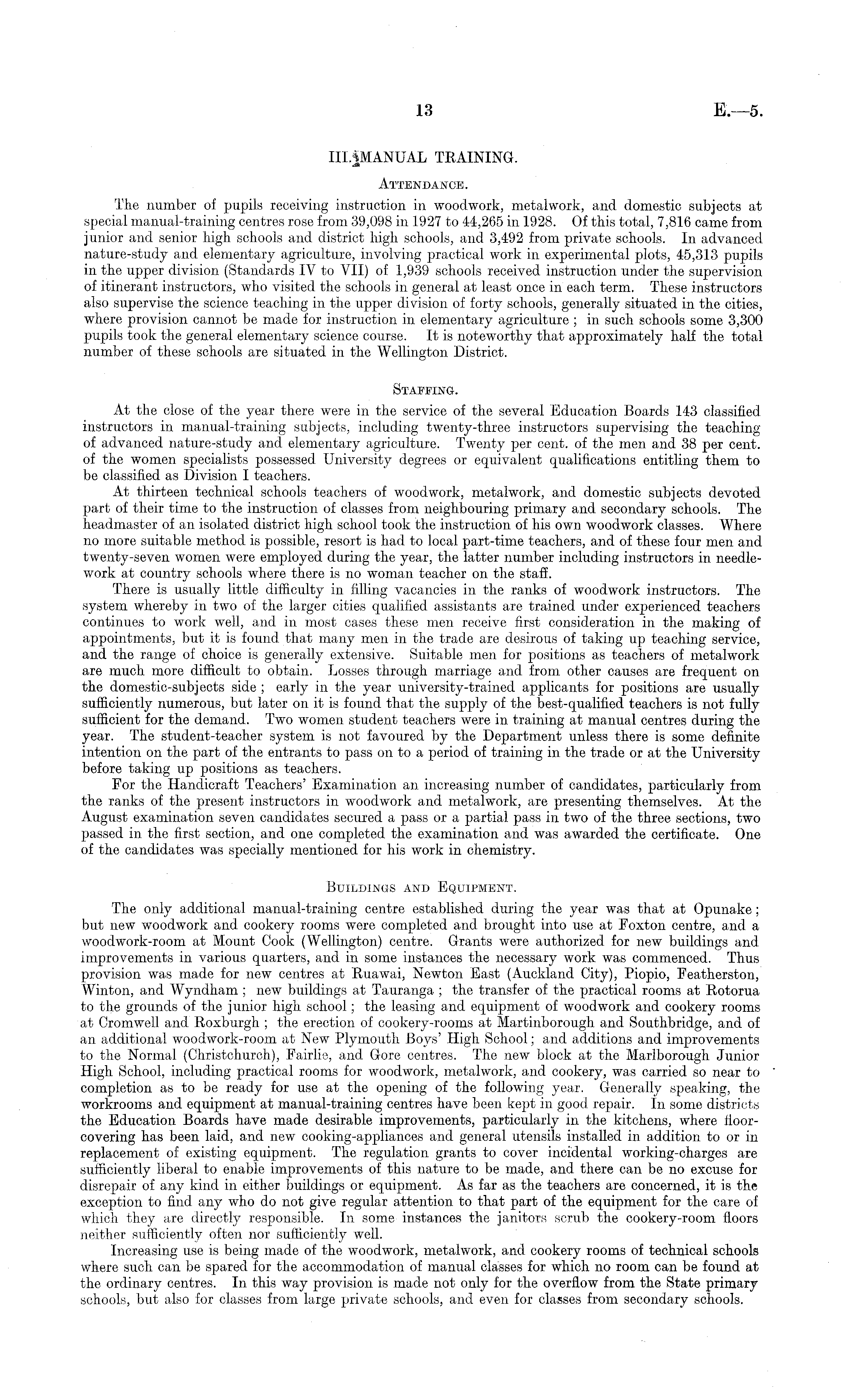lII.fMANUAL TRAINING. Attendance. The number of pupils receiving instruction in woodwork, metalwork, and domestic subjects at special manual-training centres rose from 39,098 in 1927 to 44,265 in 1928. Of this total, 7,816 came from junior and senior high schools and district high schools, and 3,492 from private schools. In advanced nature-study and elementary agriculture, involving practical work in experimental plots, 45,313 pupils in the upper division (Standards IV to VII) of 1,939 schools received instruction under the supervision of itinerant instructors, who visited the schools in general at least once in each term. These instructors also supervise the science teaching in the upper division of forty schools, generally situated in the cities, where provision cannot be made for instruction in elementary agriculture ; in such schools some 3,300 pupils took the general elementary science course. It is noteworthy that approximately half the total number of these schools are situated in the Wellington District. Staffing. At the close of the year there were in the service of the several Education Boards 143 classified instructors in manual-training subjects, including twenty-three instructors supervising the teaching of advanced nature-study and elementary agriculture. Twenty per cent, of the men and 38 per cent, of the women specialists possessed University degrees or equivalent qualifications entitling them to be classified as Division I teachers. At thirteen technical schools teachers of woodwork, metalwork, and domestic subjects devoted part of their time to the instruction of classes from neighbouring primary and secondary schools. The headmaster of an isolated district high school took the instruction of his own woodwork classes. Where no more suitable method is possible, resort is had to local part-time teachers, and of these four men and twenty-seven women were employed during the year, the latter number including instructors in needlework at country schools where there is no woman teacher on the staff. There is usually little difficulty in filling vacancies in the ranks of woodwork instructors. The system whereby in two of the larger cities qualified assistants are trained under experienced teachers continues to work well, and in most cases these men receive first consideration in the making of appointments, but it is found that many men in the trade are desirous of taking up teaching service, and the range of choice is generally extensive. Suitable men for positions as teachers of metalwork are much more difficult to obtain. Losses through marriage and from other causes are frequent on the domestic-subjects side ; early in the year university-trained applicants for positions are usually sufficiently numerous, but later on it is found that the supply of the best-qualified teachers is not fully sufficient for the demand. Two women student teachers were in training at manual centres during the year. The student-teacher system is not favoured by the Department unless there is some definite intention on the part of the entrants to pass on to a period of training in the trade or at the University before taking up positions as teachers. For the Handicraft Teachers' Examination an increasing number of candidates, particularly from the ranks of the present instructors in woodwork and metalwork, are presenting themselves. At the August examination seven candidates secured a pass or a partial pass in two of the three sections, two passed in the first section, and one completed the examination and was awarded the certificate. One of the candidates was specially mentioned for his work in chemistry. Buildings and Equipment. The only additional manual-training centre established during the year was that at Opunake; but new woodwork and cookery rooms were completed and brought into use at Foxton centre, and a woodwork-room at Mount Cook (Wellington) centre. Grants were authorized for new buildings and improvements in various quarters, and in some instances the necessary work was commenced. Thus provision was made for new centres at Ruawai, Newton East (Auckland City), Piopio, Featherston, Winton, and Wyndham ; new buildings at Tauranga ; the transfer of the practical rooms at Rotorua to the grounds of the junior high school; the leasing and equipment of woodwork and cookery rooms at Cromwell and Roxburgh ; the erection of cookery-rooms at Martinborough and Southbridge, and of an additional woodwork-room at New Plymouth Boys' High School; and additions and improvements to the Normal (Christchurch), Fairlie, and Gore centres. The new block at the Marlborough Junior High School, including practical rooms for woodwork, metalwork, and cookery, was carried so near to completion as to be ready for use at the opening of the following year. Generally speaking, the workrooms and equipment at manual-training centres have been kept in good repair. In some districts the Education Boards have made desirable improvements, particularly in the kitchens, where floorcovering has been laid, and new cooking-appliances and general utensils installed in addition to or in replacement of existing equipment. The regulation grants to cover incidental working-charges are sufficiently liberal to enable improvements of this nature to be made, and there can be no excuse for disrepair of any kind in either buildings or equipment. As far as the teachers are concerned, it is the exception to find any who do not give regular attention to that part of the equipment for the care of which they are directly responsible. In some instances the janitors scrub the cookery-room floors neither sufficiently often nor sufficiently well. Increasing use is being made of the woodwork, metalwork, and cookery rooms of technical schools where such can be spared for the accommodation of manual classes for which no room can be found at the ordinary centres. In this way provision is made not only for the overflow from the State primary schools, but