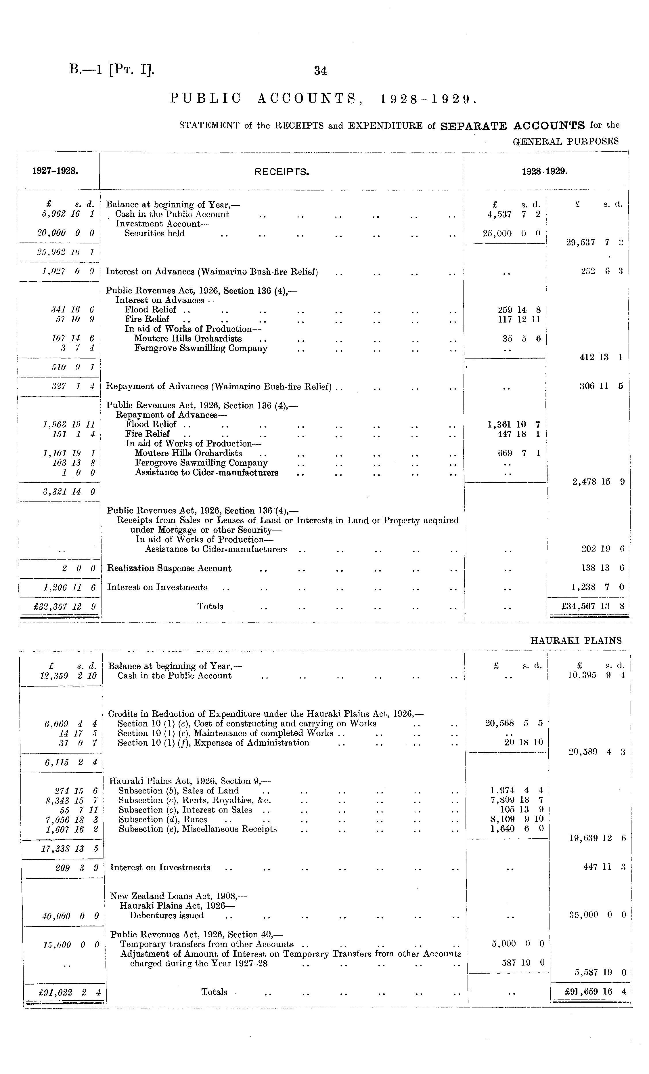 GENERAL PURPOSES 1927-1928. RECEIPTS. 1928-1929. £ s. d. Balance at beginning of Year, — £ s. d. £ s. d. 5.962 16 1 Cash in the Public Account .. .. .. .. .. .. 4,537 7 2 Investment Account20,000 0 0 Securities held .. .. .. .. .. .. .. 25,000 0 0 1 29,537 7 2 25,962 16 1 , —. 1,027 0 9 Interest on Advances (Waimarino Bush-fire Relief) .. .. .. .. .. 252 6 3 Public Revenues Act, 1926, Section 136 (4), — Interest on Advances— 341 16 6 Flood Relief .. .. .. .. .. .. .. .. 259 14 8 57 10 9 Fire Relief .. .. .. .. .. .. .. .. 117 12 11 In aid of Works of Production— 107 14 6 Moutere Hills Orchardists .. .. .. .. .. .. 35 5 6 J 3 7 4 Ferngrove Sawmilling Company —! 412 13 1 510 9 1 327 1 4 Repayment of Advances (Waimarino Bush-fire Relief) .. .. .. .. .. | 306 11 5 Public Revenues Act, 1926, Section 136 (4), — Repayment of Advances— 1.963 19 11 Flood Relief .. .. .. .. .. .. .. .. 1,36110 7 151 1 4 Fire Relief .. .. .. .. .. .. .. . . 447 18 1 In aid of Works of Production— 1,101 19 1 Moutere Hills Orchardists .. .. .. .. .. .. 869 7 1 103 13 8 i Ferngrove Sawmilling Company 10 0 Assistance to Cider-manufacturers 1 2,478 15 9 3,321 14 0 Public Revenues Act, 1926, Section 136 (4), — Receipts from Sales or Leases of Land or Interests in Land or Property acquired under Mortgage or other Security—• I In aid of Works of Production— Assistance to Cider-manufacturers .. .. .. .. .. .. j 202 19 6 2 0 ft Realization Suspense Account .. .. .. .. .. .. .. 138 13 6 1,206 11 6 Interest on Investments .. .. .. .. .. .. .. .. 1,238 7 0 I £32,357 12 9 Totals .. .. .. .. .. .. .. £34,567 13 8 HAURAKI PLAINS j £ s. d. Balance at beginning of Year, — £ s. d. £ s. d. 12,359 2 10 Cash in the Public Account .. .. .. .. .. ... .. 10,395 9 4 Credits in Reduction of Expenditure under the Hauraki Plains Act, 1926, — 6,069 4 4 Section 10 (1) (c), Cost of constructing and carrying on Works .. .. 20,568 5 5 14 17 5 Section 10 (1) (e), Maintenance of completed Works .. 31 0 7 Section 10 (1) (/), Expenses of Administration .. .. .. .. 20 18 10 20,589 4 3 6,115 2 4 Hauraki Plains Act, 1926, Section 9, — 274 15 6 Subsection (£>), Sales of Land .. .. .. .. .. .. 1,974 4 4 8,343 15 7 Subsection (c), Rents, Royalties, &c. .. .. .. .. .. 7,809 18 7 55 7 11 Subsection (c), Interest on Sales .. .. .. .. .. .. 1 105 13 9 7,056 18 3 Subsection [d), Rates .. .. .. .. .. .. .. 8,109 9 10 1,607 16 2 Subsection (e), Miscellaneous Receipts .. .. .. .. .. 1,640 6 0 19,639 12 6 17,338 13 5 209 3 9 Interest on Investments .. .. .. .. .. .. .. .. 447 11 3 New Zealand Loans Act, 1908, — Hauraki Plains Act, 1926— 40,000 0 0 Debentures issued .. .. .. .. .. .. .. .. 35,000 0 0 Public Revenues Act, 1926, Section 40, — 15,000 0 0 Temporary transfers from other Accounts .. .. .. .. .. 5,000 0 0 Adjustment of Amount of Interest on Temporary Transfers from other Accounts charged during the Year 1927--28 .. .. .. .. .. | 587 19 0 I 5,587 19 0 £91,022 2 4 Totals .. .. .. .. .. .. j .. £91,659 16 4
