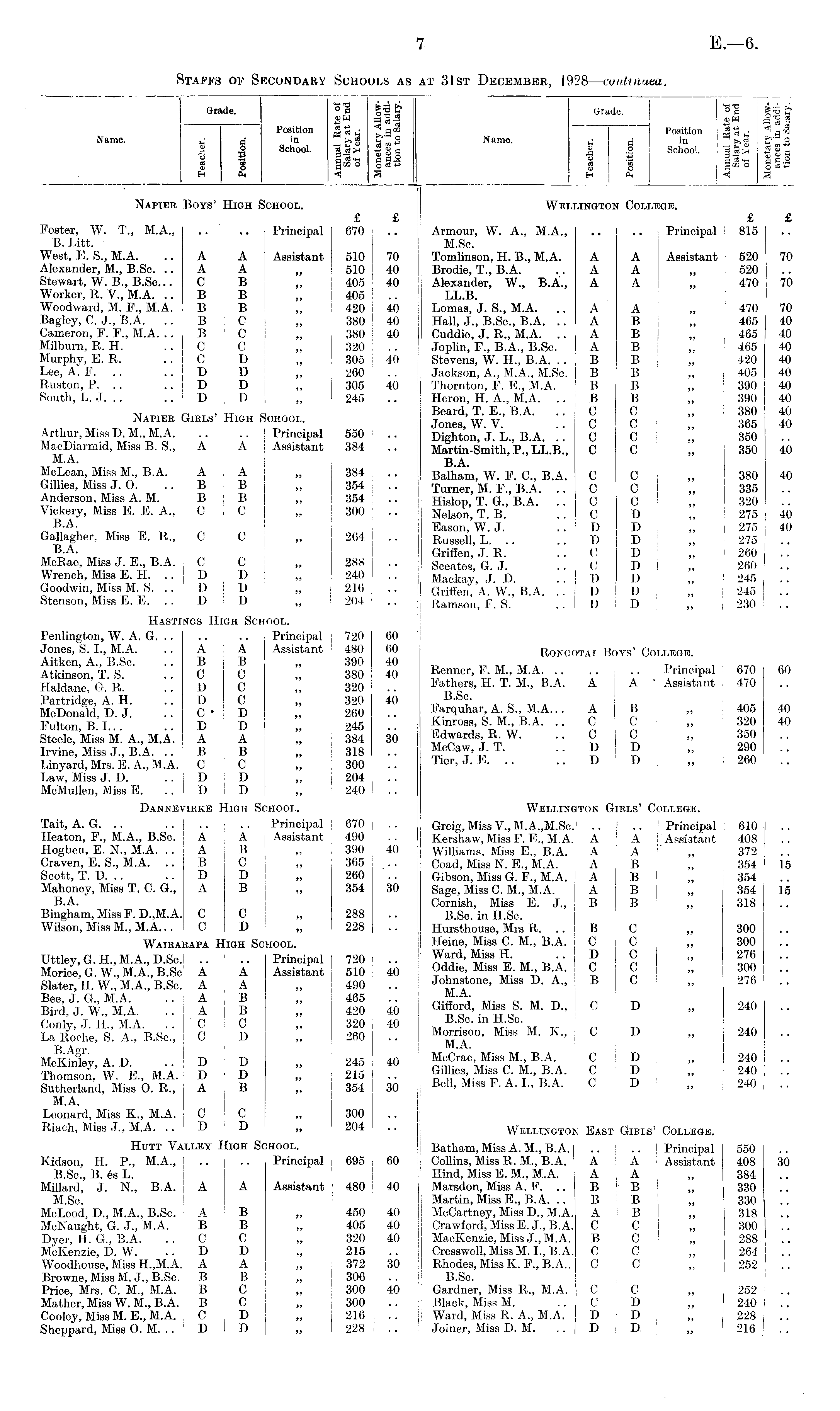 Grade. °a gig & |1| Position 5 « J. a m Name. M - d in >> g 2 o School. ]?.§{* |gfl S 2 §c.o S o ° o «S H B. «s a Napier Boys' High School. £ £ Foster, w. T., M.A Principal 670 B. Litt. West, E. S., M.A. .. A A Assistant 510 70 Alexander, M., B.Sc. A A „ 510 40 Stewart, W. B., B.Sc... C B „ 405 40 Worker, R. V., M.A. B B „ 405 Woodward, M. F., M.A. B B „ 420 40 Bagley, C. J., B.A. B C „ 380 40 Cameron, F. F., M.A. ..IB C „ 380 40 Milburn, R. H. .. C C „ 320 ! Murphy, E. R. .. i C D „ 305 40 Lee, A. F. .. D D „ 260 Ruston, P. .. D D „ 305 40 South, L.J... D D „ 245 Napier Girls' High School. Arthur, Miss D. M., M.A. .. .. Principal 550 MacDiarmid, Miss B. S., A A Assistant 384 ; M.A. McLean, Miss M., B.A. A A „ 384 : .. Gillies, Miss J. 0. B B „ 354 Anderson, Miss A. M. B B „ 354 Vickery, Miss E. E. A., G C „ 300 B.A. Gallagher, Miss E. R., C C „ 264 B.A. McRae, Miss J. E., B.A. C C „ 288 Wrench, Miss E. H. D D „ 240 Goodwin, Miss M. S. .. I) D „ 216 Stenson, Miss E. E. .. I) D „ 204 Hastings High School. Penlington, W. A. G .. Principal | 720 60 Jones, S. I., M.A. .. A A Assistant j 480 60 Aitken, A., B.Sc. .. B B „ I 390 40 Atkinson, T. S. C C ,, 380 40 Haldane, G. R. ..DC „ 320 Partridge, A. H. D C „ 320 40 McDonald, D. J. C • D „ 260 Fulton, B. I... .. D D ,, 245 Steele, Miss M. A., M.A. A A ,, 384 30 Irvine, Miss J., B.A. B B „ 318 Linyard, Mrs. E. A., M.A. C C „ 300 Law, Miss J. D. D D „ 204 McMullen, Miss E. D D ,, 240 Dannevirke High School. Tait, A. G. .. .. .. .. Principal 670 | Heaton, F., M.A., B.Sc. A A I Assistant 490 Hogben, E. N., M.A. A B i „ 390 40 Craven, E. S., M.A. B C „ 365 Seott, T. D. .. D D „ 260 Mahoney, Miss T. C. G., A B „ 354 30 B.A. Bingham, Miss F.D.,M.A. C C „ 288 Wilson, Miss M., M.A. C D „ 228 Wairarapa High School. Uttley, G. H., M.A., D.Sc. .. .. Principal 720 Morice, G. W., M.A., B.Sc A A Assistant 510 40 Slater, H. W„ M.A., B.Sc. A A „ 490 Bee, J. G., M.A. A B „ 465 Bird, J. W„ M.A. A B „ 420 40 Conly, J. IL, M.A. .. C C „ 320 40 La Roche, S. A., B.Sc., CD „ 260 B.Agr. McKinley, A. D. D D „ 245 40 Thomson, W. E., M.A. D D „ 215 Sutherland, Miss 0. R., A B „ 354 30 M.A. Leonard, Miss K., M.A. C C ,, 300 Riach, Miss J., M.A. D D „ 204 Hutt Valley High School. Kidson, H. P., M.A., .. .. Principal 695 60 B.Sc., B. es L. Millard, J. N., B.A. A A Assistant 480 40 M.Sc. McLeod, D„ M.A., B.Sc. A B „ 450 40 McNaught, G. J., M.A. B B „ 405 40 Dyer, H. G„ B.A. C C „ 320 40 McKenzie, D. W. D D „ 215 Woodhouse, Miss H.,M.A. A A „ 372 30 Browne, Miss M. J., B.Sc. B B ,, 306 Price, Mrs. C. M., M.A. B C ! 300 40 Mather, Miss W. M„ B.A. ; B C „ | 300 Cooley, Miss M. E., M.A. CD „ 216 Sheppard, Miss O. M. .. D D „ I 228