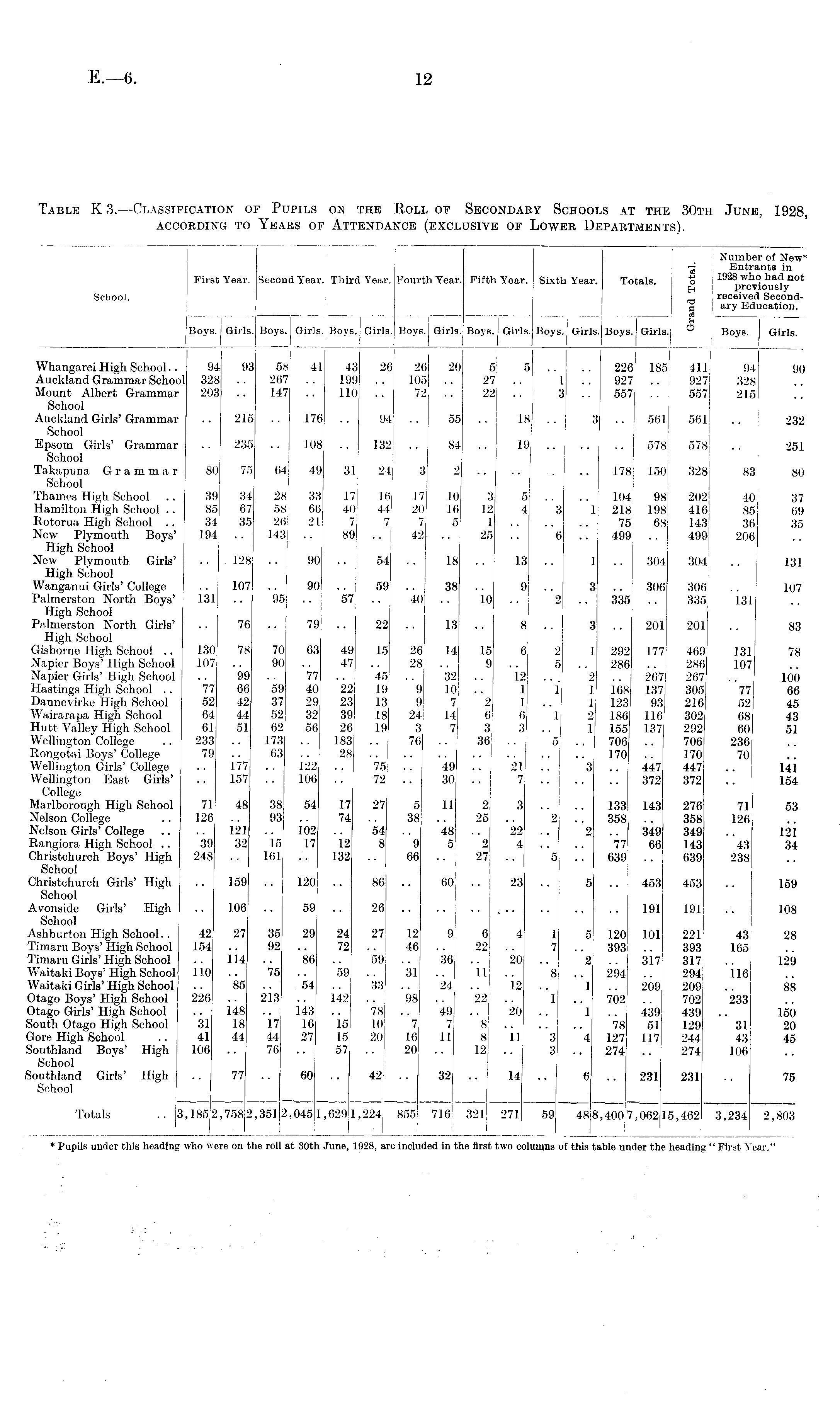 Table K3. —Classification of Pupils on the Roll of Secondary Schools at the 30th June, 1928, according to Years of Attendance (exclusive of Lower Departments).