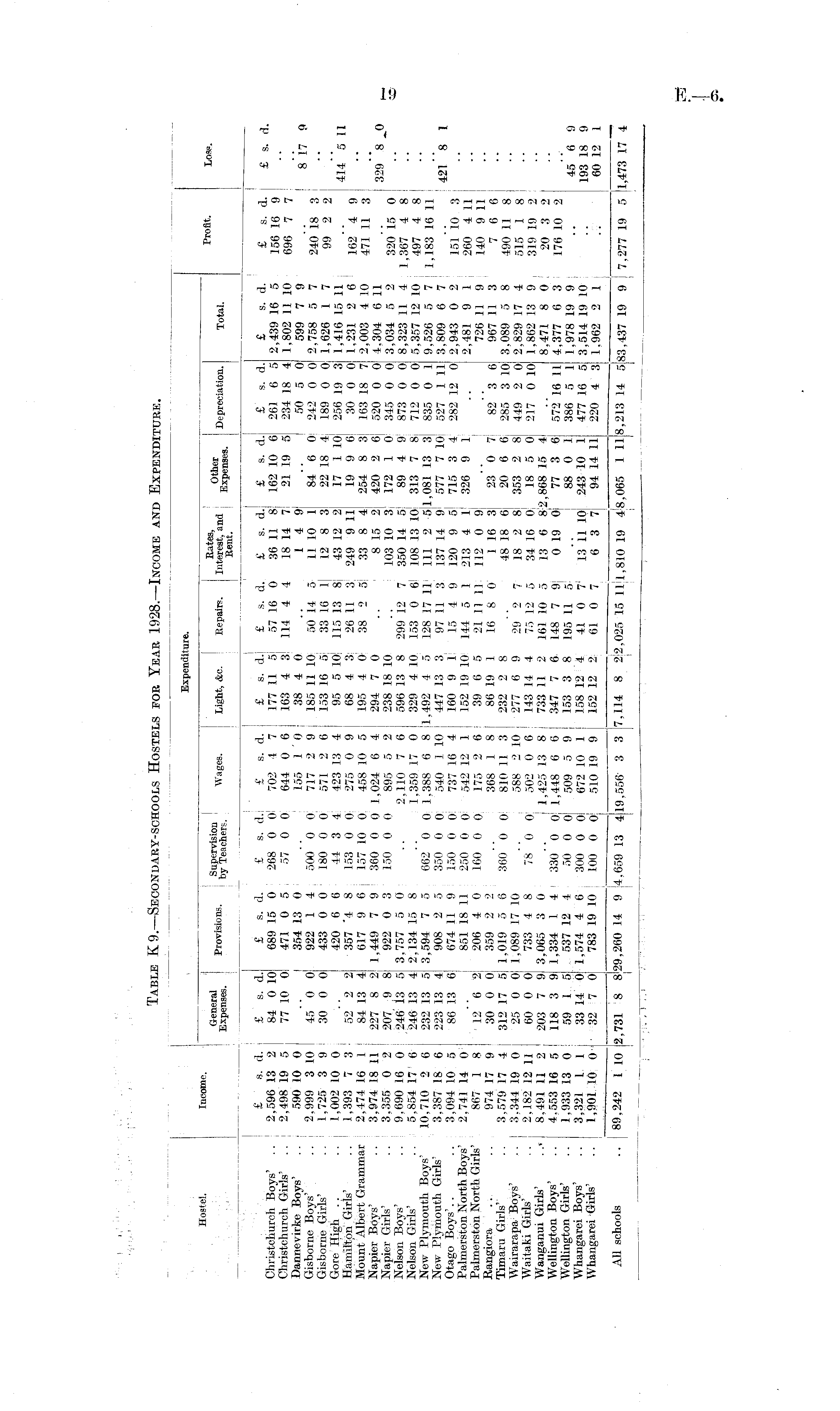 Expenditure. Hostel. Income. " ij ~ j i i - j r~~ T : T n.priPrn.1 ' 5li-mpririaifYn ' i Rates, -crofit. IjOSP. ; Expenses. Provisions. by jr eaoherg 1 Wages. Light, &c. Repairs. Intoest* and Expenses. Depreciation. Total. " "1 7 : i : ■ r T 1 : i i i i £ s- d. £ s. d. £ s. d. £ s. d. £ s. d. £ s. d. £ s. d. £ s. d. £ s. d. £ s. d. £ s. d. £ s d £ s d Christchurch Boys' .. ■ 2,596 13 2 84 0 10 689 15 0 268 0 Oj 702 4 7 177 11 5 57 16 0 36 11 8 162 10 6 261 6 5 2,439 16 5 156 16 9 ! ' Christehurch Girls' .. 2,498 19 5 77 10 0 471 0 5 57 0 0 644 0 6 163 4 3 114 4 4 18 14 7 21 19 5 234 18 4 1,802 11 10 696 7 7 Dannevirke Boys' .. 590 10 0 .. 354 13 0 .. 155 1 ' 0 38 4 0 .. 1 4 9 .. 50 5 0 599 7 9 o'j 7 q Gisborne Boys' .. i 2,999 3 10 45 0 0 922 1 4 500 0 0 717 2 9 185 11 10 50 14 5 11 10 1 84 6 0 242 0 0 2,758 5 7 240 i 8 3 Gisborne Girls' .. 1,725 3 9 30 0 0 433 0 0 180 0 0 571 2 6 153 16 5 33 16 1 12 8 3 22 18 4 189 0 0 1,626 1 7 ~99 2 2 Gore High . . .. 1.002 10 0 .. 420 6 6 44 3 4 423 13 4 95 5 10! 115 13 81 43 12 2 17 1 10 256 19 3 1,416 15 11 414 5 11 Hamilton Girls' .. 1,393 7 3 52 2 2 357 "4 8 153 0 0 275 0 9 68 4 3; 26 11 3 249 9 11 19 9 6 30 0 0 1.231 2 6 162 4 9 Mount Albert Grammar 2,474 16 1 84 13 4 617 9 6 157 10 0 458 10 5 195 4 0 38 2 5 33 8 4 254 8 3 163 18 7 2,003 4 10 471 11 3 Napier Boys' .. 3,974 18 11 227 8 2 1,449 7 9 360 0 0 1.024 6 4 294 7 0 .. 8 15 2 420 2 6 520 0 0 4,304 6 11 3*>q"8 0 Napier Girls' .. 3,355 0 2 207, 9 8 922 0 3 150 0 0 895 5 2 238 18 10 .. 103 10 3 172 1 0 345 0 0 3,034 5 2 320 i5 0 Nelson Boys' .. 9,690 16 0 246 13 5 3,757 5 0 .. : 2,110 7 6 596 13 8 299 12 7 350 14 5 89 4 9 873 0 0 8,323 11 4 1 367 4 8 Nelson Girls' .. 5,854 17' 6 246 13 4 2,134 15 8 .. 1,359 17 0 329 4 10, 153 0 6 108 13 10 313 7 8 712 0 0 5,357 12 10 '497 4 8 New Plymouth Boys' 10,710 2 6 232 13 5 3,594 7 5 662 0 0 1,388 6 8 1,492 4 5 128 17 11 111 2 51,081 13 3 835 0 1 9,526 5 7 1 183 16 11 New Plymouth Girls' 3,387 18 6 223 13 4 908 2 5 350 0 0 540 1 10 447 13 3, 97 11 3 137 14 9 577 7 10 527 1 11 3,809 6 7 1 421 "8 1 Otago Boys'.. .. 3,094 10 5 86 13 6 674 11 9 150 0 0 737 16 4 160 9 1 15 4 9 120 9 5 715 3 4 282 12 0 2,943 0 2 151 "io 3 ' Palmerston North Boys' 2,741 14 0 .. 851 18 11 250 0 0 542 12 1 152 19 10 144 5 1 213 4 1 326 9 1 2,481 9 1 260 4 11 Palmerston North Girls' 867 1 8 12 6 2 206 4 0 160 0 0 175 2 6 39 6 5 21 11 11 112 0 9 .. 726 11 9 140 9 11 Rangiora .. .. 974 17 9 30 0 0 359 2 2 .. 368 1 8 86 19 1 16 8 0 1 16 3 23 0 7 82 3 6 967 11 3 7 6 6 Timaru Girls' .. 3,579 17 4 312 17 5 1,019 5 6 360 0 0 810 11 3 232 2 8 .. 48 18 6 20 6 6 285 3 10 3,089 5 8 490 11 8 Wairarapa Boys' .. 3,344 19 0 25 0 0 1,089 17 10 .. 588 2 10 277 6 9 29 2 7 18 2 8 353 2 8 449 2 0 2 829 17 4 515 1 8 Waitaki Girls' .. 2,182 12 11 60 0 0 733 4 8 78 0 0 502 0 6 143 14 4 75 12 5 34 16 0 18 5 0 217 0 10 1,862 13 9 319 19 9 Wanganui Girls' ... 8,491 11 2 203 7 9 3,065 3 0 .. 1,425 13 8 733 11 2 161 10 5 13 6 82,868 15 4 .. 8 471 8 0 20 3 2 Wellington Boys' .. 4,553 16 5 118 3 9 1,334 1 4 330 0 0 1,448 6 6 347 7 6 148 7 9 0 19 0 77 3 6 572 16 11 4 377 6 3 176 10 2 Wellington Girls' .. 1,933 13 0 59 1 5 537 12 4 50 0 0 509 5 9 153 3 8 195 11 5 .. 88 0 1 386 5 1 l'978 19 9 1 45"6 9 Whangarei Boys' .. 3,321 1 1 33 14 0 1,574 4 6 300 0 0 672 10 1 158 12 4 41 0 7 13 11 10 243 10 1 477 16 5 3*514 19 10 " 193 18 9 Whangarei Girls' .. 1,901 10 0 32 7 0 783 19 10 100 0 0 510 19 9 152 12 2 61 0 7 6 3 7 94 14 11 220 4 3 1,962 2 1 .. 60 12 1 All schools .. j 89,242 1 10 2,731 8 829,260 14 9 |4,659 13 419,556 3 3 7,114 8 212,025 15' lljl,810 19 4 ! 8,065 1 118,213 14 583,437 19 9 j 7,277 19 5 j 1,473 17 ~4