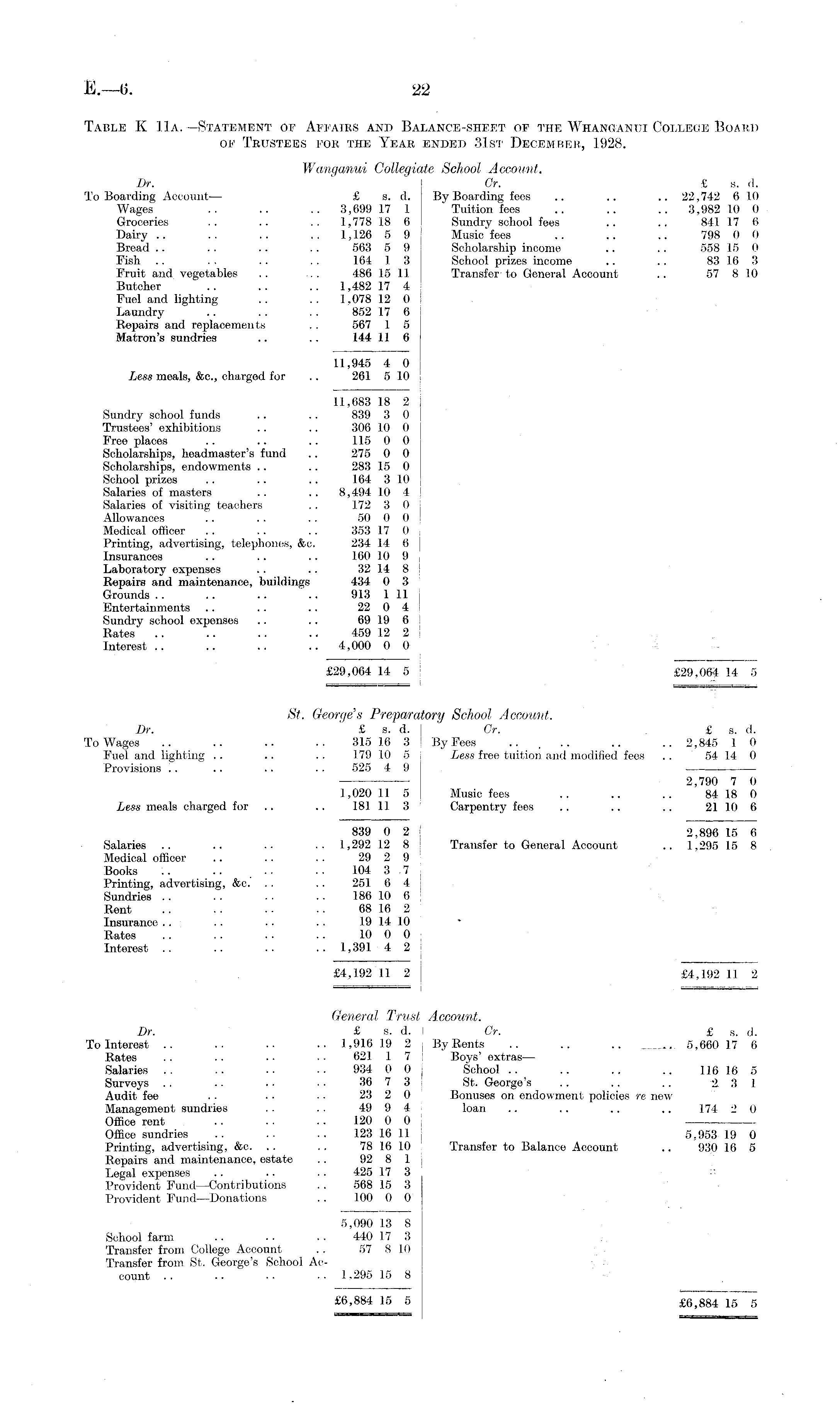 Table Iv 11a.— Statement of Affairs and Balance-sheet of the Whanoanui College Board of Trustees for the Year ended 31st December, 1928. Wanganui Collegiate School Account. Dr. Gr. £ s. d. To Boarding Account — £ s. d. By Boarding fees .. .. .. 22,742 610 Wages .. .. .. 3,699 17 1 Tuition fees .. .. .. 3,982 10 0 Groceries .. .. .. 1,778 18 6 Sundry school fees .. .. 841 17 6 Dairy .. .. .. .. 1,126 5 9 Music fees .. .. .. 798 0 0 Bread .. .. .. .. 863 5 9 Scholarship income .. .. 558 15 0 Fish .. . , . . . . 164 J 3 School prizes income .. .. 83 16 3 Fruit and vegetables .. .. 486 15 11 Transfer-to General Account .. 57 810 Butcher .. .. .. 1,482 17 4 Fuel and lighting .. .. 1,078 12 0 Laundry .. .. .. 852 17 6 Repairs and replacements .. 567 1 5 Matron's sundries .. .. 144 11 6 11,945 4 0 Less meals, &c., charged for .. 261 5 10 11,683 18 2 Sundry school funds .. .. 839 3 0 Trustees' exhibitions .. .. 306 10 0 Freo places .. .. .. 115 0 0 Scholarships, headmaster's fund .. 275 0 0 Scholarships, endowments .. .. 283 15 0 School prizes .. .. .. 164 3 10 Salaries of masters .. .. 8,494 10 4 Salaries of visiting teachers .. 172 3 0 Allowances .. .. .. 50 0 0 Medical officer .. .. .. 353 17 0 Printing, advertising, telephones, &c. 234 14 6 Insurances .. .. .. 160 10 9 Laboratory expenses .. .. 32 14 8 Repairs and maintenance, buildings 434 0 3 Grounds.. .. .. .. 913 J 11 Entertainments .. .. .. 22 0 4 Sundry school expenses .. .. 69 19 6 Rates .. .. .. .. 459 12 2 Interest .. .. .. .. 4,000 0 0 £29,064 14 5 £29,064 14 5 St. George's Preparatory School Account. Dr. £ s. d. Gr. £ s. d. ToWages .. .. .. .. 315 16 3 By Fees .. , .. .. .. 2,845 1 0 Fuel and lighting .. .. .. 179 10 5 Less free tuition and modified fees .. 54 14 0 Provisions .. .. .. .. 525 4 9 — 2,790 7 0 1,020 11 5 Music fees .. .. .. 84 18 0 Less meals charged for .. 181 11 3 Carpentry fees .. .. .. 21 10 6 839 0 2 2,896 15 6 Salaries .. .. .. .. 1,292 12 8 Transfer to General Account .. 1,295 15 8 Medical officer .. . . . . 29 2 9 Books .. .. . . .. 104 3 7 Printing, advertising, &c. . . .. 251 6 4 Sundries .. . . . ■ . • 186 10 6 Rent .. . . .. . . 68 16 2 Insurance .. .. .. . . 19 14 10 Rates .. . . . . .. 10 0 0 Interest .. .. .. .. 1,391 4 2 £4,192 11 2 £4,192 11 2 General Trust Account. Dr. £ s. d. Gr. £ s. d. To Interest .. .. ■■ •• 1,916 19 2 By Rents .. .. .. 5,660 17 6 Rates .. .. .. . • 621 1 7 i Boys' extras— Salaries .. .. .. .. 934 0 0 School .. .. .. .. 116 16 5 Surveys .. .. . • . • 36 7 3 St. George's .. .. .. 2. 3 1 Audit fee .. • • • • 23 2 0 Bonuses on endowment policies re new Management sundries .. . . 49 9 4 loan .. .. .. .. 174 2 0 Office rent . . . . . ■ 120 0 0 Office sundries .. .. .. 123 16 11 5,953 19 0 Printing, advertising, &c. .. . . 78 16 10 Transfer to Balance Account .. 930 16 5 Repairs and maintenance, estate .. 92 8 1 Legal expenses .. .. . . 425 17 3 Provident Fund—Contributions . . 568 15 3 Provident Fund—Donations .. 100 0 0 5,090 13 8 School farm .. . . .. 440 17 3 Transfer from College Account .. 57 8 10 Transfer from St. George's School Account .. •• .. 1,295 15 8 £6,884 15 5 £6,884 15 5