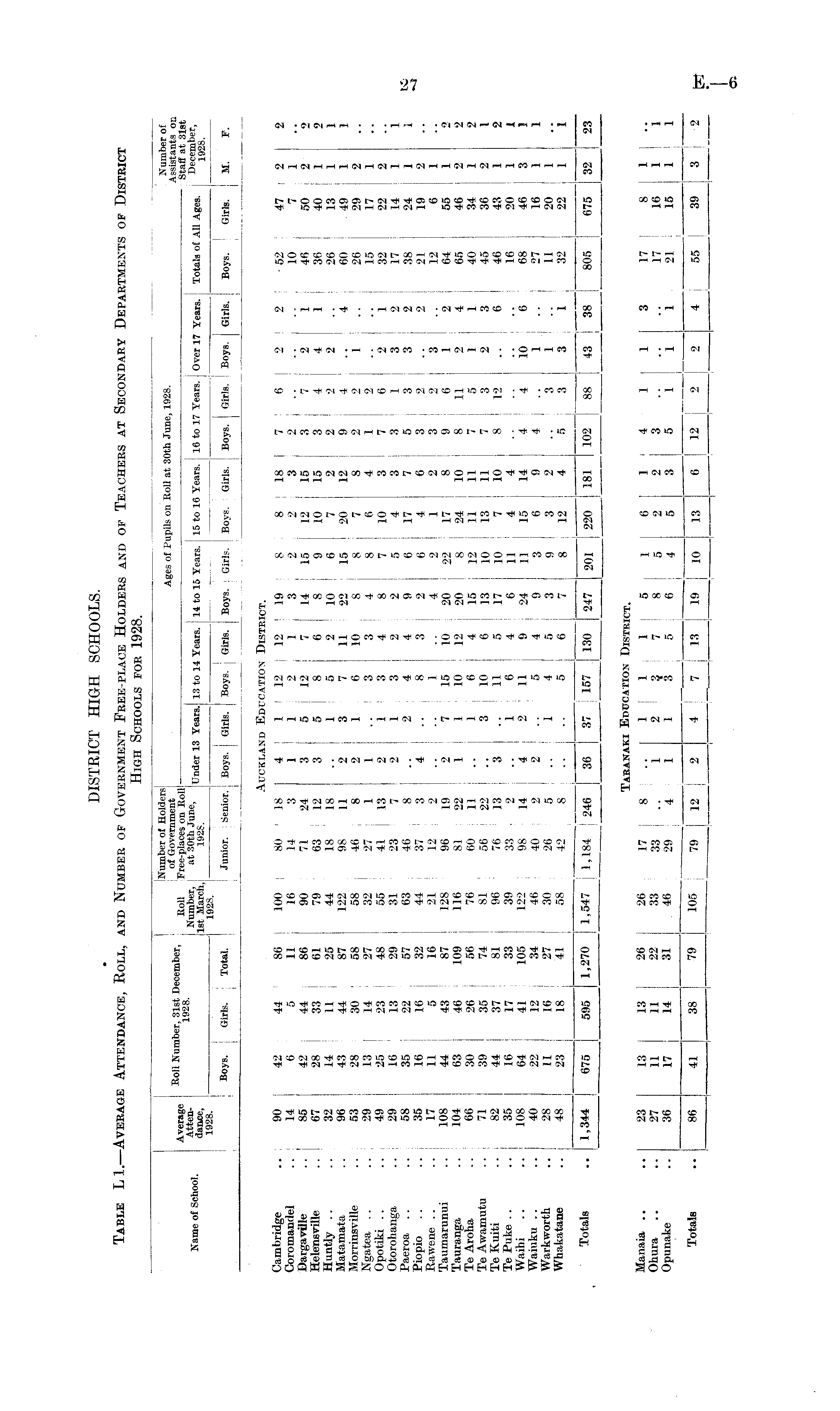 DISTRICT HIGH SCHOOLS. Table L1.—Average Attendance, Roll, and Number of Government Free-place Holders and of Teachers at Secondary Departments of District High Schools for 1928.