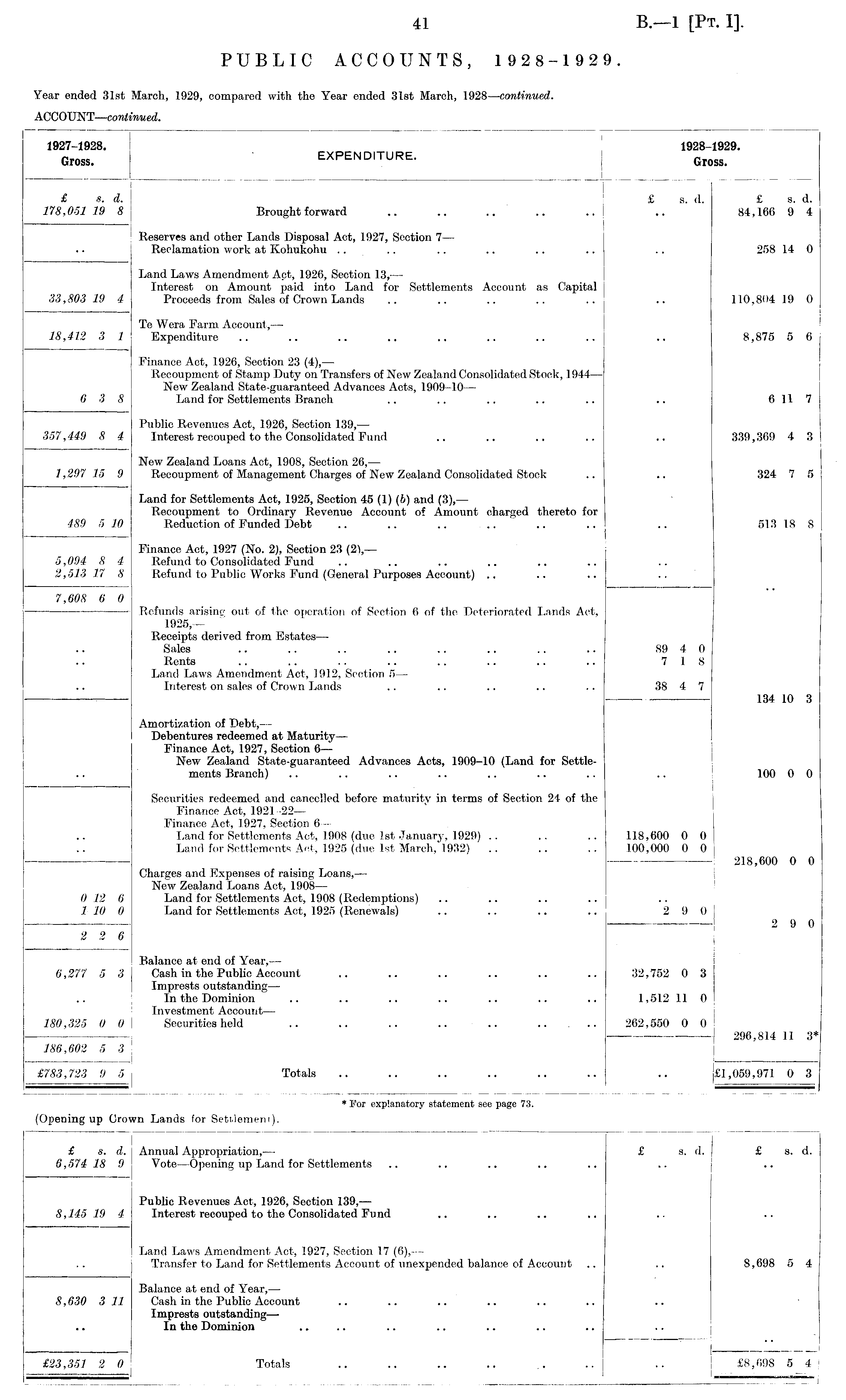 ACCOUNT—continued. 1927-1928. 1928-1929. Gross. EXPENDITURE. Gross> _ . I | £ s. d. £ s. d. £ s. d. 178,051 19 8 Brought forward .. .. .. .. .. .. 84,166 9 4 Reserves and other Lands Disposal Act, 1927, Section 7— Reclamation work at Kohukohu .. .. .. .. .. .. .. 258 14 0 Land Laws Amendment Apt, 1926, Section 13, — Interest on Amount paid into Land for Settlements Account as Capital 33,803 19 4 Proceeds from Sales of Crown Lands .. .. .. .. .. .. 110,804 19 0 Te Wera Farm Account , — 18,412 3 1 Expenditure .. .. .. .. .. .. .. .. .. 8,875 5 6 Finance Act, 1926, Section 23 (4), — Recoupment of Stamp Duty on Transfers of New Zealand Consolidated Stock, 1944 — New Zealand State-guaranteed Advances Acts, 1909-10 — 6 3 8 Land for Settlements Branch .. .. .. .. .. .. 6117 Public Revenues Act, 1926, Section 139, — 357,449 8 4 Interest recouped to the Consolidated Fund .. .. .. .. .. 339,369 4 3 | New Zealand Loans Act, 1908, Section 26,— 1,297 15 9 Recoupment of Management Charges of New Zealand Consolidated Stock .. .. 324 7 5 Land for Settlements Act, 1925, Section 45 (1) ( b) and (3),— Recoupment to Ordinary Revenue Account of Amount charged thereto for 489 5 10 Reduction of Funded Debt .. .. .. .. .. .. .. 513 18 8 I Finance Act, 1927 (No. 2), Section 23 (2), — 5,094 8 4 Refund to Consolidated Fund 2,513 17 8 Refund to Public Works Fund (General Purposes Account) .. 7,608 6 0 Refunds arisine out of the operation of Section 6 of the Deteriorated Lands Act, 1925,Receipts derived from Estates— Sales .. .. .. .. .. .. .. .. 89 4 0 Rents .. .. .. .. .. .. .. .. 718 Land Laws Amendment Act, 1912, Section 5— Interest on sales of Crown Lands .. .. .. .. .. 38 4 7 — 134 10 3 Amortization of Debt, — Debentures redeemed at Maturity— Finance Act, 1927, Section 6 — New Zealand State-guaranteed Advances Acts, 1909-10 (Land for Settlements Branch) .. .. .. .. .. .. .. .. 100 0 0 Securities redeemed and cancelled before maturity in terms of Section 24 of the Finance Act, 1921-22 — Finance Act, 1927, Section 6•— Land for Settlements Act, 1908 (due 1st January, 1929) .. .. .. 118,600 0 0 Land for Settlements Act, 1925 (due 1st March, 1932) .. .. .. 100,000 0 0 218,600 0 0 Charges and Expenses of raising Loans, — New Zealand Loans Act, 1908 — 0 12 6 Land for Settlements Act, 1908 (Redemptions) 1 10 0 Land for Settlements Act, 1925 (Renewals) .. .. .. .. 2901 2 9 0 2 2 6 Balance at end of Year, — 6,277 5 3 Cash in the Public Account .. .. .. .. .. .. 32,752 0 3 Imprests outstanding—■ In the Dominion .. .. .. .. .. .. .. 1,512 11 0 Investment Account— 180,325 0 0 Securities held .. .. .. .. .. .. .. 262,550 0 0 296,814 11 3* 186,602 5 3 £783,723 9 5 | Totals .. .. .. .. .. .. .. £1,059,971 0 3 * For explanatory statement see page 73. (Opening up Crown Lands for Settlement). £ s. d. Annual Appropriation,— £ s. d. £ s. d. 6,574 18 9 Vote—Opening up Land for Settlements Public Revenues Act, 1926, Section 139, — 8,145 19 4 Interest recouped to the Consolidated Fund Land Laws Amendment Act, 1927, Section 17 (6),-— Transfer to Land for Settlements Account of unexpended balance of Account .. .. 8,698 5 4 Balance at end of Year, —- 8,630 3 11 Cash in the Public Account Imprests outstanding— In the Dominion £23,351 2 0 Totals .. .. .. .. .. .. .. £8,698 5 4