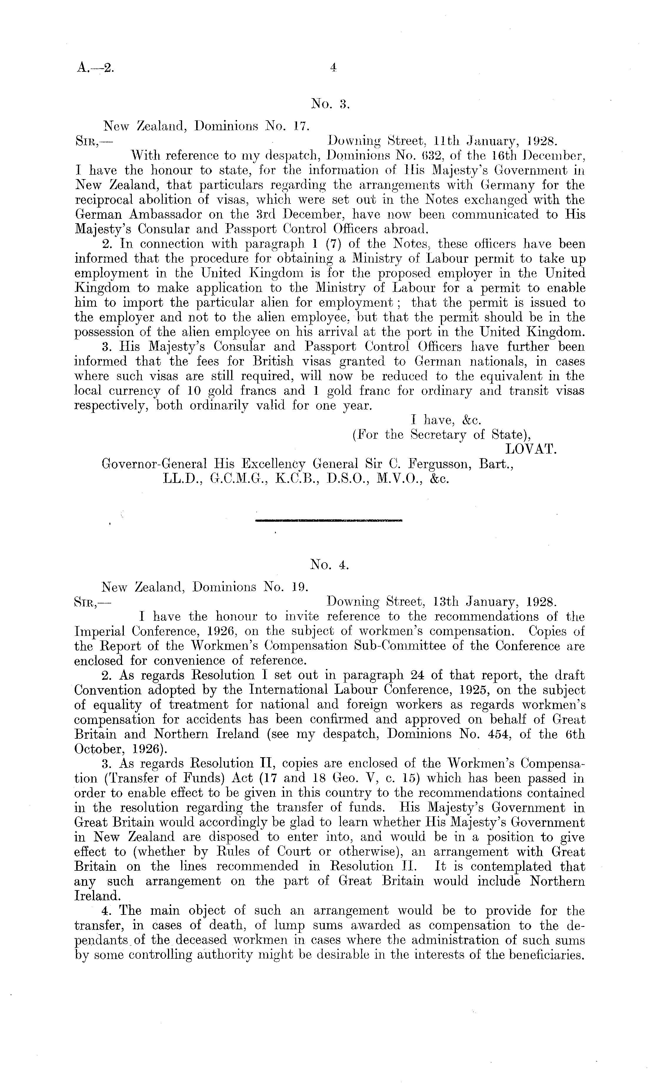 No. 3. New Zealand, Dominions No. 17. Sir,— Downing Street, 11th January, 1928. With reference to my despatch, Dominions No. 632, of the 16tli December, I have the honour to state, for the information of His Majesty's Government in New Zealand, that particulars regarding the arrangements with Germany for the reciprocal abolition of visas, which were set out in the Notes exchanged with the German Ambassador on the 3rd December, have now been communicated to His Majesty's Consular and Passport Control Officers abroad. 2. In connection with paragraph 1 (7) of the Notes, these officers have been informed that the procedure for obtaining a Ministry of Labour permit to take up employment in the United Kingdom is for the proposed employer in the United Kingdom to make application to the Ministry of Labour for a permit to enable him to import the particular alien for employment; that the permit is issued to the employer and not to the alien employee, but that the permit should be in the possession of the alien employee on his arrival at the port in the United Kingdom. 3. His Majesty's Consular and Passport Control Officers have further been informed that the fees for British visas granted to German nationals, in cases where such visas are still required, will now be reduced to the equivalent in the local currency of 10 gold francs and 1 gold franc for ordinary and transit visas respectively, both ordinarily valid for one year. I have, &c. (For the Secretary of State), LOYAT. Governor-General His Excellency General Sir C. Fergusson, Bart., LL.D., G.C.M.G., K.C.8., D.5.0., M.V.0., &c.