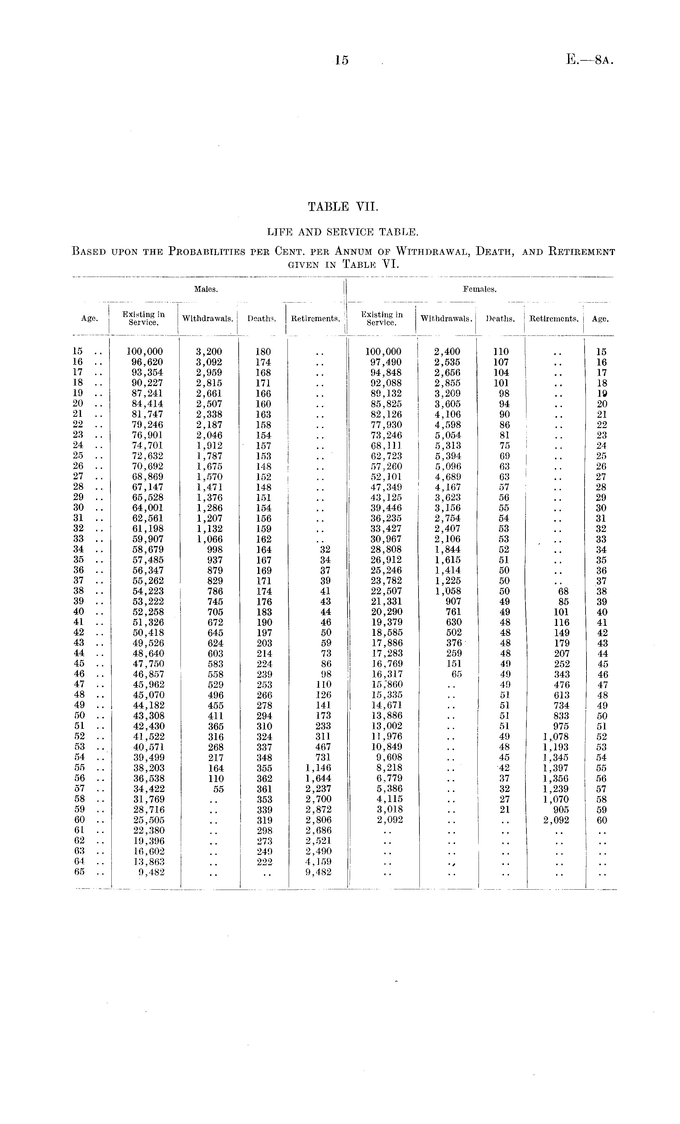 TABLE VII. LIFE AND SERVICE TABLE. Based upon the Probabilities per Cent. per Annum of Withdrawal, Death, and Retirement given in Table VI.