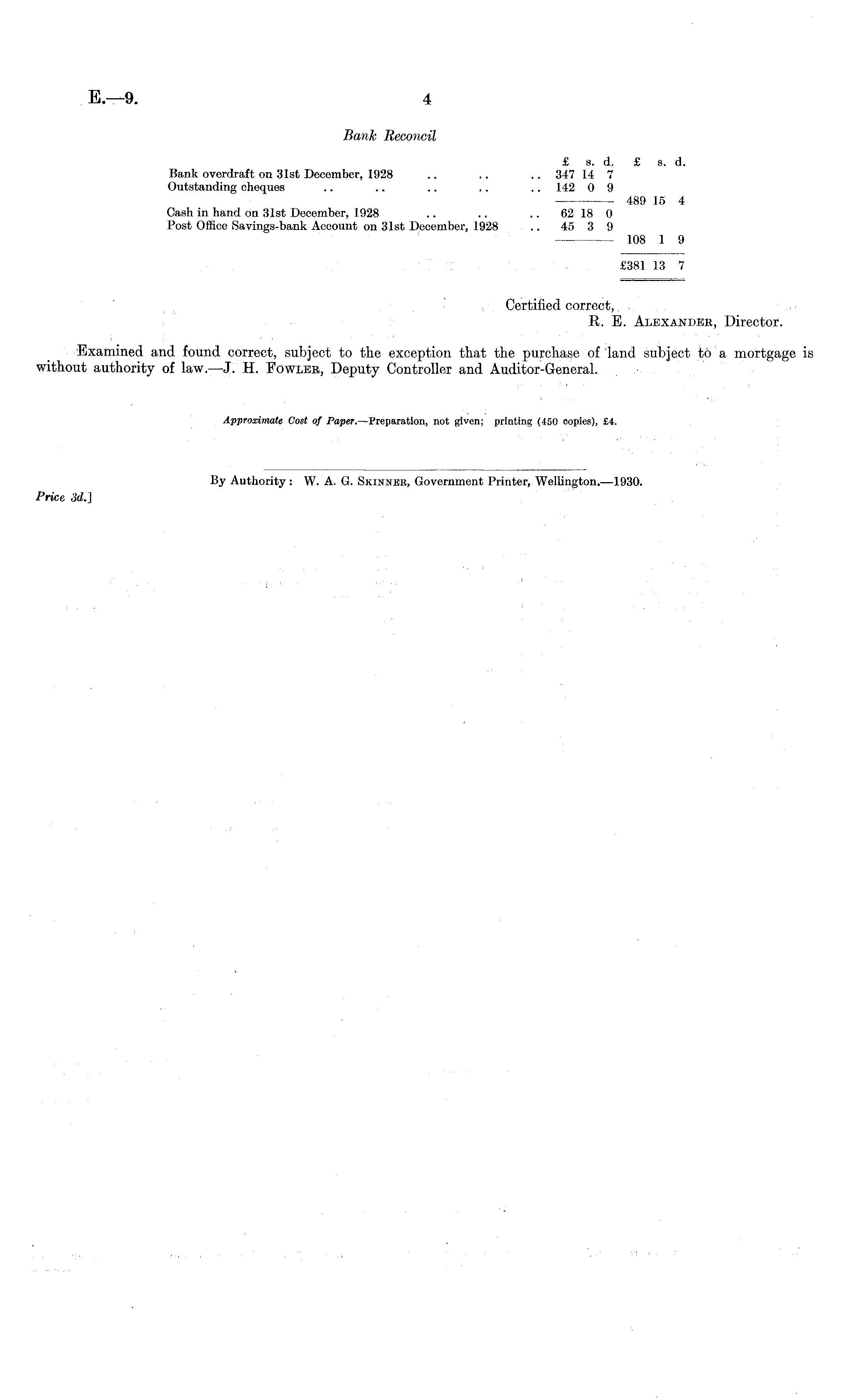 Bank Reconcil £ s. d. £ s. d. Bank overdraft on 31st December, 1928 .. .. .. 347 14 7 Outstanding cheques .. .. .. .. .. 142 0 9 489 15 4 Cash in hand on 31st December, 1928 .. .. .. 62 18 0 Post Office Savings-bank Account on 31st December, 1928 .. 45 3 9 108 1 9 £381 13 7 Certified correct,, R. E. Alexander, Director. Examined and found correct, subject to the exception that the purchase of land subject to a mortgage is without authority of law. —J. H. Fowler, Deputy Controller and Auditor-General.