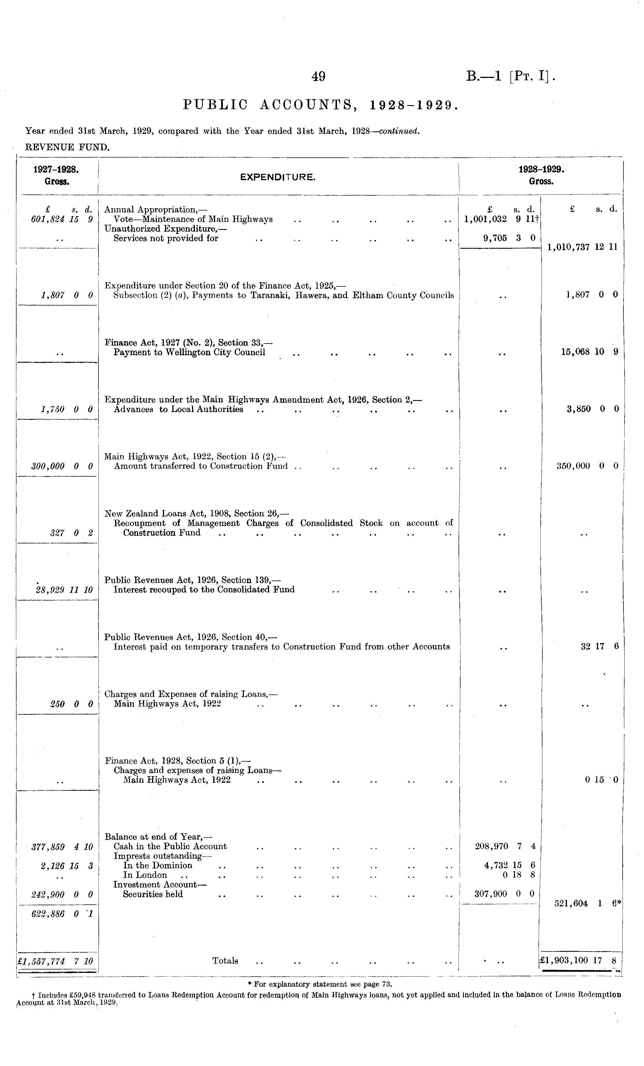 1927-1928. 1928-1929. Gross. EXPENDITURE. Gross . I 1 ; £ s. d. Annual Appropriation,— £ s. d. £ s. d. 601,824 15 9 Vote—Maintenance of Main Highways .. .. .. .. .. 1,001,032 9 llf Unauthorized Expenditure,— Services not provided for .. .. .. .. .. 9,705 3 0 1,010,737 12 11 Expenditure under Section 20 of the Finance Act, 1925, — 1,807 0 0 Subsection (2) (a), Payments to Taranaki, Hawera, and Eltham County Councils .. 1,807 0 0 Finance Act, 1927 (No. 2), Section 33, —- Payment to Wellington City Council .. .. .. .. .. .. 15,068 10 9 Expenditure under the Main Highways Amendment Act, 1926, Section 2, — 1,750 0 0 Advances to Local Authorities .. .. .. .. .. .. .. 3,850 0 0 Main Highways Act, 1922, Section 15 (2), — I 300,000 0 0 Amount transferred to Construction Fund .. .. .. .. .. .. 350,000 0 0 New Zealand Loans Act, 1908, Section 26, — Recoupment of Management Charges of Consolidated Stock on account of 327 0 2 Construction Fund Public Revenues Act, 1926, Section 139, — 28,929 11 10 Interest recouped to the Consolidated Fund .. .. .. Public Revenues Act, 1926, Section 40, — Interest paid on temporary transfers to Construction Fund from other Accounts .. 32 17 6 Charges and Expenses of raising Loans, — 250 0 0 Main Highways Act, 1922 I Finance Act, 1928, Section 5 (1), —• Charges and expenses of raising Loans — Main Highways Act, 1922 .. .. .. .. .. .. | .. 0 15 0 Balance at end of Year, — 377,859 4 10 Cash in the Public Account .. .. .. .. .. .. 208,970 7 4 Imprests outstanding— 2,126 15 3 in the Dominion .. .. .. .. .. .. .. 4,732 15 6 In London .. .. .. .. .. .. .. .. 0 18 8 Investment Account— 242,900 0 0 Securities held .. .. .. .. .. .. 1 307,900 0 0 521,604 1 6* 622,886 0 1 £1,557,774 7 10 Totals .. .. .. .. .. .. • .. £1,903,100 17 8 * For explanatory statement see page 73. f Includes £59,948 transferred to Loans Redemption Account for redemption of Main Highways loans, not yet applied and included in the balance of Loans Redemption Account at 31st March, 1929.
