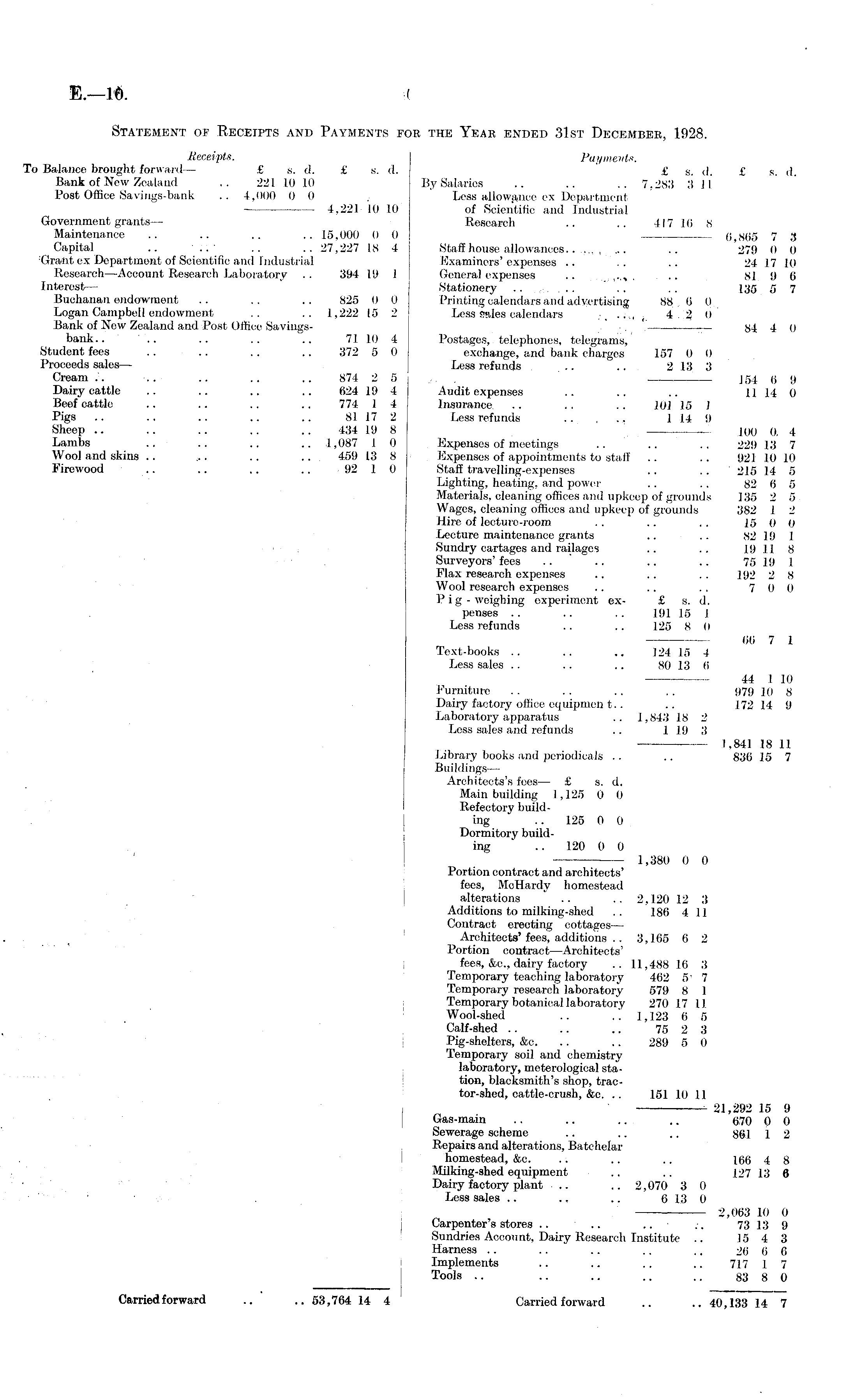 Statement of Receipts and Payments for the Year ended 31st December, 1928. Receipts. Payments. To Balance brought forward— £ s. d. £ s. d. ' £ s . d. £ s. d. Bank of New Zealand .. 221 10 10 B.y Salaries .. .. .. 7.2811 311 Post Office Savings-bank .. 4,000 0 0 . Less allowance ex Department 4,221 10 10 of Scientific and Industrial Government grants— Research .. .. 417 1(5 8 Maintenance .. .. .. .. 15,000 0 0 0,865 7 3 Capital .. .. .. 27,227 18 4 Staff house allowances ( , .. 279 0 0 : Graht ex Department of Scientific and Industrial Examiners'expenses .. '.. .. 24 17 10 Research—Account Research Laboratory .. 394 19 1 General expenses .. .. 81 9 6 Interest— Stationery .. .. ... .. .. 135 5 7 Buchanan endowment .. .. .. 825 0 0 Printing calendars and advertising 88.6.0, Logan Campbell endowment .. .. 1,222 15 2 Less sales calendars • ■ ~ 4 2 0 Bank of New Zealand and Post Office Savings- — yj. 4(j bank.. ~ .. .. .. 71 10 4 Postages, telephones, telegrams, Student fees .. .. .. .. 372 5 0 exchange, and bank charges 157 0 0 Proceeds sales— Less refunds .. .. 2 13 3 Cream /. •.. .. .. .. 874 2 5 ~ 154 (j y Dairy cattle .. .. .. .. 624 19 4 Audit expenses .. .. .. 11 14 0 Beef cattle .. .. .. .. 774 1 4 Insurance. .. .. .. 101 15 1 Pigs .. .. .. .. .. 81 17 2 Less refunds .. , ... 1 .14 9 Sheep .. . . .. .. .. 434 19 8 — 100 0, 4 Lambs .. .. .. .. 1,087 1 0 Expenses of meetings .. .. .. 229 13 7 Wool and skins .. . .. .. 4.59 13 8 Expenses of appointments to staff .. .. 921 10 10 Firewood .. .. .. .. 92 1 0 Staff travelling-expenses .. .. 215 14 5 Lighting, heating, and power .. .. 82 6 5 Materials, cleaning offices and upkeep of grounds 135 2 5 Wages, cleaning offices and upkeep of grounds 382 1 2 Hire of lecture-room .. .. .. 15 0 0 Lecture maintenance grants .. .. 82 19 1 Sundry cartages and railages .. .. 19 11 8 Surveyors' fees .. .. .. .. 75 19 1 Flax research expenses .. .. . . 192 2 8 Wool research expenses .. .. .. 7 0 0 Pig-weighing experiment ex- £ s. d. penses .. .. .. 191 15 1 Less refunds .. .. 125 8 0 66 7 1 Text-books .. .. .. 124 15 4 Less sales .. .. .. 80 13 6 44 110 Furniture . . .. .. .. 979 10 8 Dairy factory office equipment.. .. 172 14 9 Laboratory apparatus .. 1,843 18 2 Less sales and refunds .. 1 19 3 1,841 18 11 Library books and periodicals .. .. 836 15 7 Buildings— Architects's fees — £ s. d. Main building 1,125 0 0 Refectory building .. 125 0 0 Dormitory building .. 120 0 0 1,380 0 0 Portion contract and architects' fees, MeHardy homestead alterations .. .. 2,120 12 3 Additions to milking-shed .. 186 411 Contract erecting cottages— Architects'fees, additions .. 3,165 6 2 Portion contract—Architects' fees, &c., dairy factory .. 11,488 16 3 Temporary teaching laboratory 462 5' 7 Temporary research laboratory 579 8 1 Temporary botanical laboratory 270 17 11 Wool-shed .. .. 1,123 6 5 Calf-shed .. .. .. 75 2 3 Pig-shelters, &c. .. .. 289 5 0 Temporary soil and chemistry laboratory, meterological station, blacksmith's shop, trac-tor-shed, cattle-crush, &c. .. 151 10 11 21,292 15 9 Gas-main ~ .. .. .. 670 0 0 Sewerage scheme .. .. .. 861 1 2 Repairs and alterations, Batchelar homestead, &e. .. .. .. 166 4 8 Milking-shed equipment .. .. 127 13 6 Dairy factory plant .. .. 2,070 3 0 Less sales .. ~ .. 6 13 0 2,063 10 0 Carpenter's stores .. .. .. • 73 13 9 Sundries Account, Dairy Research Institute .. 15 4 3 Harness .. .. .. .. .. 26 6 6 Implements .. .. .. .. 717 1 7 Tools .. .. .. .. .. 83 8 0 Carried forward .. .. 53,764 14 4 Carried forward .. .. 40,133 14 7
