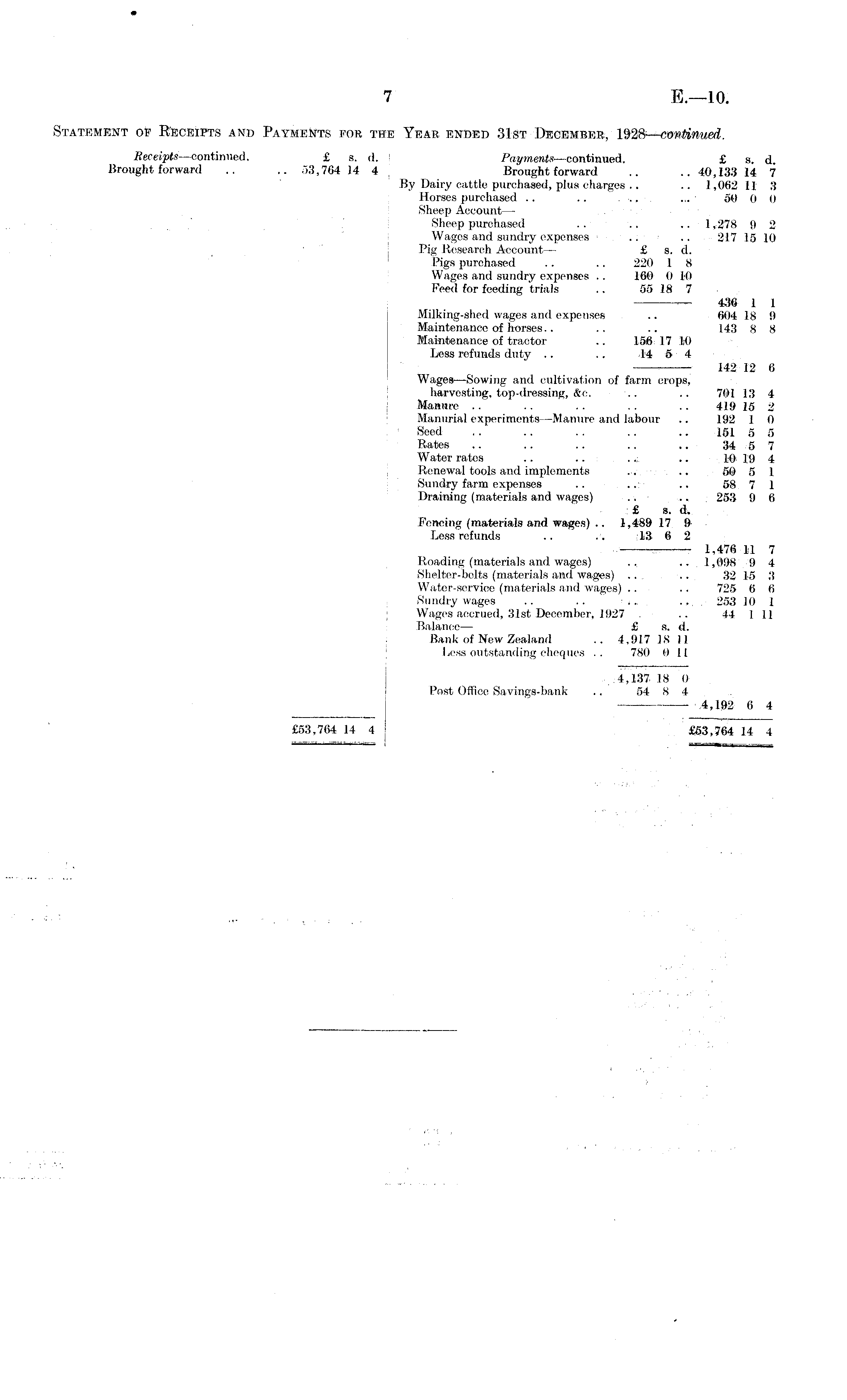 Statement of Receipts and Payments for the Year, ended 31st December, 1928- —continued. Receipts—continued. £ 3. d. Payments■— continued. £ s. d. Brought forward .. .. 53,764 14 4 Brought forward .. .. 40,133 14 7 By Dairy cattle purchased, plus charges .. .. 1,062 11 3 Horses purchased .. .. ~ ... 50 0 0 Sheep Account— Sheep purchased .. .. .. ] ~278 9 2 Wages and sundry expenses .. .. 217 15 10 Pig Research Account — £ s. d. Pigs purchased .. .. 220 1 8 Wages and sundry expenses .. 160 0 10 Feed for feeding trials .. 55 18 7 — 436 1 1 Milking-shed wages and expenses .. 604 18 9 Maintenance of horses.. .. .. 143 8 8 Maintenance of tractor .. .156 17 M) Less refunds duty .. .. 14 5 4 — 142 12 6 Wages—Sowing and cultivation of farm crops, harvesting, top-dressing, &c. .. 701 13 4 Manure .. .. .. .. .. 419 15 2 Manurial experiments—Manure and labour .. 192 1 0 Seed .. .. ... .. .. 151 5 5 Rates .. .. .. .. .. 34 5 7 Water rates .. .. ... .. I'o> 19 4 Renewal tools and implements ... .. 50 5 1 Sundry farm expenses .. .. .. 58 7 1 Draining (materials and wages) .. .. 253 9 6 £ s. d. Fencing (materials and wages) .. 1,489 17 9 Less refunds .. 13 6 2 — 1,476 11 7 Roading (materials and. wages) .. .. 1,098 9 4 Shelter-belts (materials and wages) .. .. 32 15 3 Water-service (materials and wages) .. .. 725 6 6 Sundry wages .. .. ... 253 10 1 Wages accrued, 31st December, 1927 .. 44 1 11 Balance— £ s. d. Bank of New Zealand .. 4,917 18 11 Less outstanding cheques .. 780 0 11 .4,137 18 (l Post Office Savings-bank .. 54 8 4 4,192 6 4 £53,764 14 4 £53,764 14 4