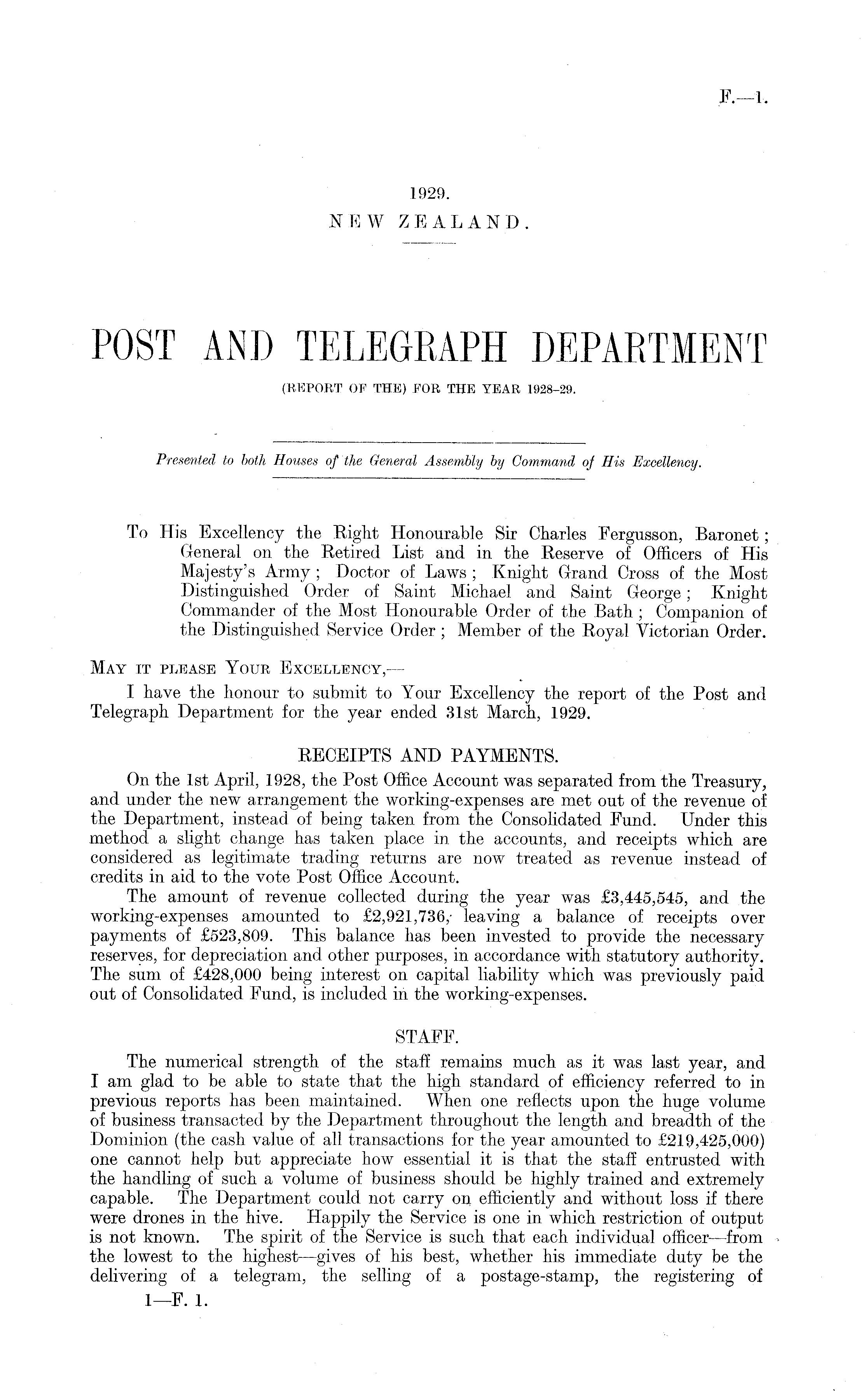 To His Excellency the Right Honourable Sir Charles Fergusson, Baronet; General on the Retired List and in the Reserve of Officers of His Majesty's Army ; Doctor of Laws ; Knight Grand Cross of the Most Distinguished Order of Saint Michael and Saint George; Knight Commander of the Most Honourable Order of the Bath ; Companion of the Distinguished Service Order ; Member of the Royal Victorian Order. May it please Your Excellency,— I have the honour to submit to Your Excellency the report of the Post and Telegraph Department for the year ended 31st March, 1929. RECEIPTS AND PAYMENTS. On the Ist April, 1928, the Post Office Account was separated from the Treasury, and under the new arrangement the working-expenses are met out of the revenue of the Department, instead of being taken from the Consolidated Fund. Under this method a slight change has taken place in the accounts, and receipts which are considered as legitimate trading returns are now treated as revenue instead of credits in aid to the vote Post Office Account. The amount of revenue collected during the year was £3,445,545, and the working-expenses amounted to £2,921,736,- leaving a balance of receipts over payments of £523,809. This balance has been invested to provide the necessary reserves, for depreciation and other purposes, in accordance with statutory authority. The sum of £428,000 being interest on capital liability which was previously paid out of Consolidated Fund, is included in the working-expenses. STAFF. The numerical strength of the staff remains much as it was last year, and I am glad to be able to state that the high standard of efficiency referred to in previous reports has been maintained. When one reflects upon the huge volume of business transacted by the Department throughout the length and breadth of the Dominion (the cash value of all transactions for the year amounted to £219,425,000) one cannot help but appreciate how essential it is that the staff entrusted with the handling of such a volume of business should be highly trained and extremely capable. The Department could not carry on efficiently and without loss if there were drones in the hive. Happily the Service is one in which restriction of output is not known. The spirit of the Service is such that each individual officer —from the lowest to the highest —gives of his best, whether his immediate duty be the delivering of a telegram, the selling of a postage-stamp, the registering of